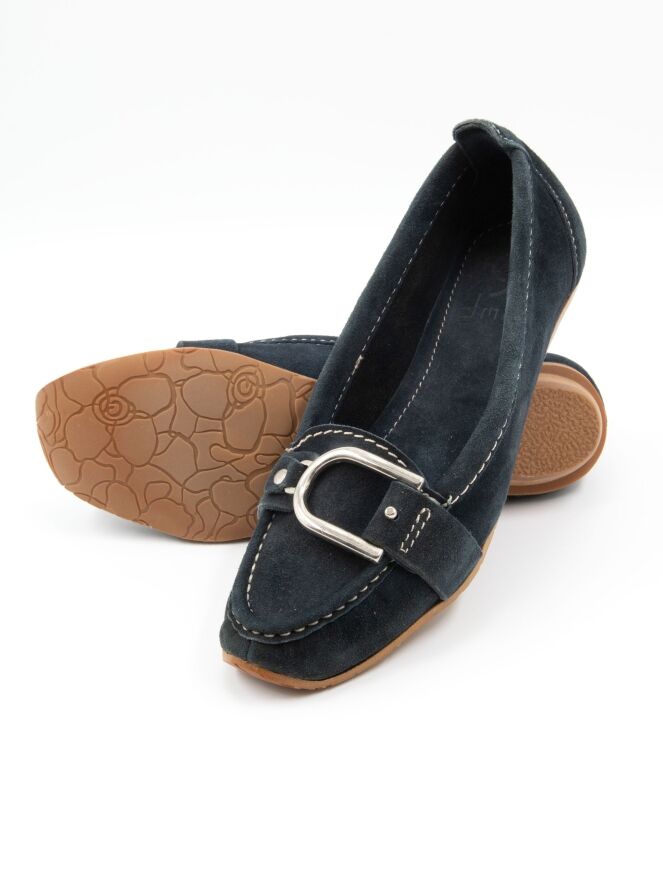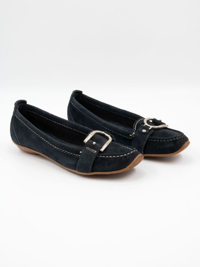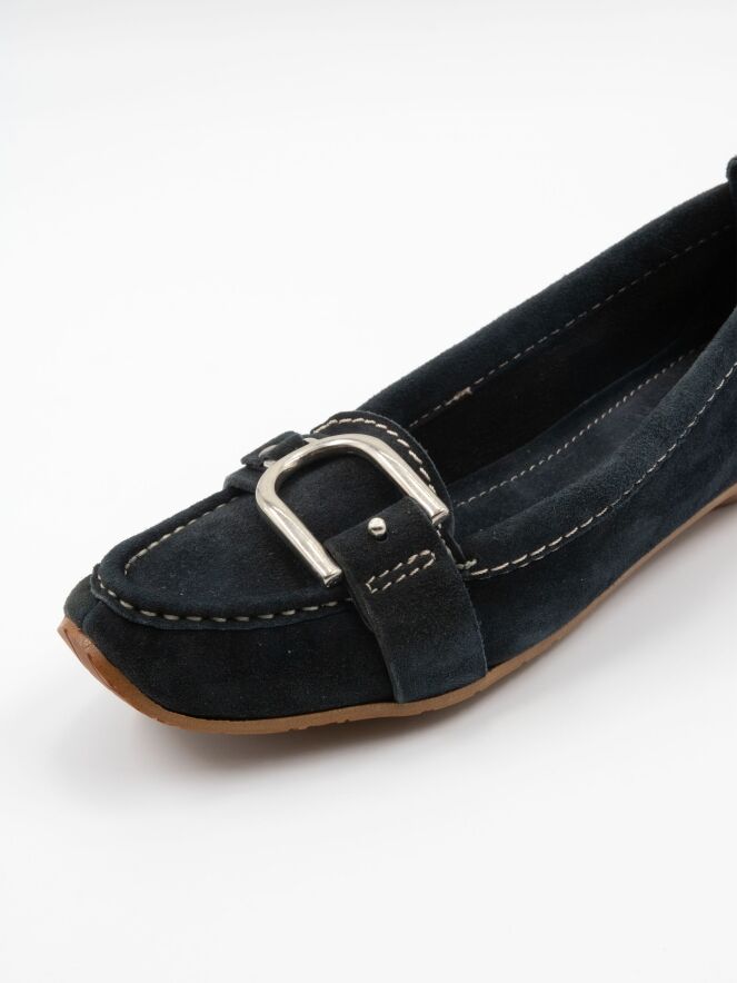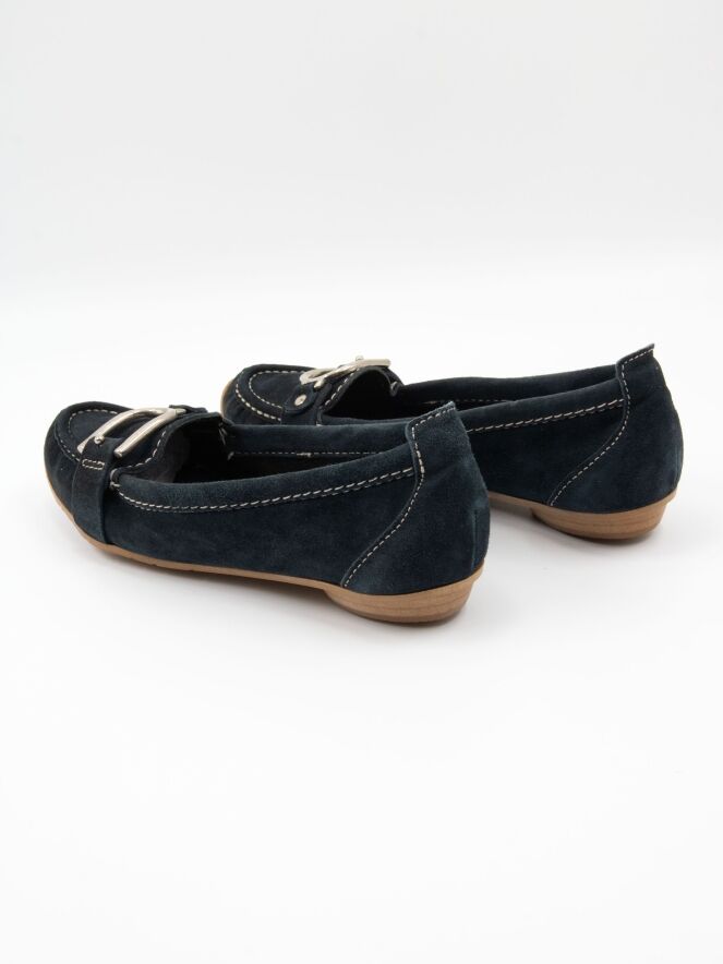 Un mocassin de DMN en bleu. Sur l'avant-pied, il y a une bande avec une boucle argentée. L'intérieur est non doublé.
