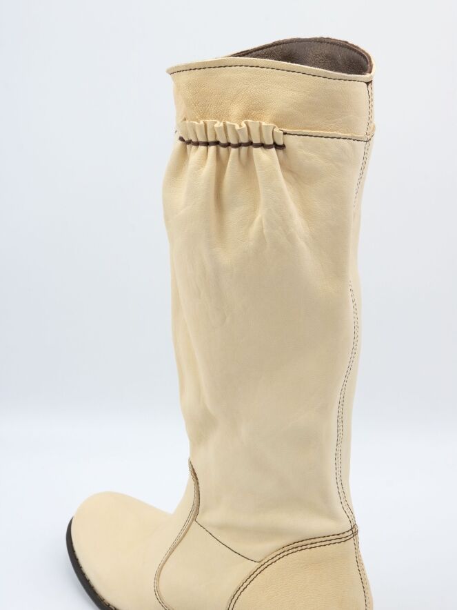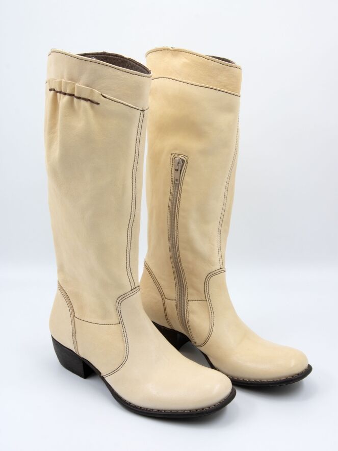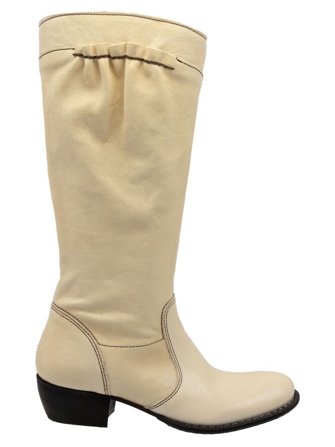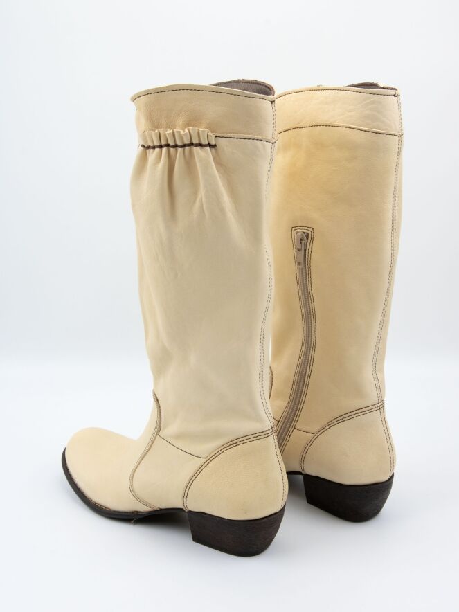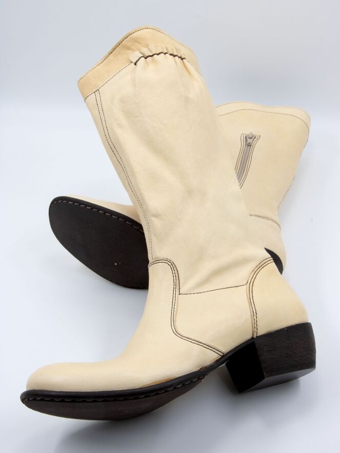 Une botte mi-haute de DMN en blanc crème. La botte est ornée de surpiqûres noires. En haut de la tige, le côté extérieur présente une bande de cuir finement plissé, finie par une couture noire. Sur le côté intérieur, une fermeture éclair monte jusqu’au mollet.