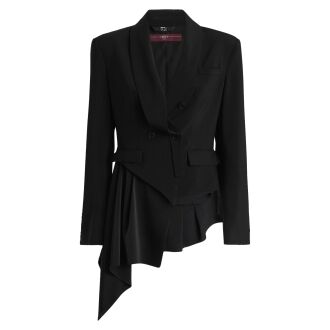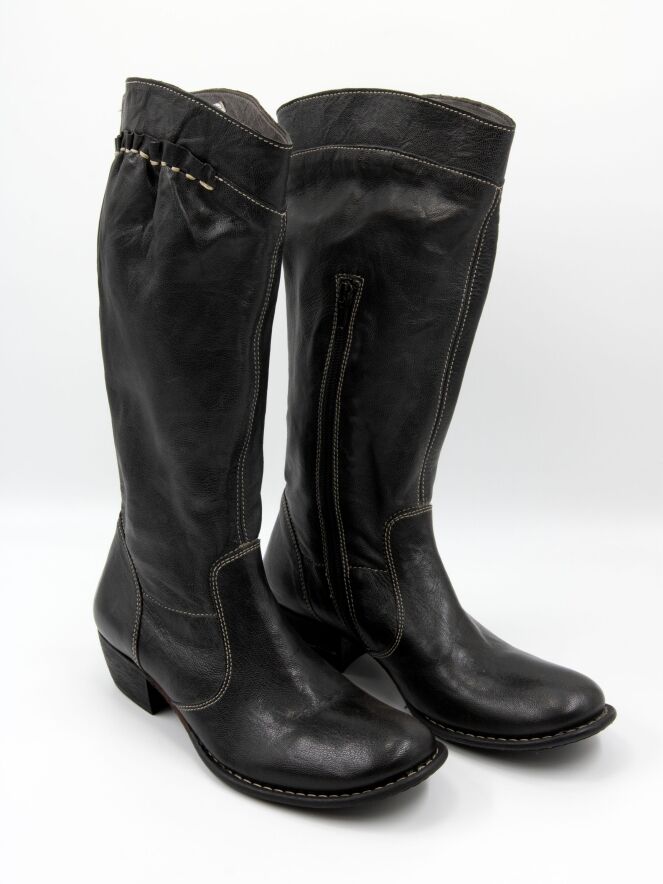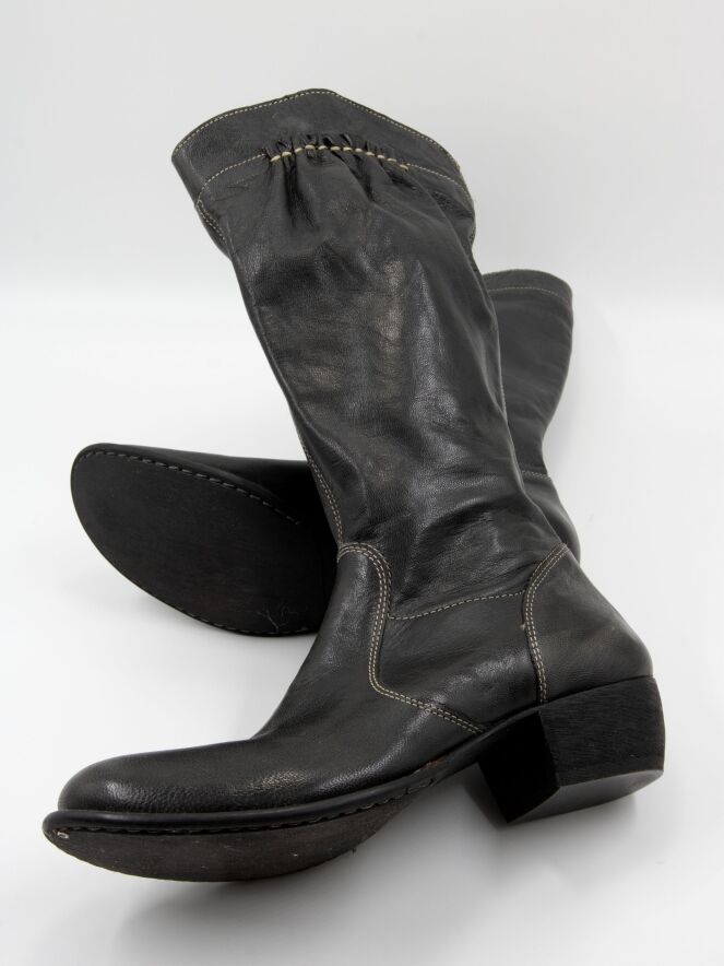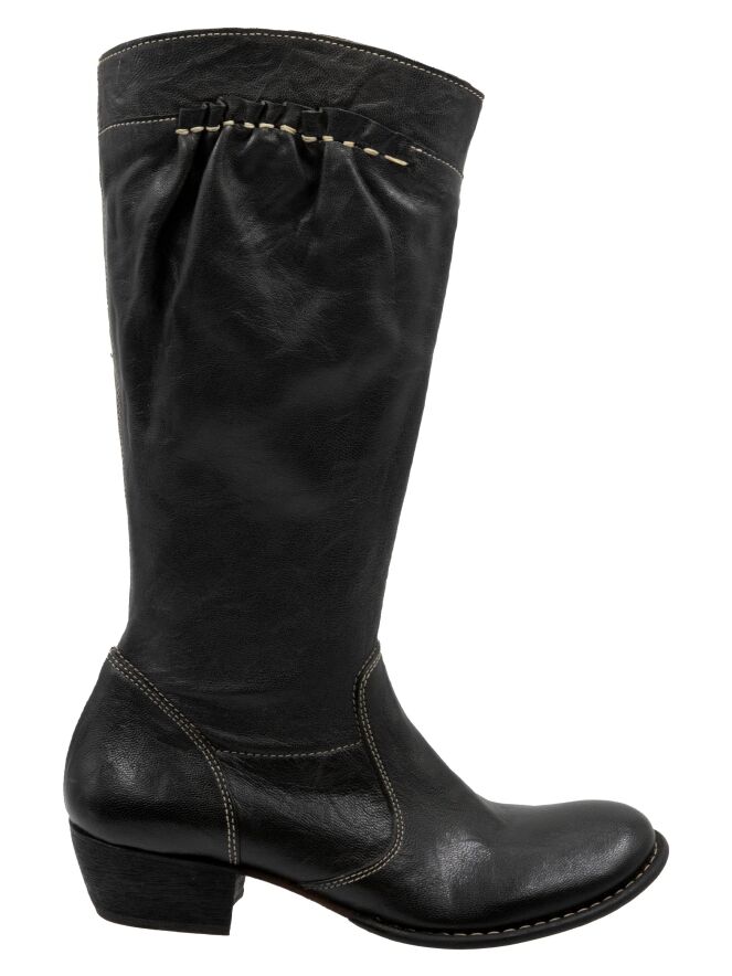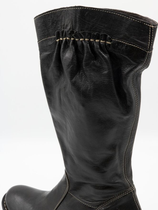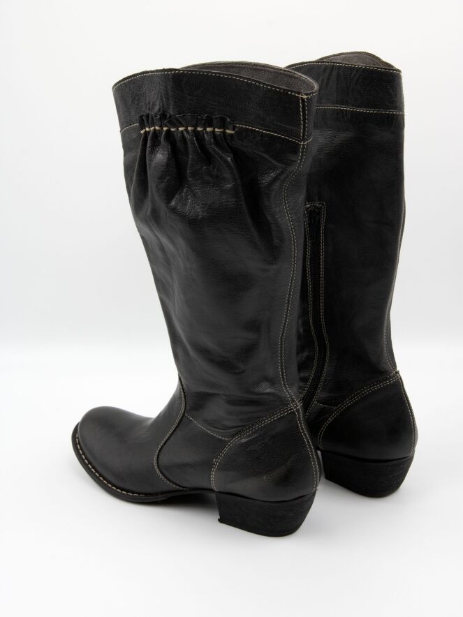 Une botte mi-haute de DMN en noir. La botte présente des surpiqûres blanches et, sur le haut de la tige à l’extérieur, une bande en cuir finement plissé, soulignée par une couture blanche. Sur le côté intérieur de la tige, une fermeture éclair monte jusqu’au mollet.