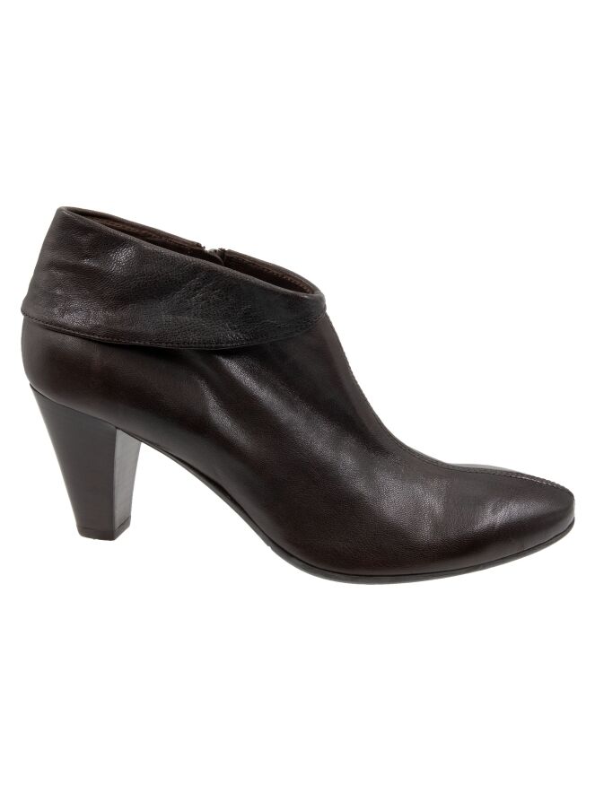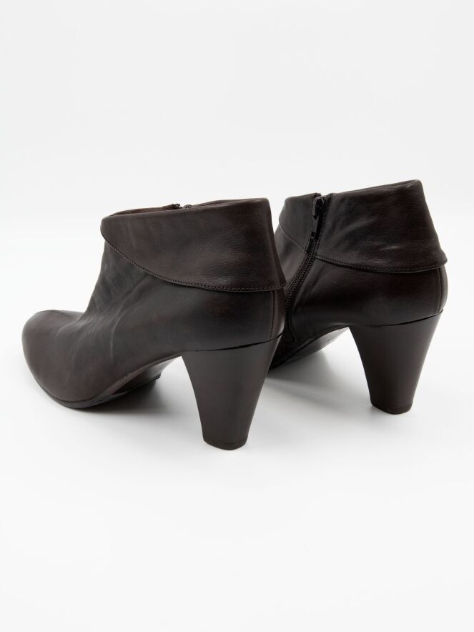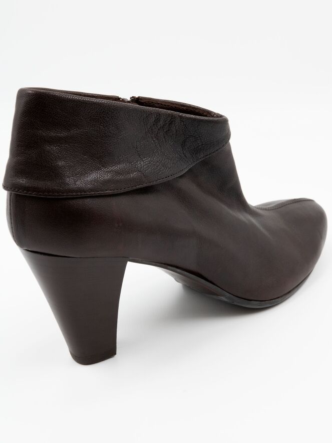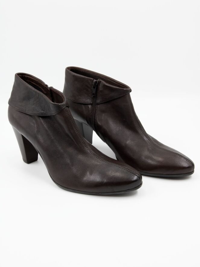Une bottine courte de Donna Carolina en couleur moka. Le bord supérieur de la tige est replié de façon décorative. Le talon est en bois foncé brun. L’intérieur est doublé de cuir.