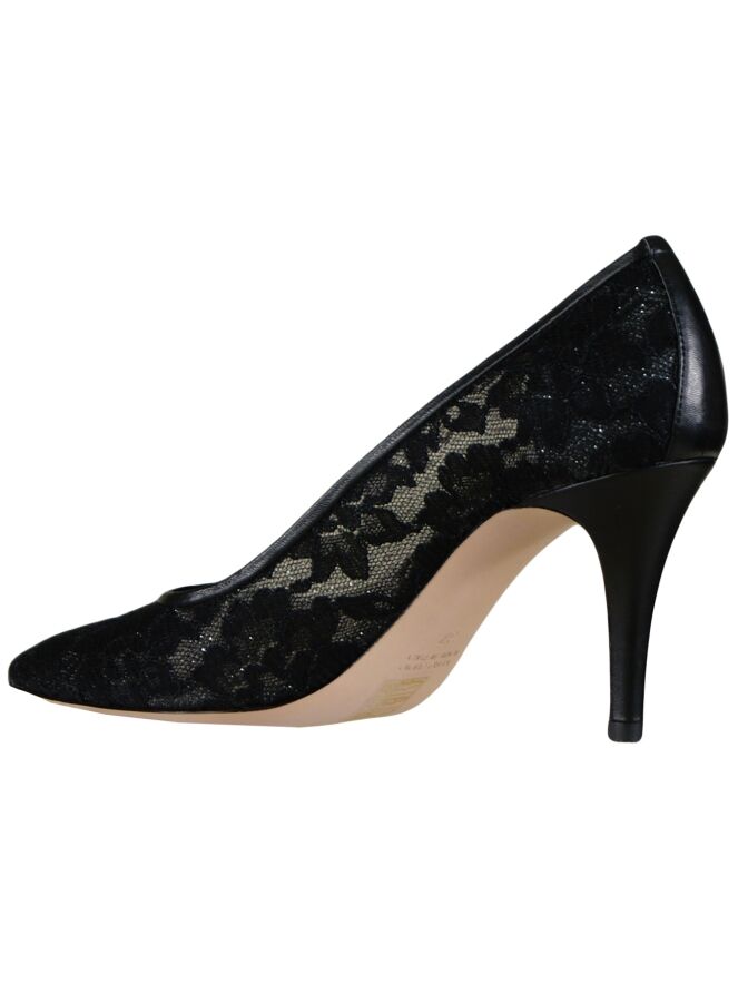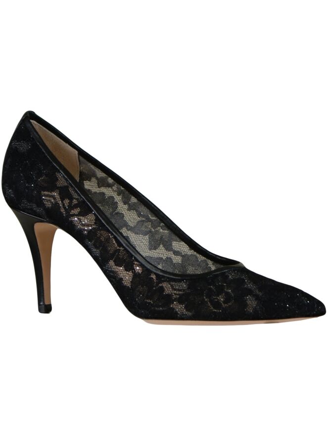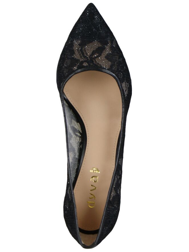 Très bel escarpin à hauts talons et nez pointu, de la marque Dyva, en dentelle noire tissée de fils d'argent. Une fine bande de cuir noir borde le pourtour de l'ouverture, descend le long de l'arrière du talon pour venir recouvrir le talon entier. Intérieur garni de cuir noir.