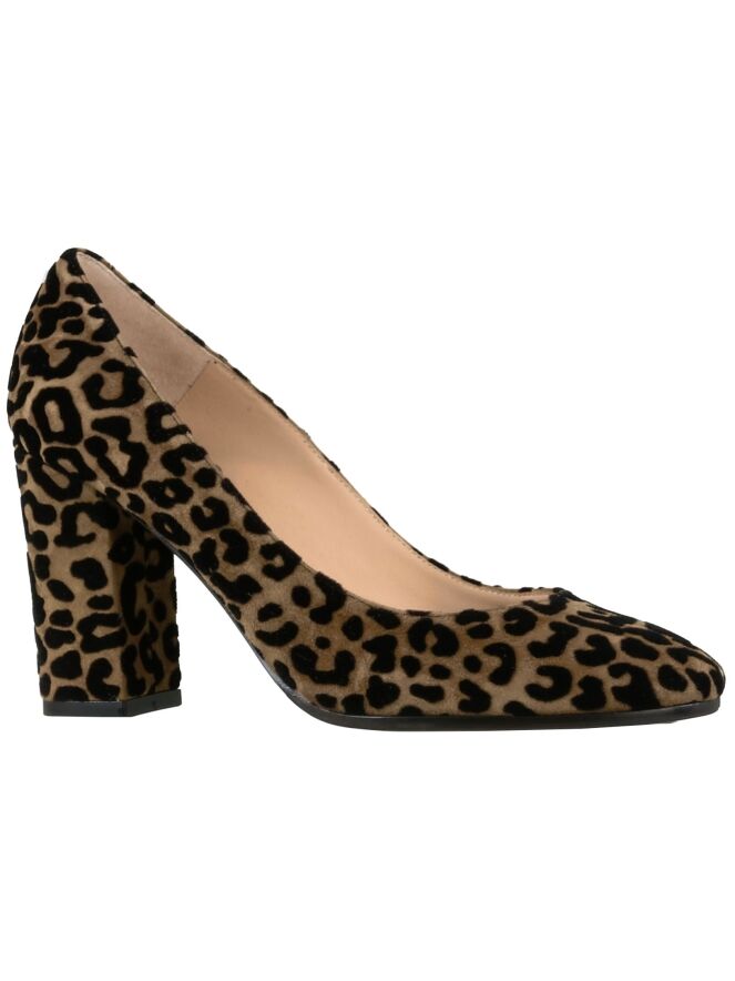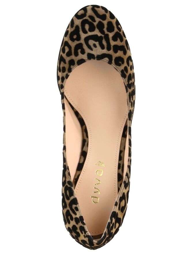 Escarpin en daim à nez rond, de la marque Dyva, imprimé d'un motif léopard cognac et noir. Son haut talon est recouvert comme la chaussure. L'intérieur est doublé de cuir.