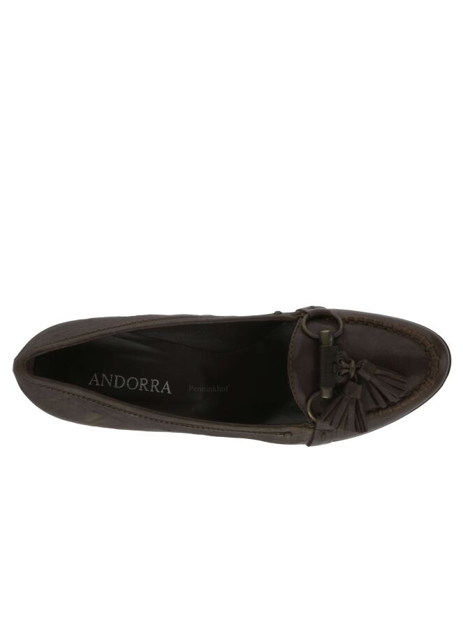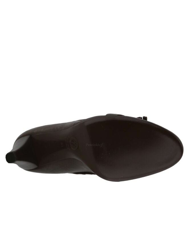Un escarpin de Dyva en marron moka. Le long du bord de l'avant-pied se trouve une couture inversée. Sur l'avant-pied, il y a un petit mors métallique avec deux pompons. Le talon effilé est de couleur brun foncé neutre. L'intérieur est doublé de cuir.