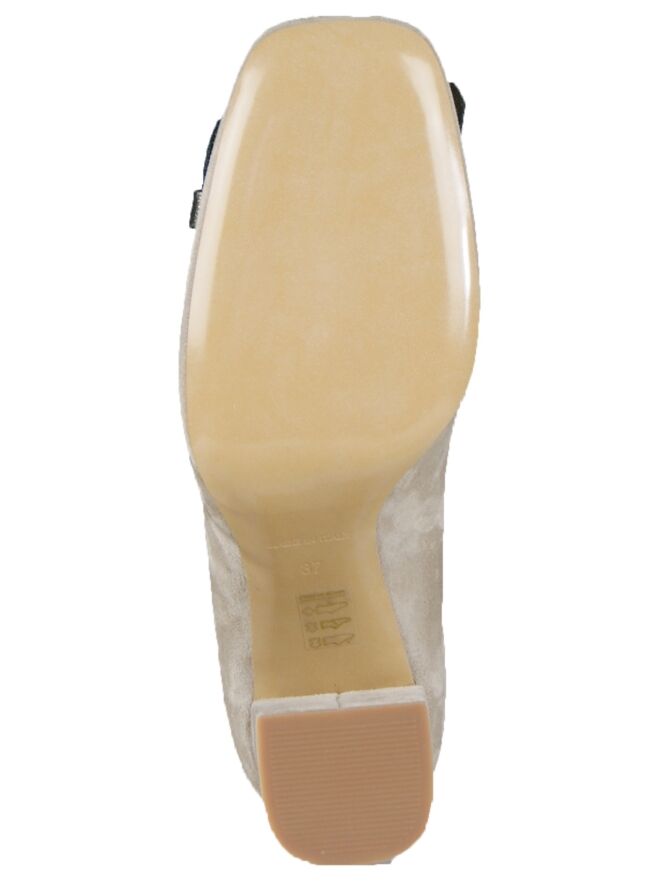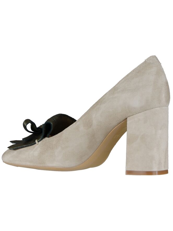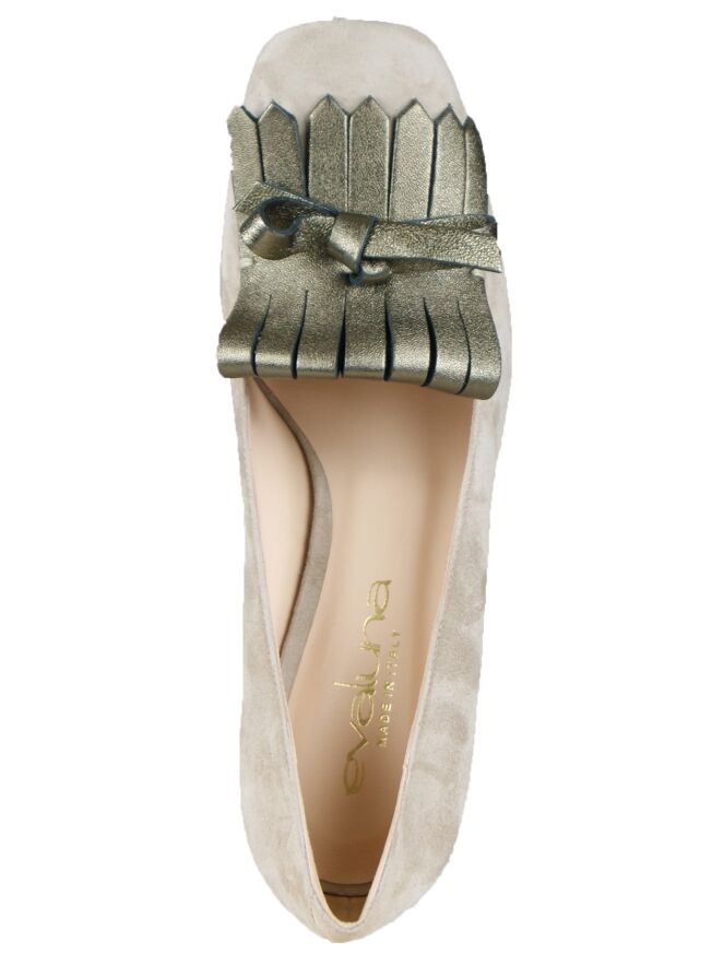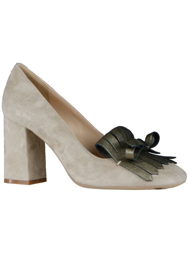 Escarpin en nubuck de couleur taupe, de la marque Evaluna. Le coup du pied est agrémenté d'une patte à franges couleur bronze superposée d'un nœud de même matière. Son talon carrée de 7 cm est recouvert du même cuir nubuck. Intérieur entièrement doublé cuir naturel.