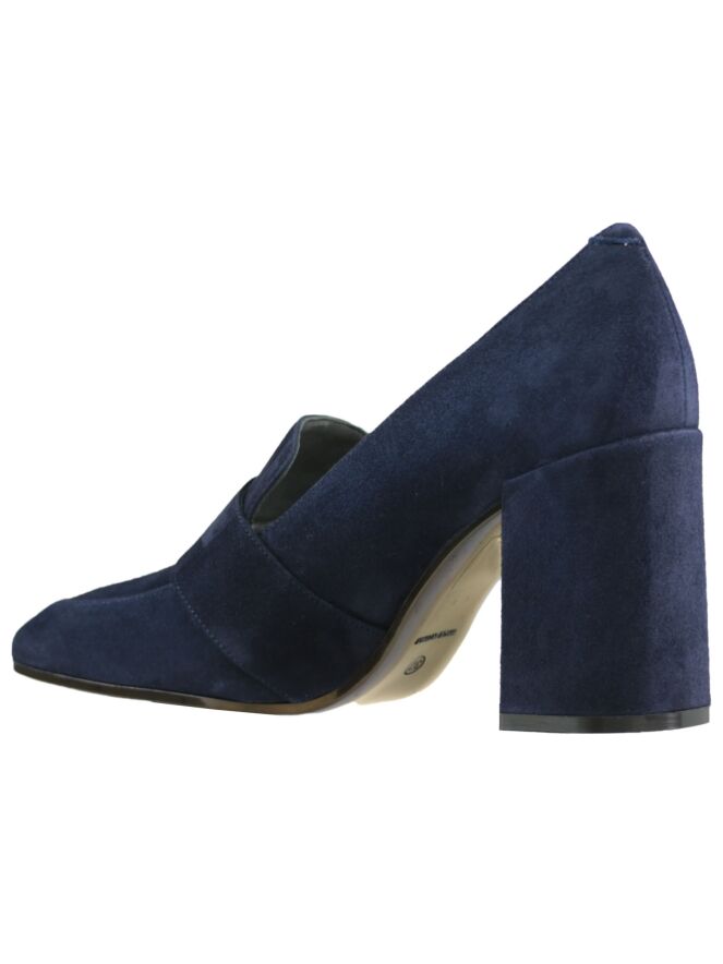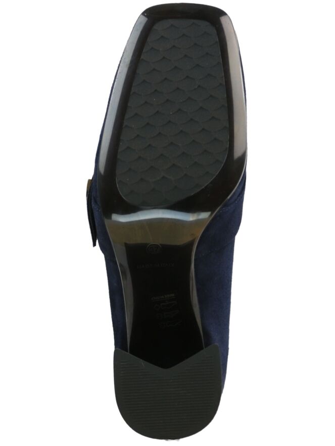 Escarpin en daim, de la marque Evaluna, couleur bleu marine. Une large bande avec une boucle en or décore l'avant-pied. Le talon est recouvert en daim. Intérieur doublé cuir.