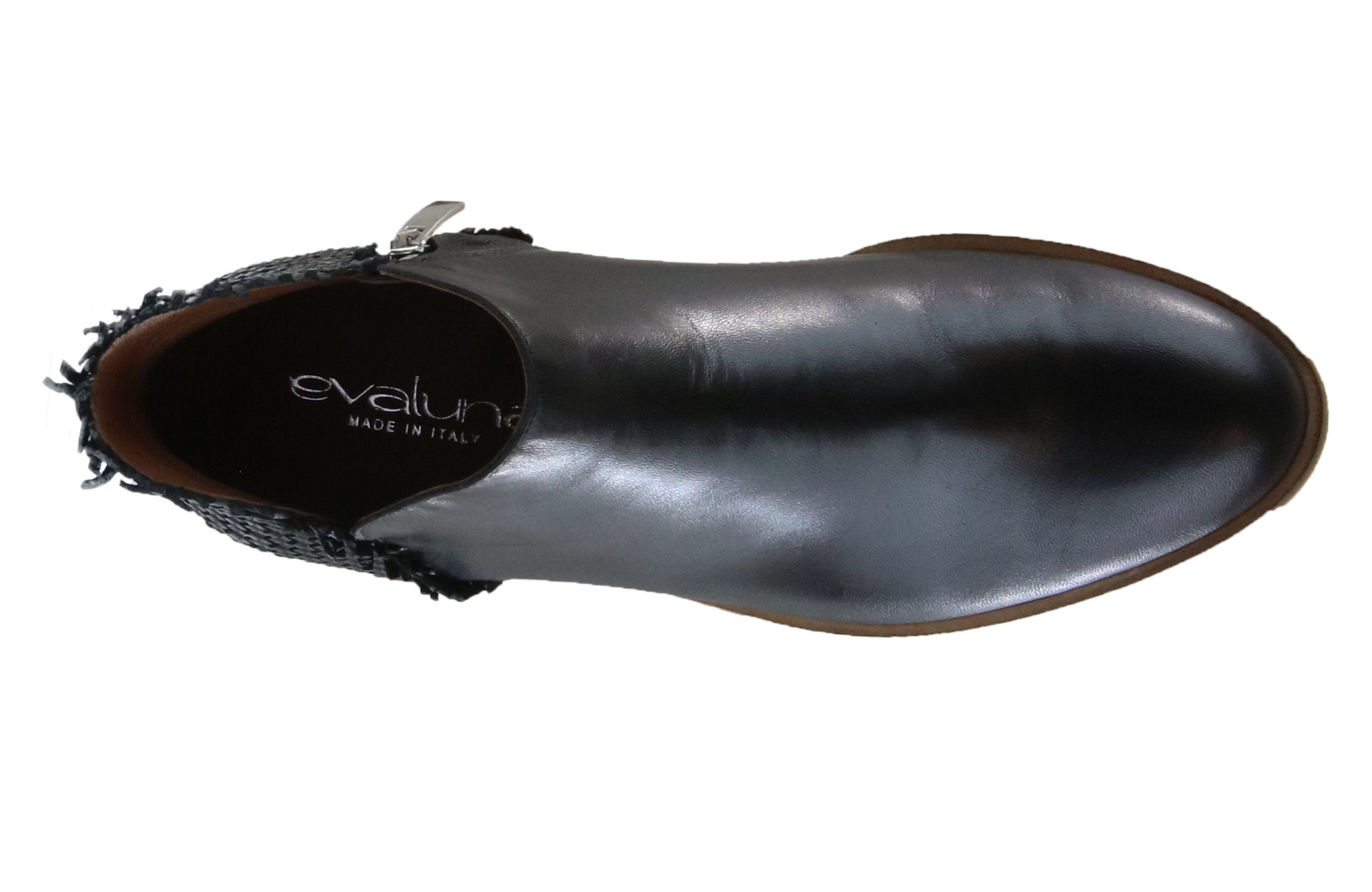 Botte courte de la marque Evaluna, de couleur noire. Le talon et les côtés sont en cuir tressé effiloché le long du bord de la tige. Le côté interne présente un court zip comme fermeture. Intérieur doublé de cuir