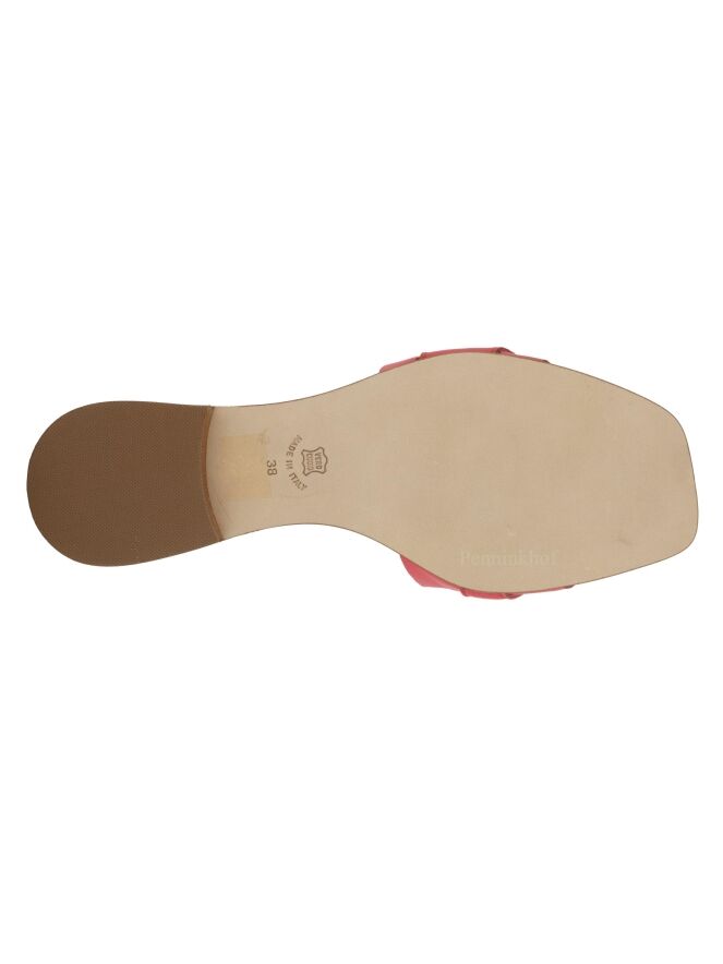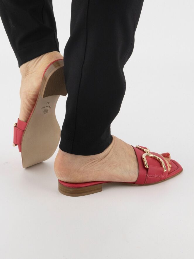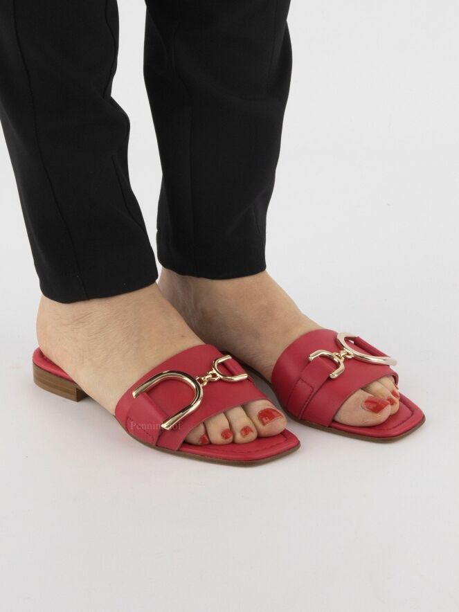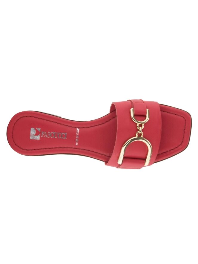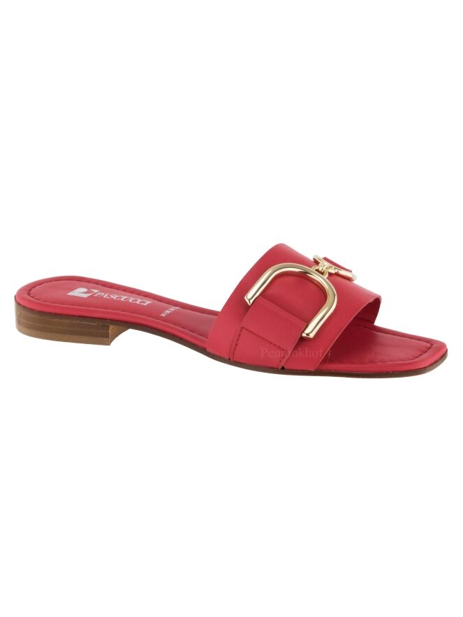 Sandale ouverte de la marque Even and Odd (Pascucci) en cuir rouge. L'avant-pied est orné d'un mors asymétrique doré. La semelle est en cuir noir.