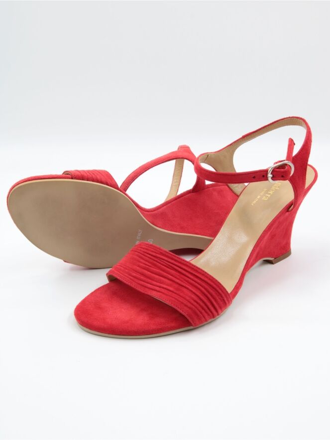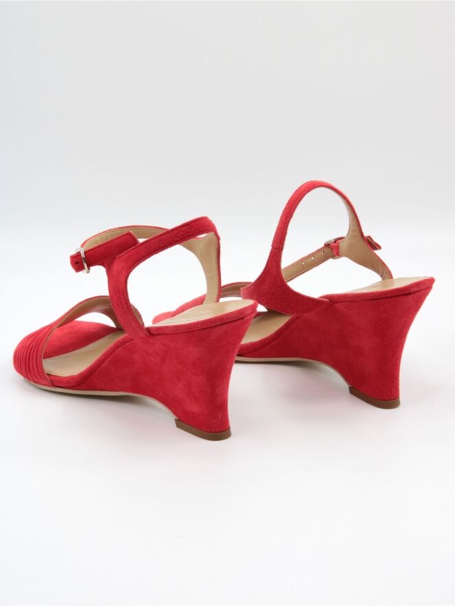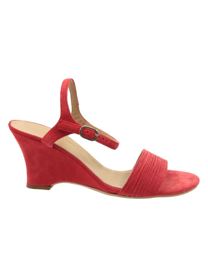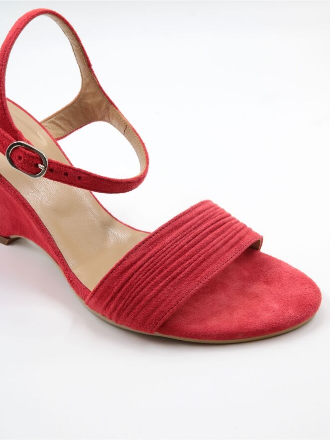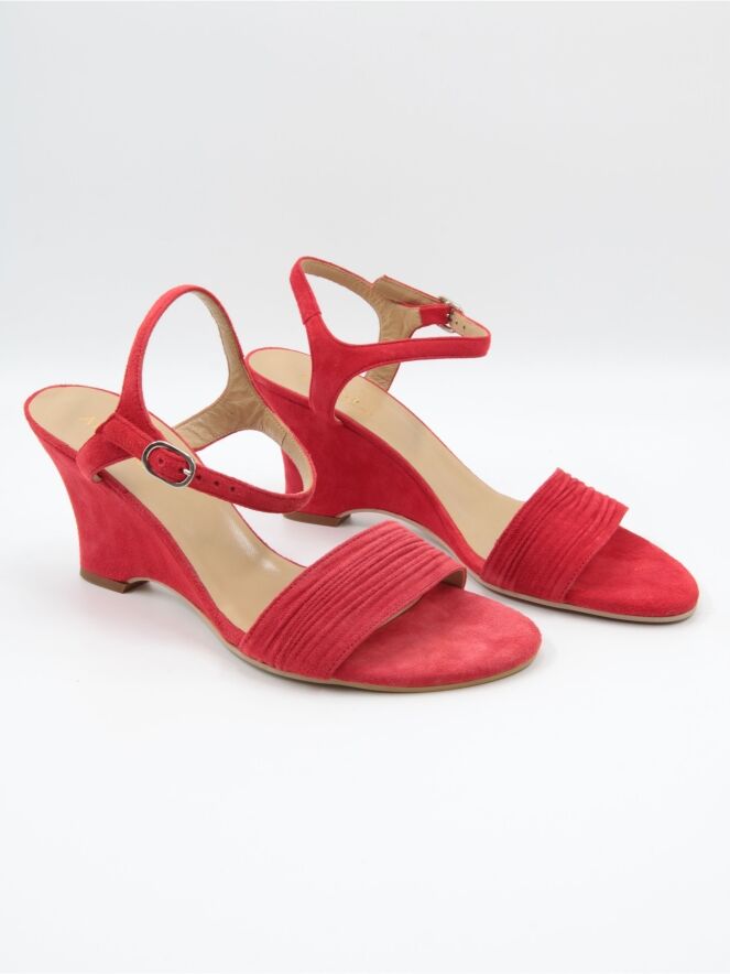 Une sandale à bout ouvert de Even and Odd en rouge corail. Le talon compensé est recouvert du même matériau que la sandale. La large bride sur l’avant du pied est finement côtelée. La bride à la cheville est réglable.
