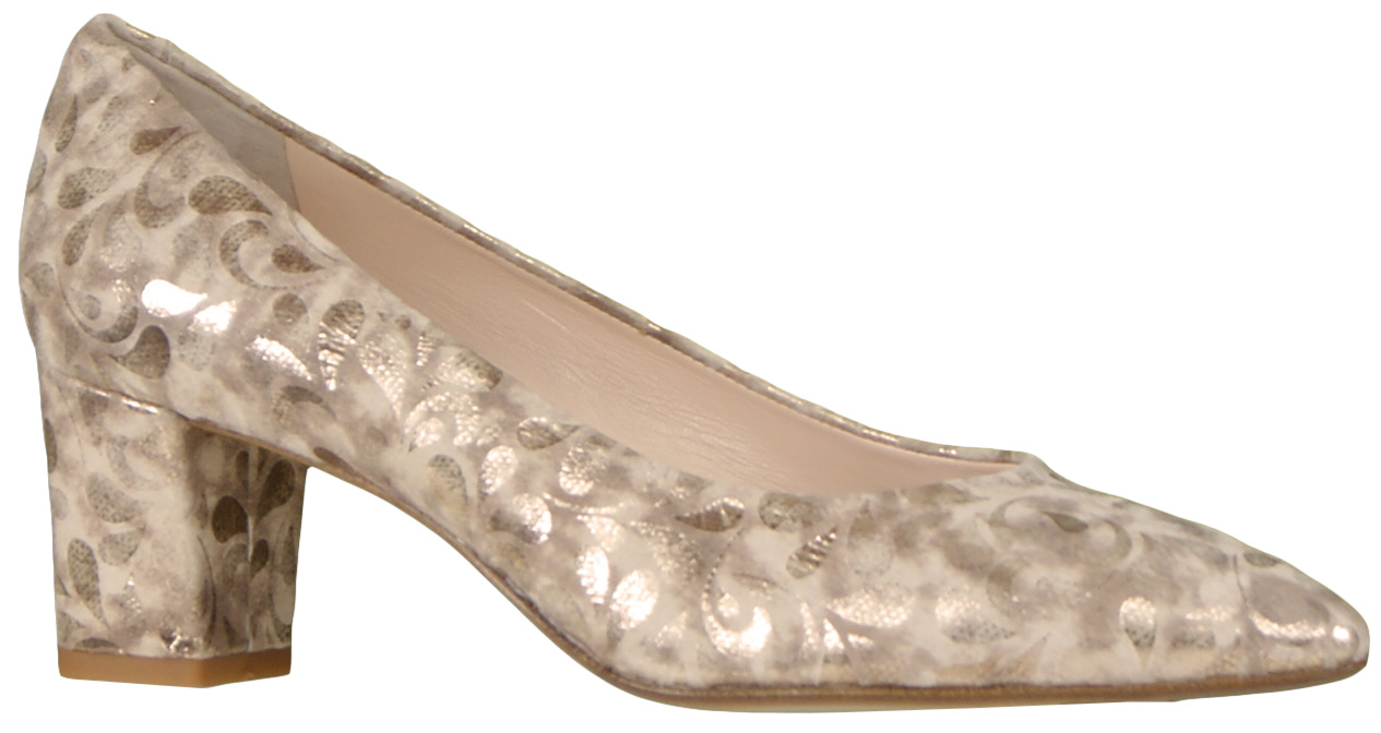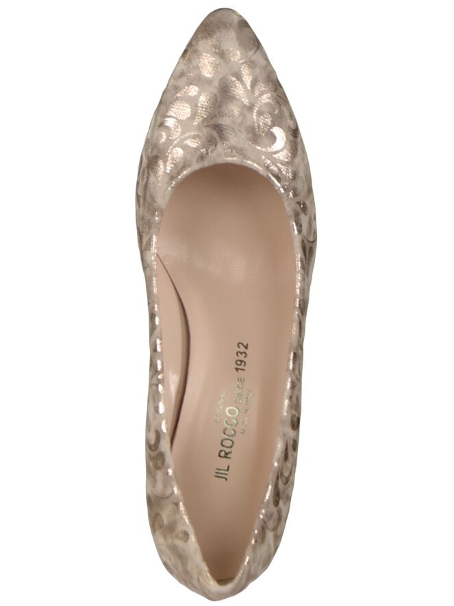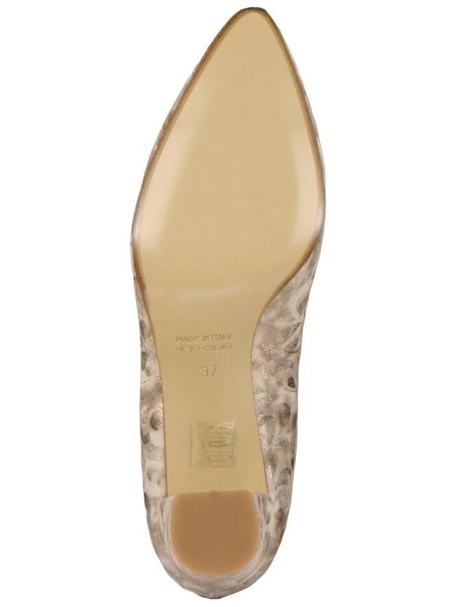 Escarpin de la marque Even & Odd, entièrement recouvert de cuir couleur cuivre pastel à motif baroque ton sur ton. Joli nez pointu. Modèle doublé cuir.