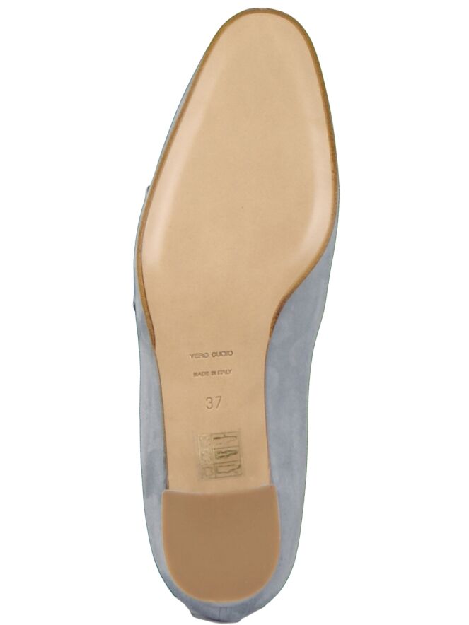 Escarpin de la marque Even & Odd, en nubuck gris clair. Son bout rond est orné d'une boucle rectangulaire argentée. Son talon est recouvert du même nubuck. Modèle doublé cuir.