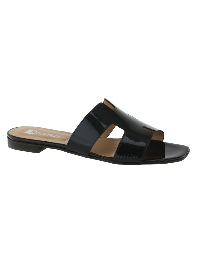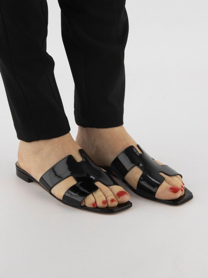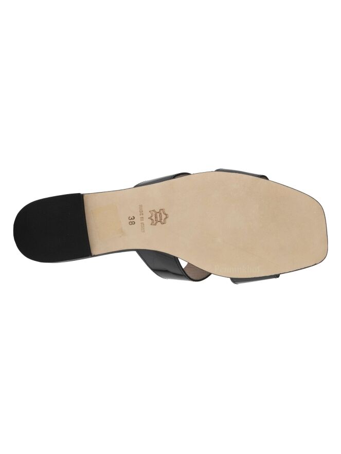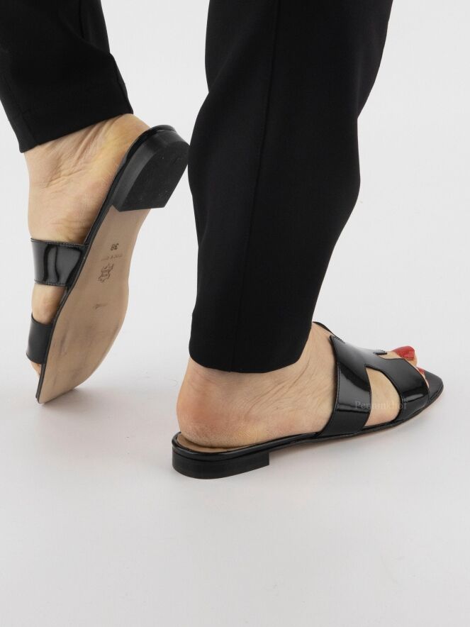 Sandale ouverte de la marque Even and Odd (Pascucci) en cuir verni noir. Le cuir présente deux ouvertures sur les côtés. La semelle est en partie en cuir naturel et en cuir verni noir à l'avant.