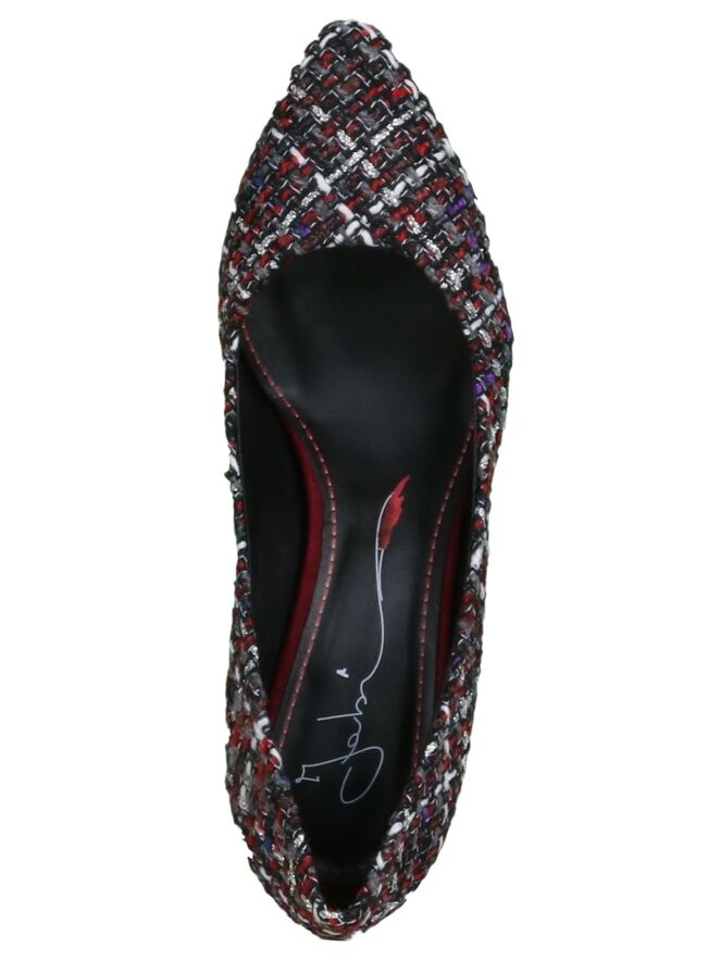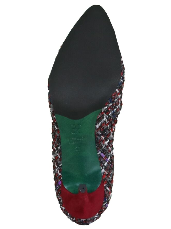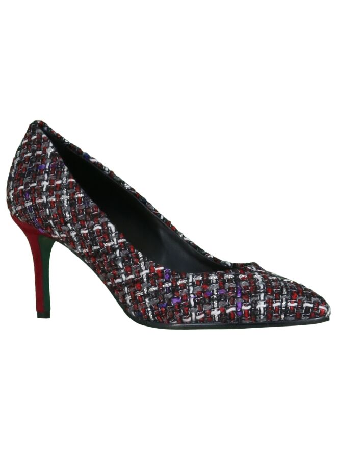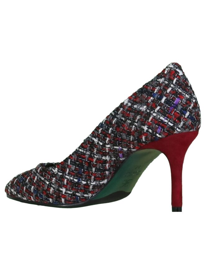 Bel escarpin de la marque Fabi, dans un tissu tweed aux couleurs noir, gris, blanc et rouge. Son talon fin habillé de velour rouge et son nez pointu lui confèrent son élégance. Modèle doublé cuir. Cet escarpin peut être coordonné avec le sac de référence 404003351