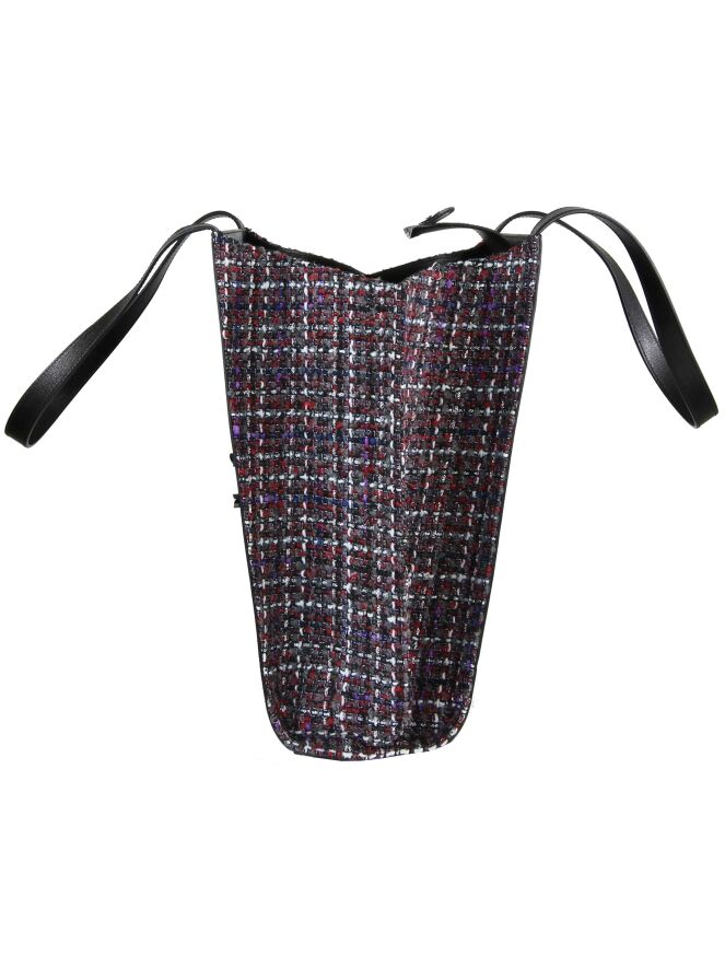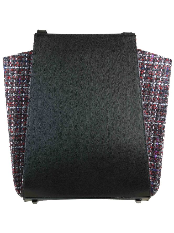 Sac à mains à soufflets, de marque Fabi, en cuir noir avec un tissu de deux pièces en cuir noir sur le devant et l\'arrière, et en tissu de couleurs quadrillées violet, rouge, blanc et noir sur les côtés. Le sac a un compartiment avec un 2ème sac à l\'intérieur. Une pochette extérieure de cuir noir s\'enchaîne sur l\'un des deux côtés. La fermeture en cuir a un bouton-poussoir magnétique.