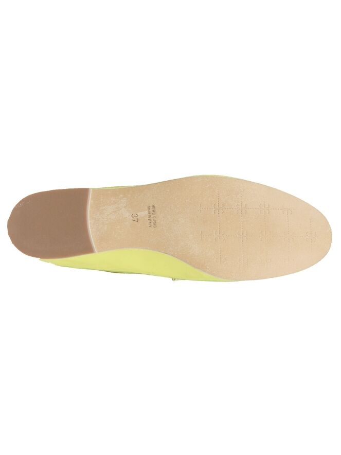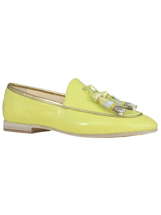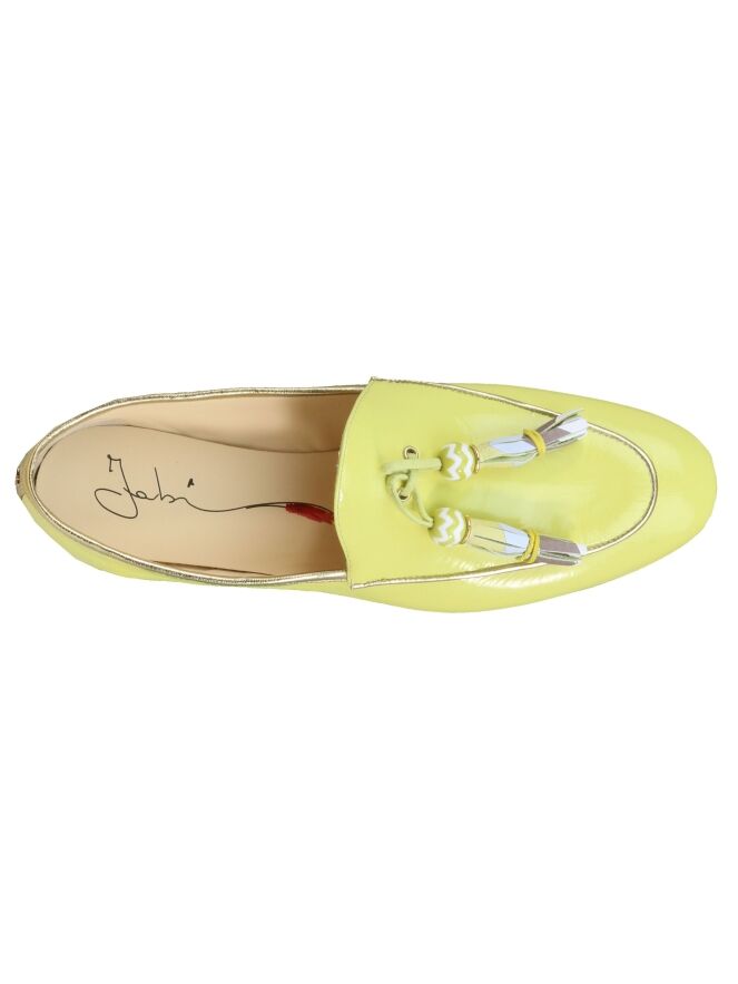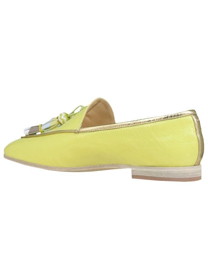 Luxueux mocassin de la marque Fabi, en cuir nappa pistache lime. La chaussure est bordée d'une ligne dorée qui se prolonge sur l'avant-pied lui-même orné de 2 glands en perle et en cuir couleurs citron vert, lavande et taupe clair. Semelle intérieure amovible et intérieur doublé cuir.