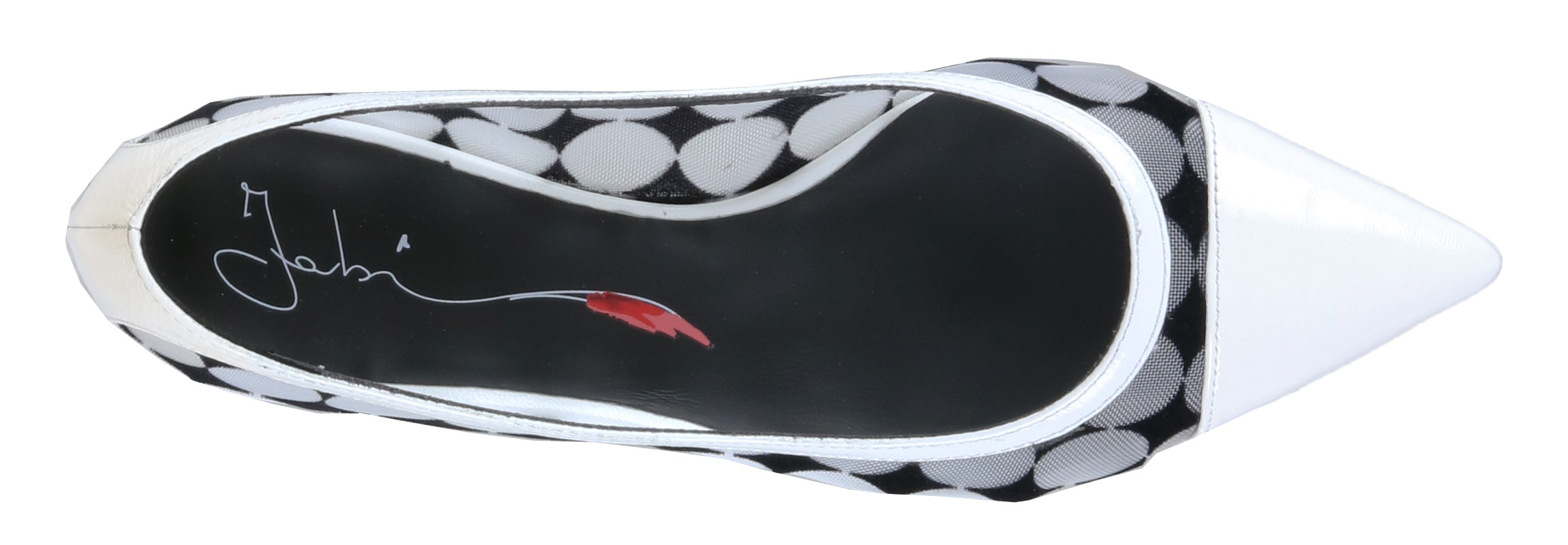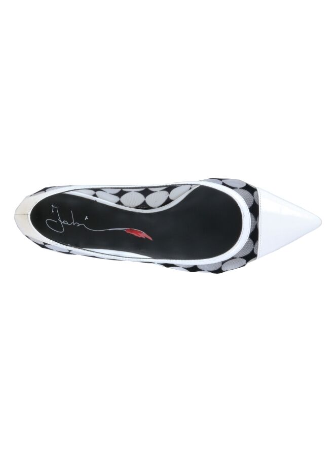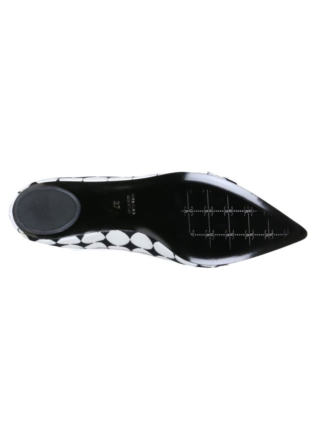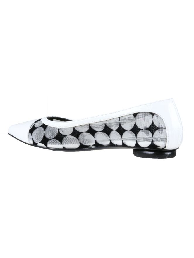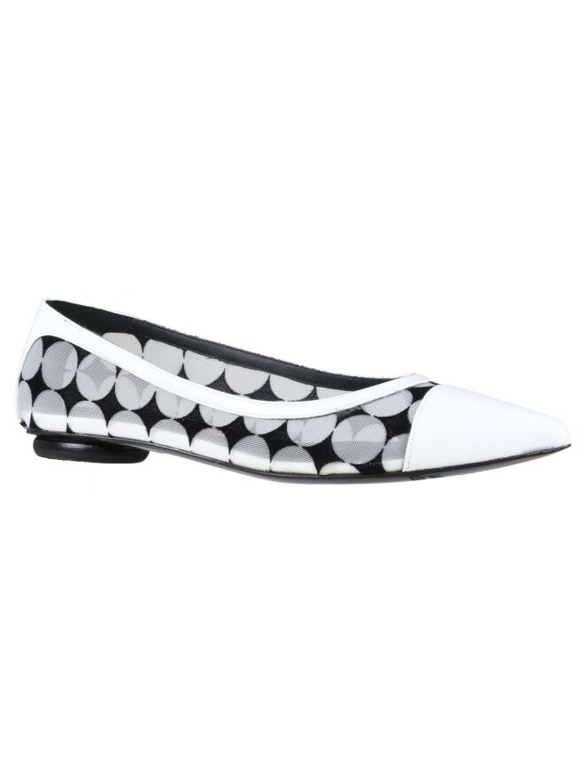 Ballerine à nez pointu de la marque Fabi. L'intérieur et l'extérieur de la chaussure sont faits en maillage transparent imprimé de gros pois blancs sur fond noir. Les bords de la chaussure et le nez sont en cuir brossé de couleur blanc.