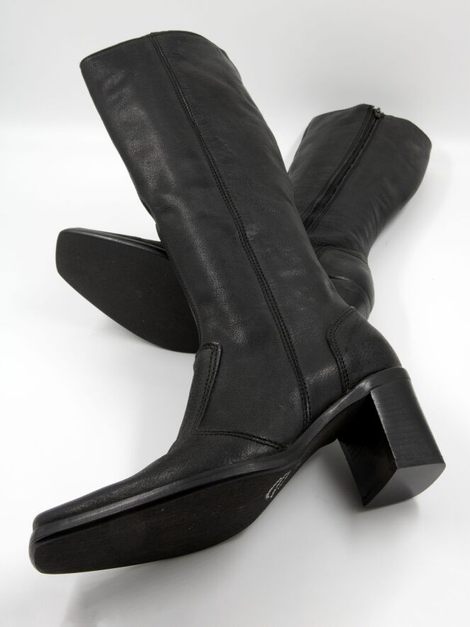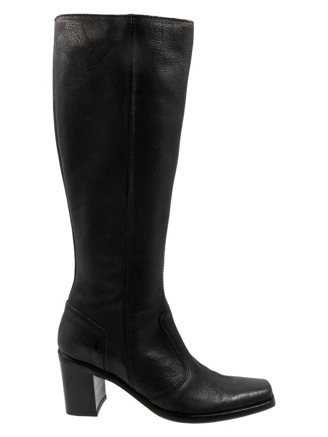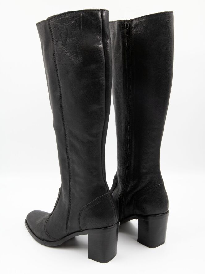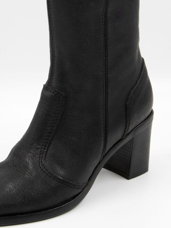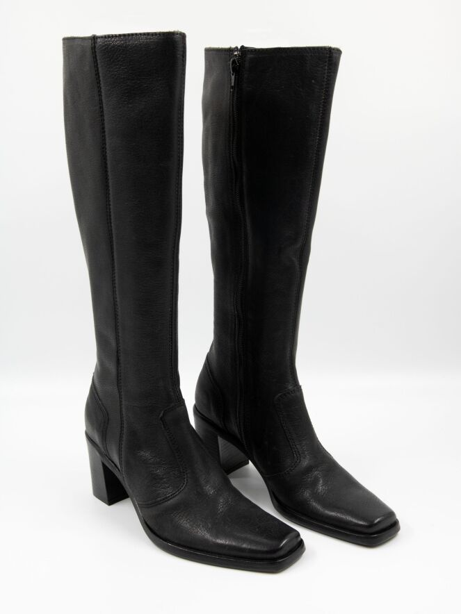 Botte haute de Franco Troise en noir. À la base de la tige se trouve une bride avec une boucle argentée. La botte présente un bout pointu et un talon fin. Une fente avec élastique est intégrée dans le haut de la tige. L’intérieur est doublé de cuir.