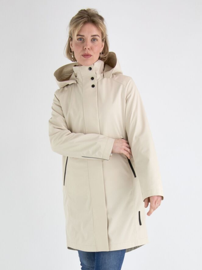 Un manteau de Fuchs Schmitt dans une teinte blanc crème à beige. Le manteau est doté d'une capuche amovible avec un cordon dans une finition tunnel le long du bord, permettant d'obtenir un effet plissé. Il a une fermeture à glissière dissimulée avec des boutons pression supplémentaires. Les poches zippées ont des fermetures à glissière. Ce manteau peut être lavé à 30 degrés.