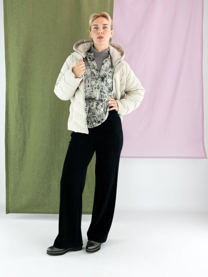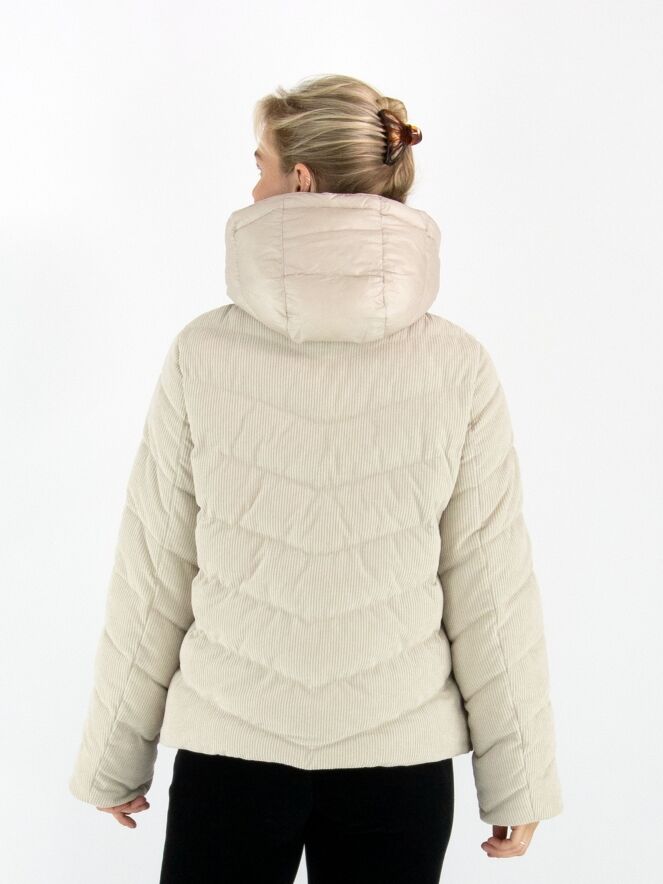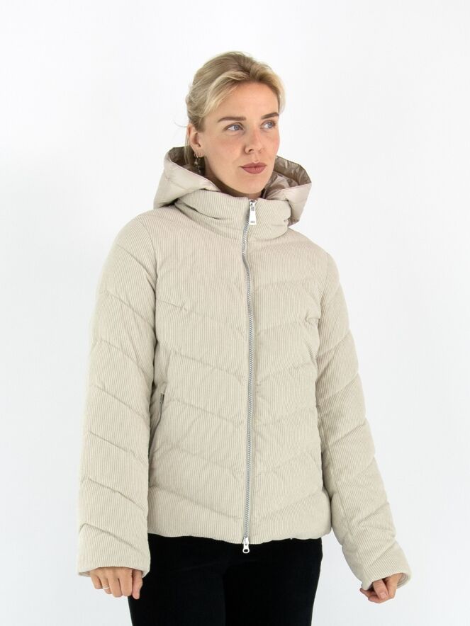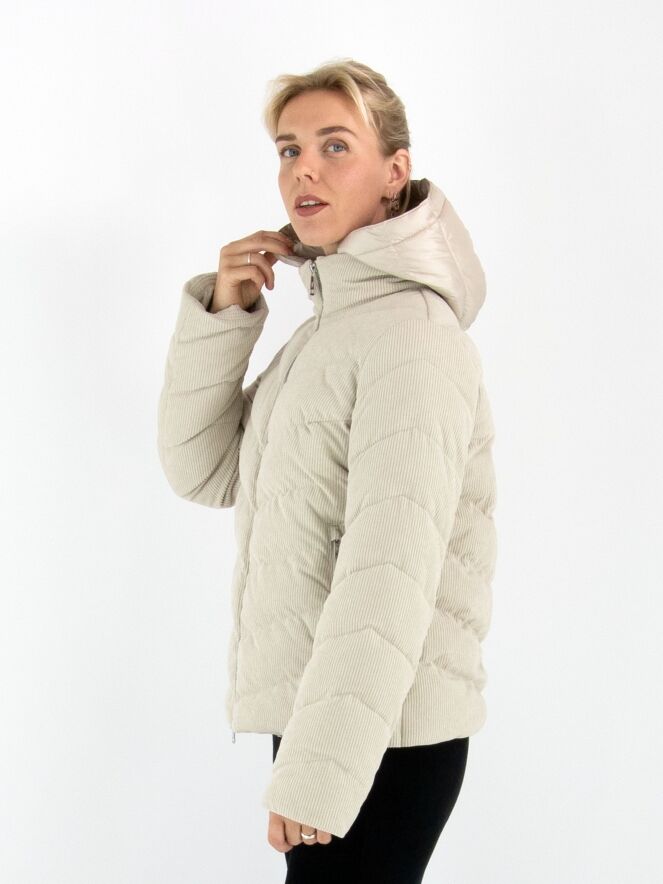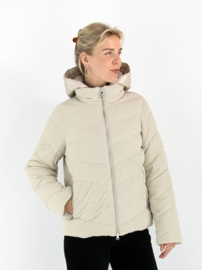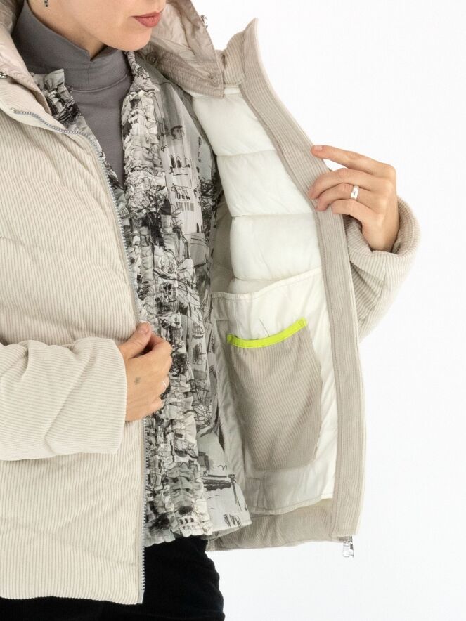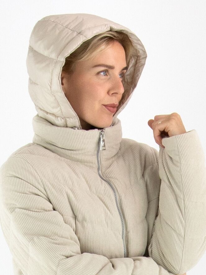 Un manteau de Fuchs Schmitt en tissu côtelé beige. Le manteau possède une capuche amovible en tissu parachute. Il se ferme par un zip, et les poches sont également équipées d’une fermeture éclair. Ce manteau peut être lavé à 30 degrés.