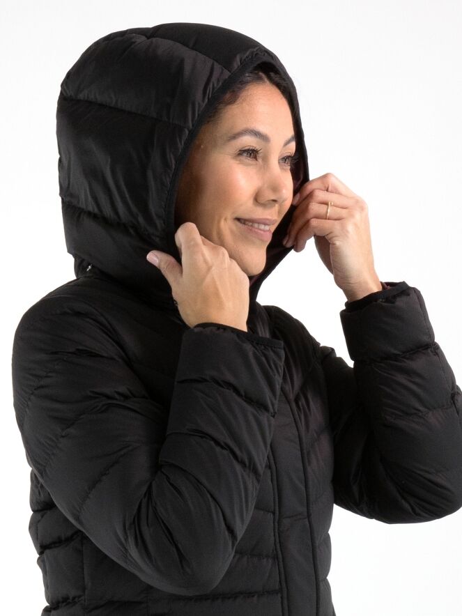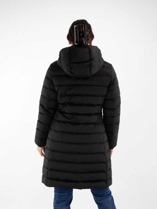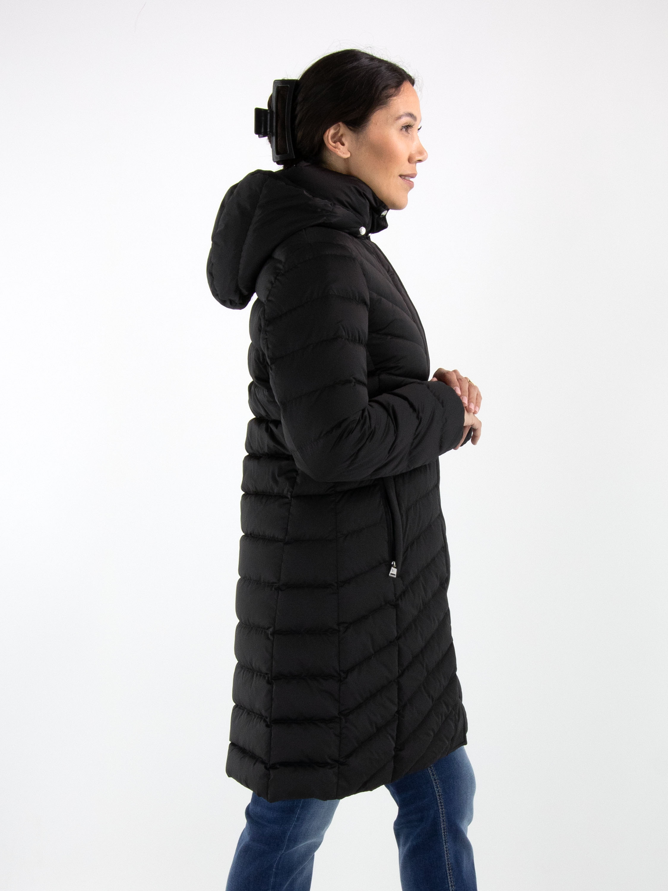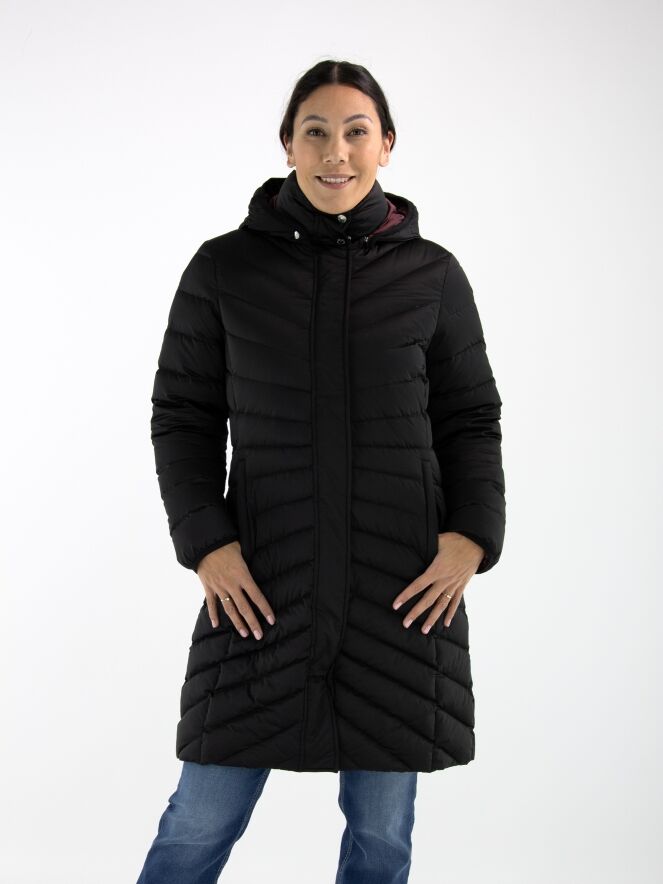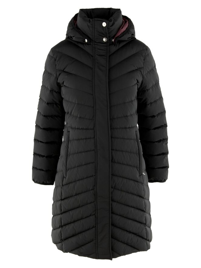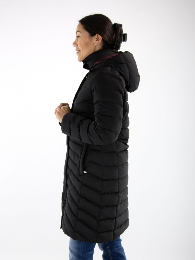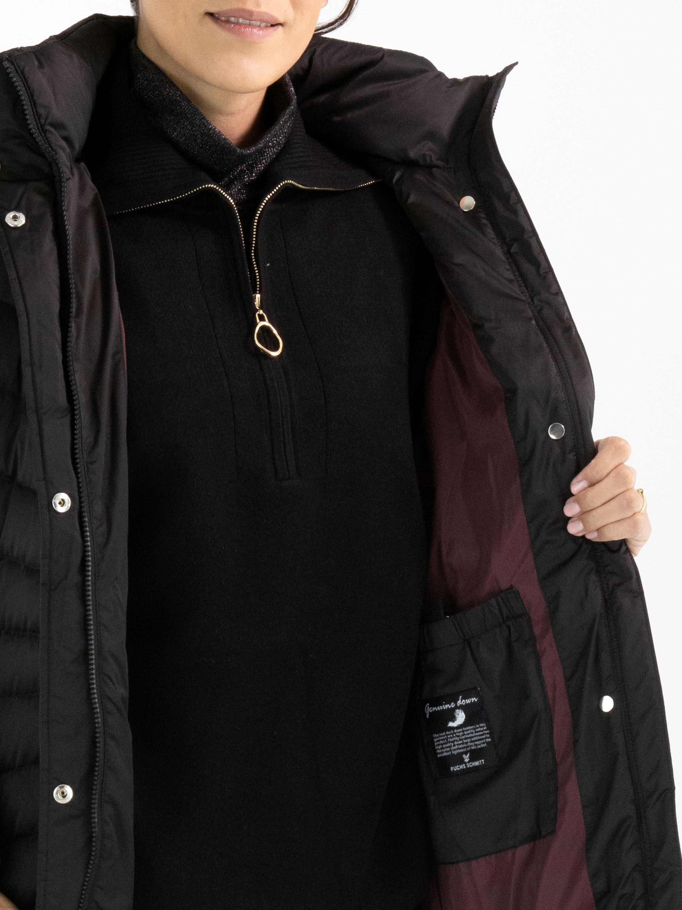 Un manteau matelassé de Fuchs Schmitt en noir. La doublure est réalisée dans une teinte bordeaux profonde. La capuche est amovible et la fermeture zippée est recouverte d’une patte supplémentaire à pressions. Ce manteau peut être lavé à 30 degrés.