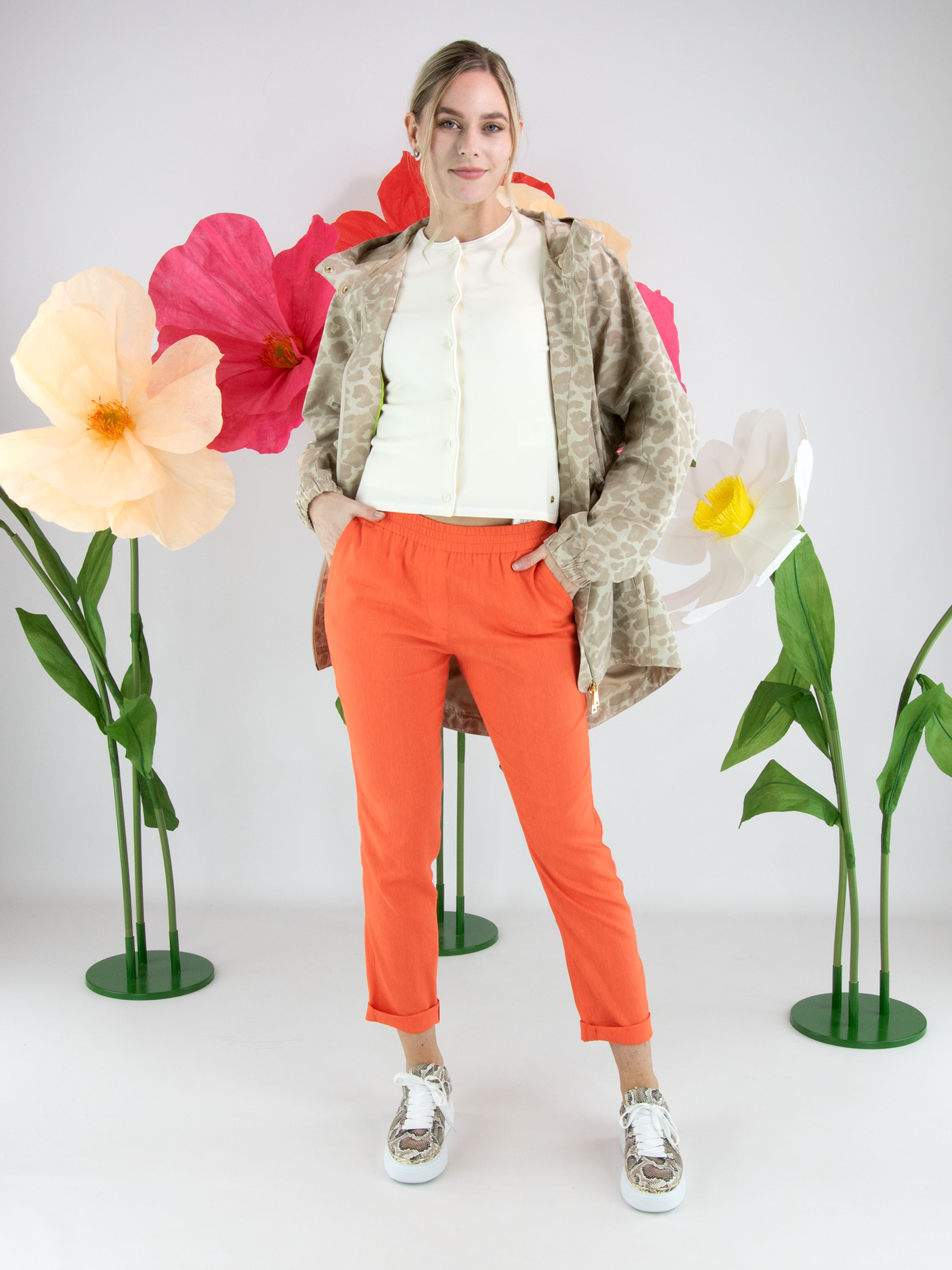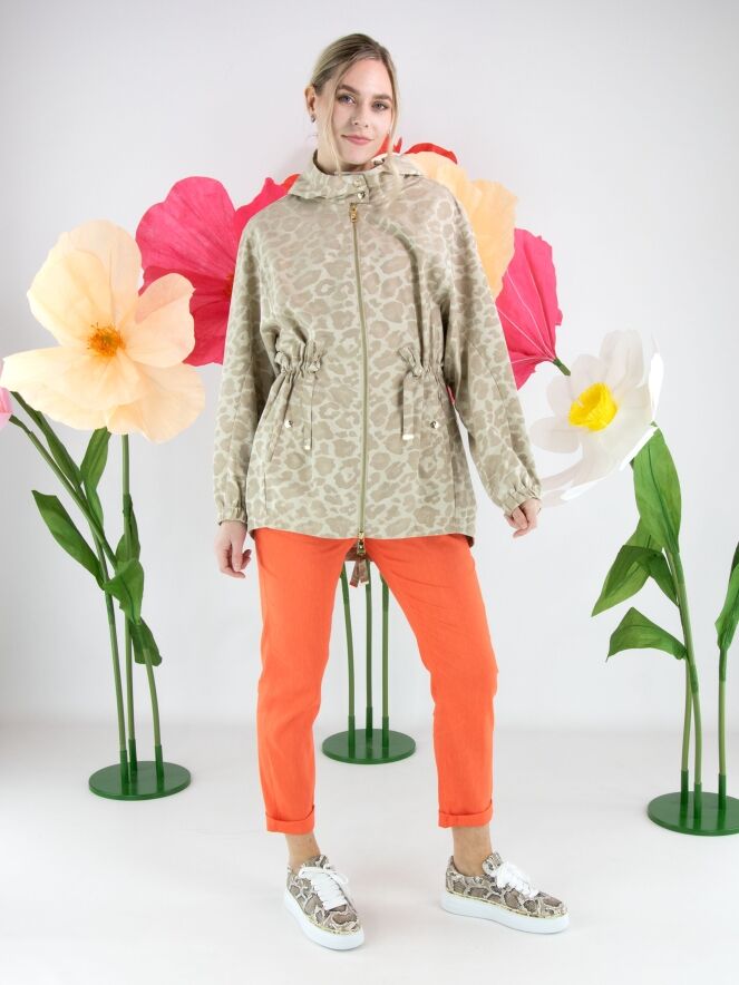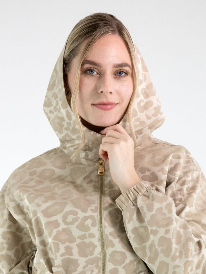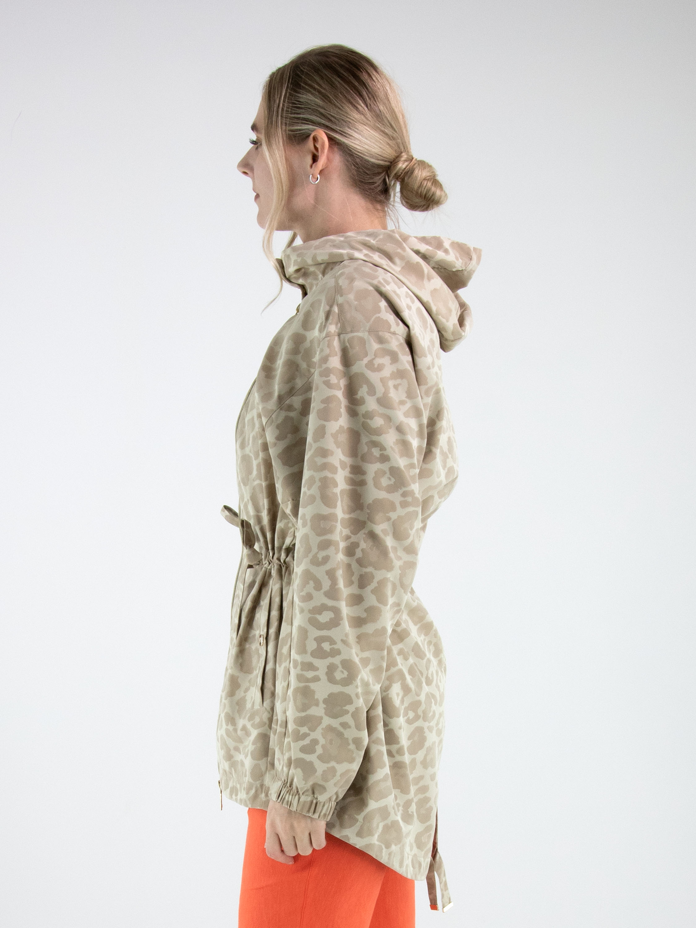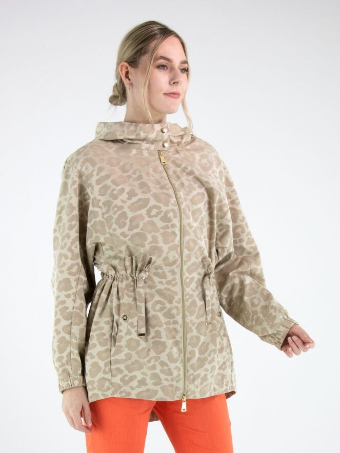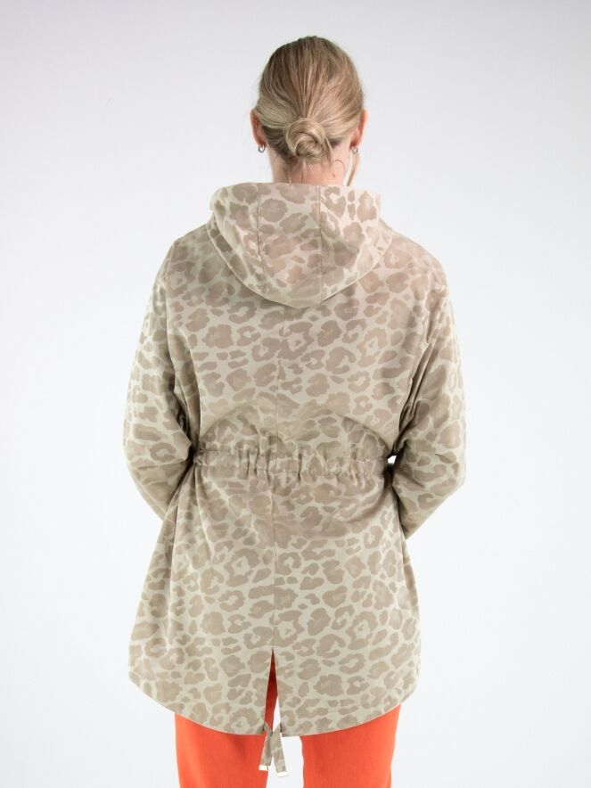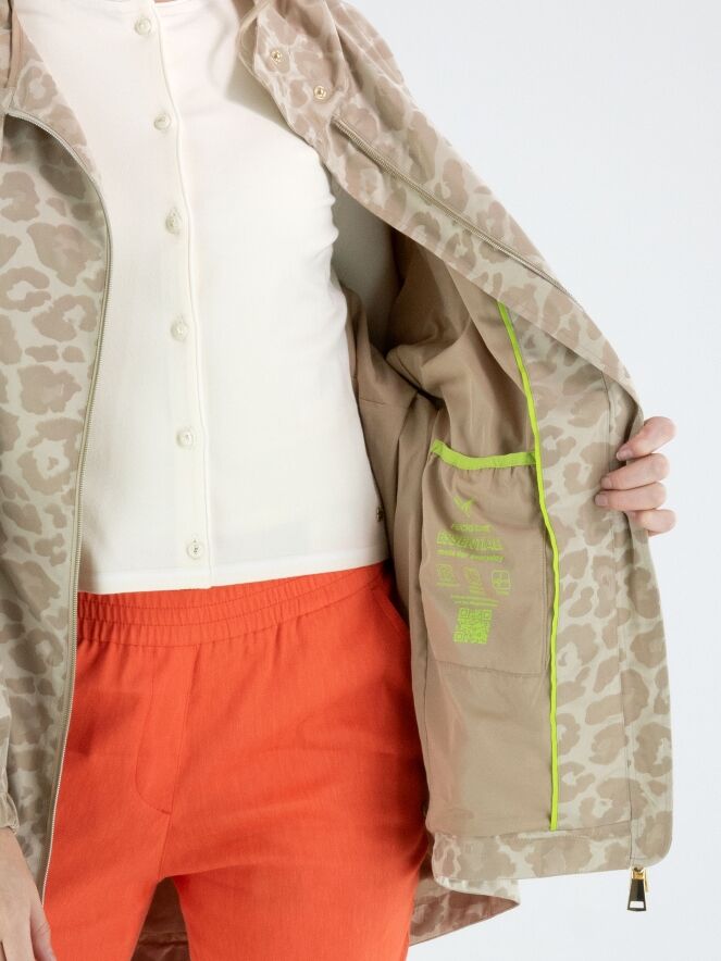 Parka de Fuchs Schmitt avec un imprimé léopard ton sur ton dans plusieurs nuances de sable et de beige. Dotée d’une capuche et d’une fermeture zippée dorée, elle offre une allure élégante et contemporaine. À la taille, un cordon coulissant en tunnel permet de créer un subtil effet plissé et d’ajuster la silhouette. Des poches latérales se situent sous ce cordon, et les manches longues sont terminées par des poignets élastiques. Ce parka exclusif peut être lavé à 30 degrés.