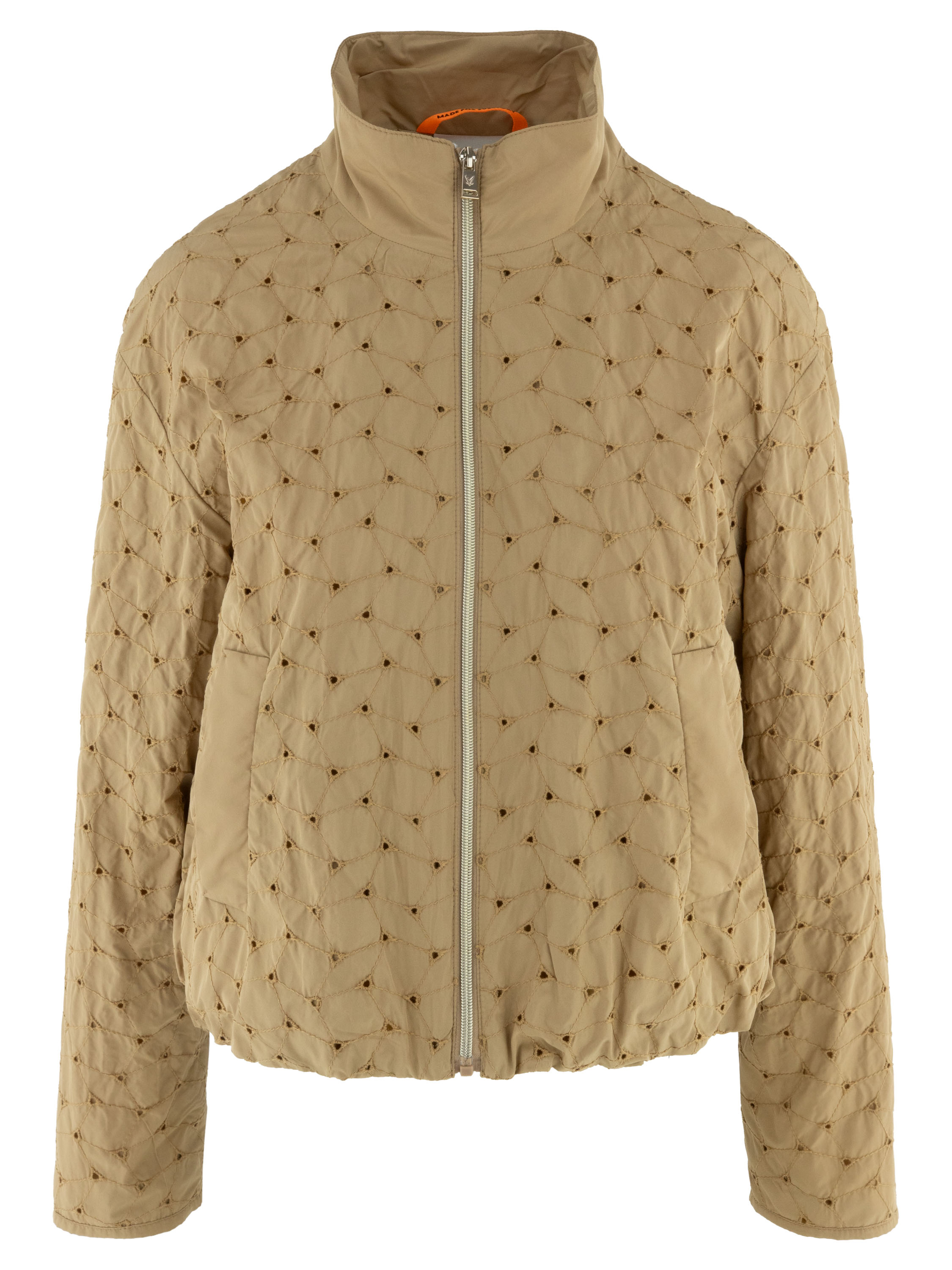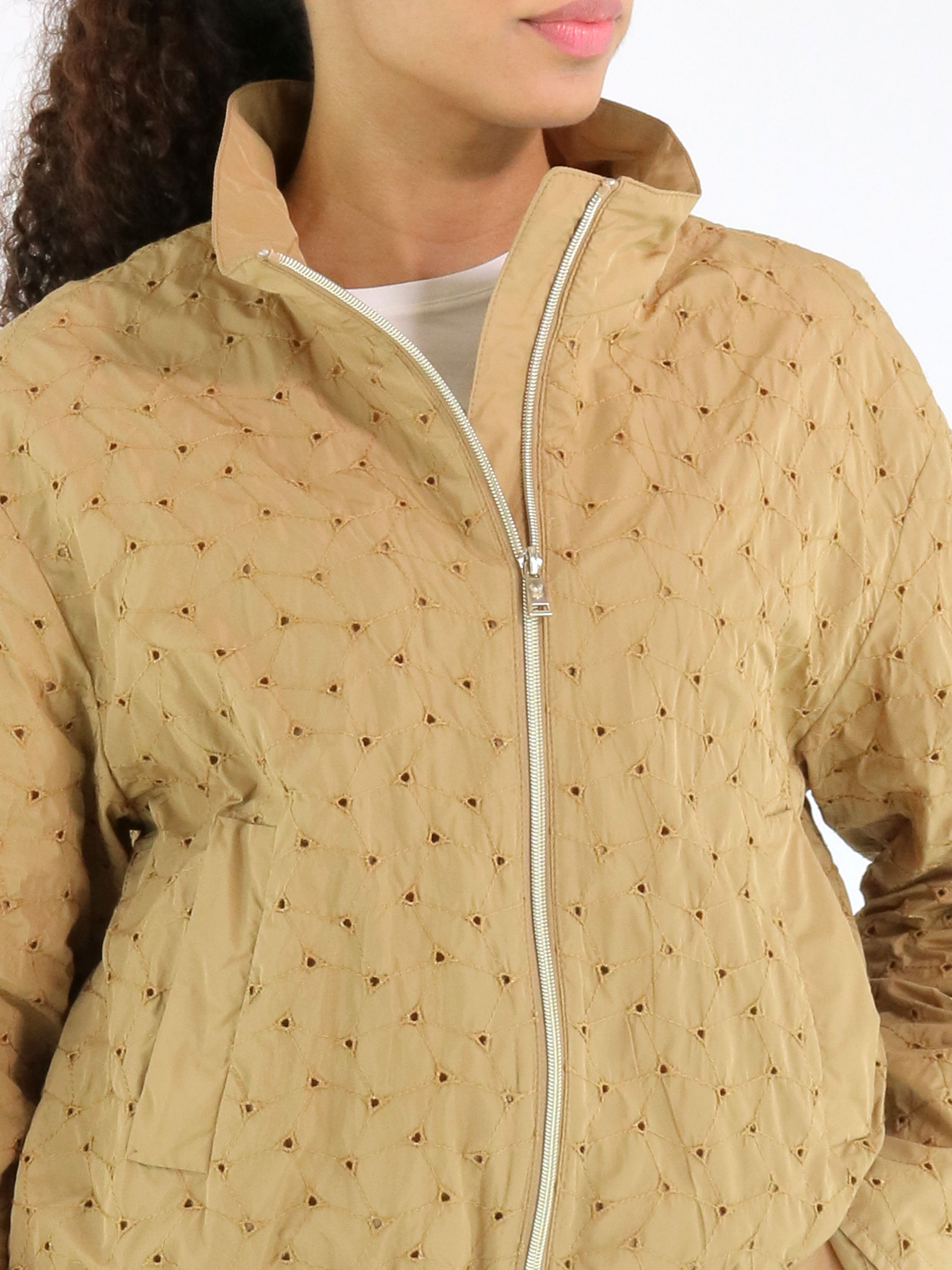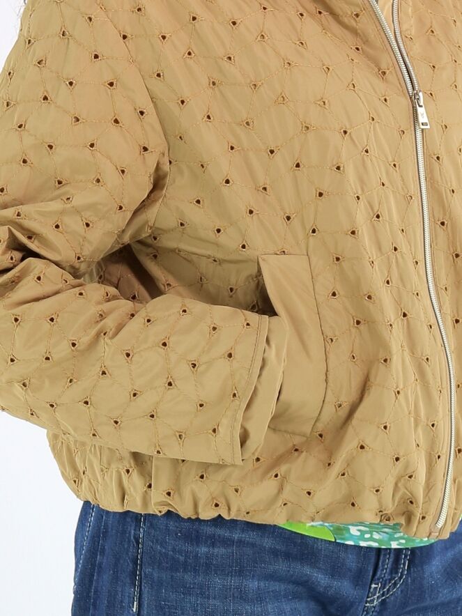 Manteau d’été de Fuchs Schmitt dans une chaleureuse teinte camel. Le tissu présente des surpiqûres décoratives formant un motif losange subtil et est perforé aux intersections des coutures, créant un effet léger et raffiné. Le manteau est doté d’une fermeture zippée argentée et de poches latérales pratiques. Ce manteau féminin exclusif peut être lavé à 30 degrés.