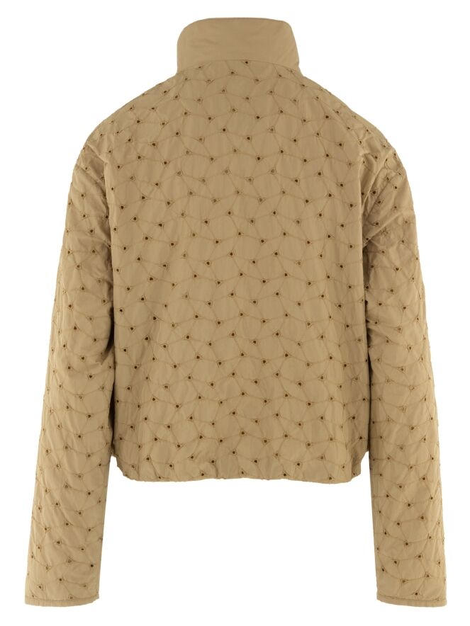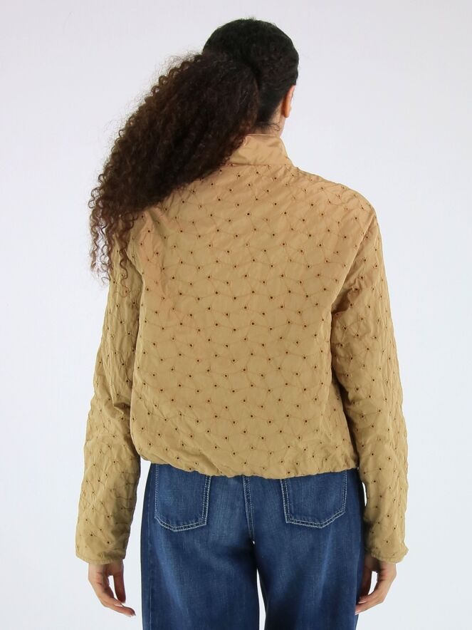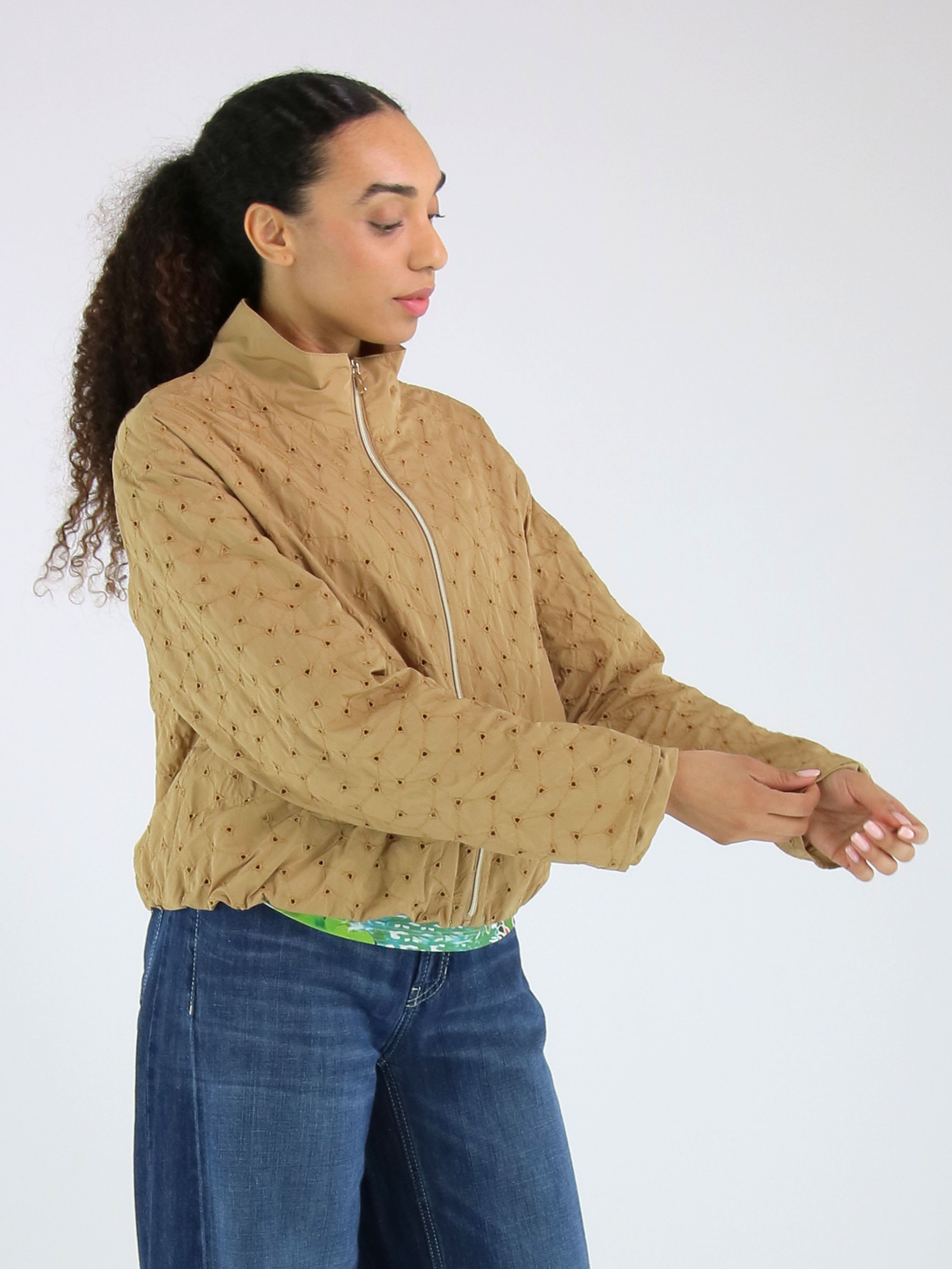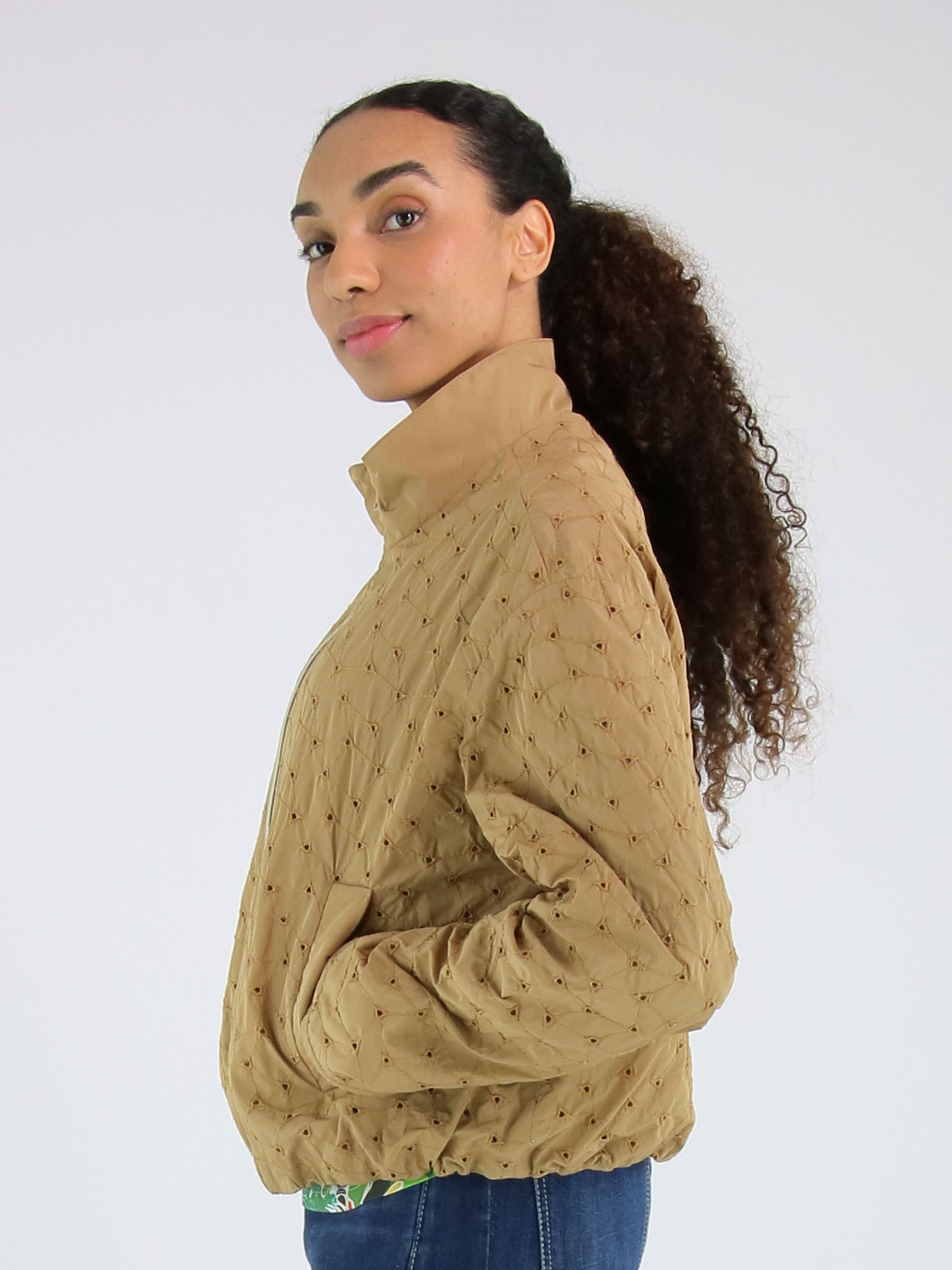 Manteau d’été de Fuchs Schmitt dans une chaleureuse teinte camel. Le tissu présente des surpiqûres décoratives formant un motif losange subtil et est perforé aux intersections des coutures, créant un effet léger et raffiné. Le manteau est doté d’une fermeture zippée argentée et de poches latérales pratiques. Ce manteau féminin exclusif peut être lavé à 30 degrés.