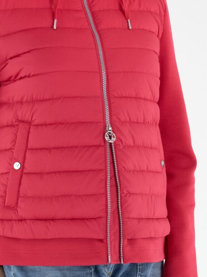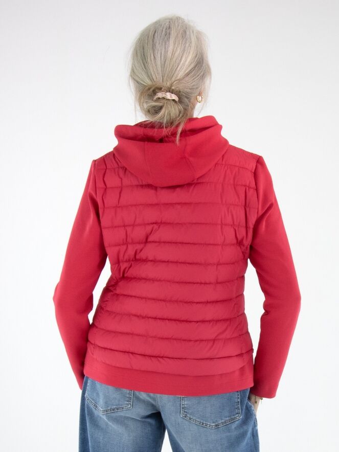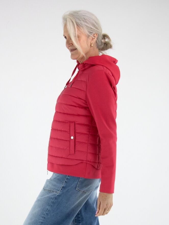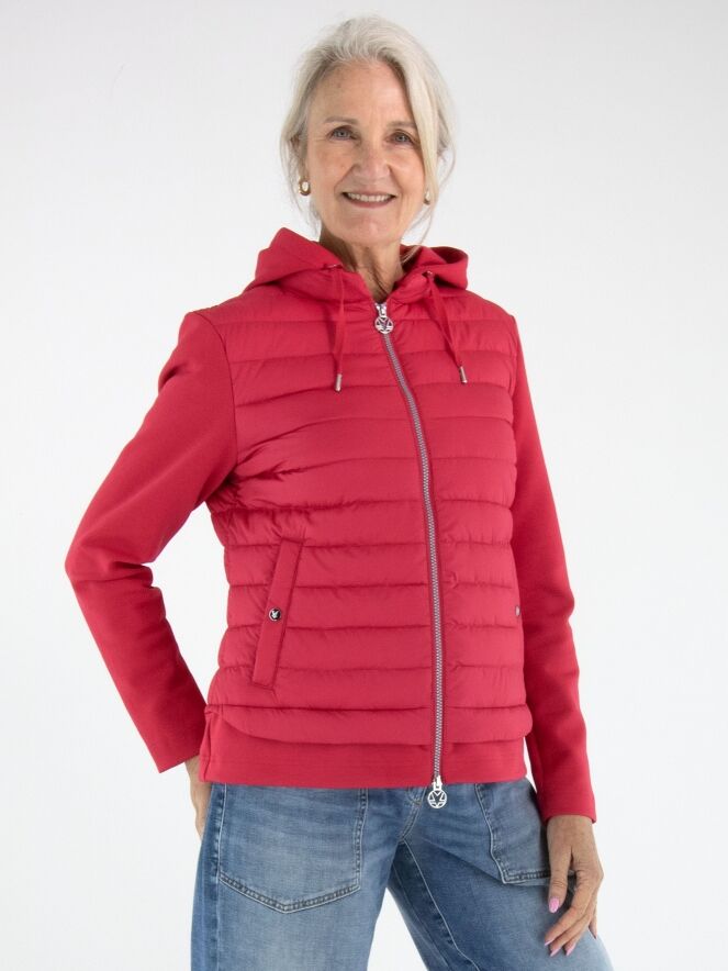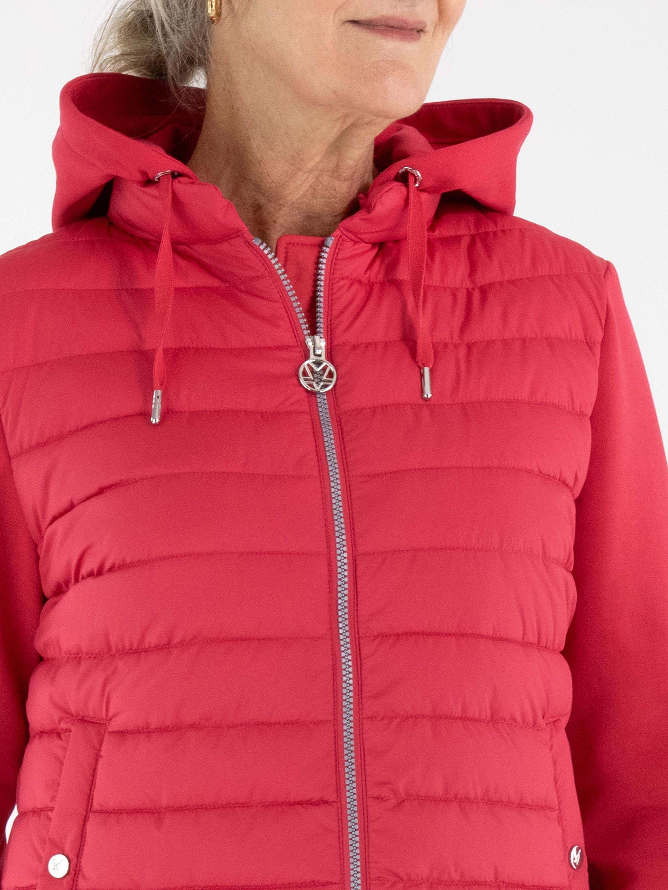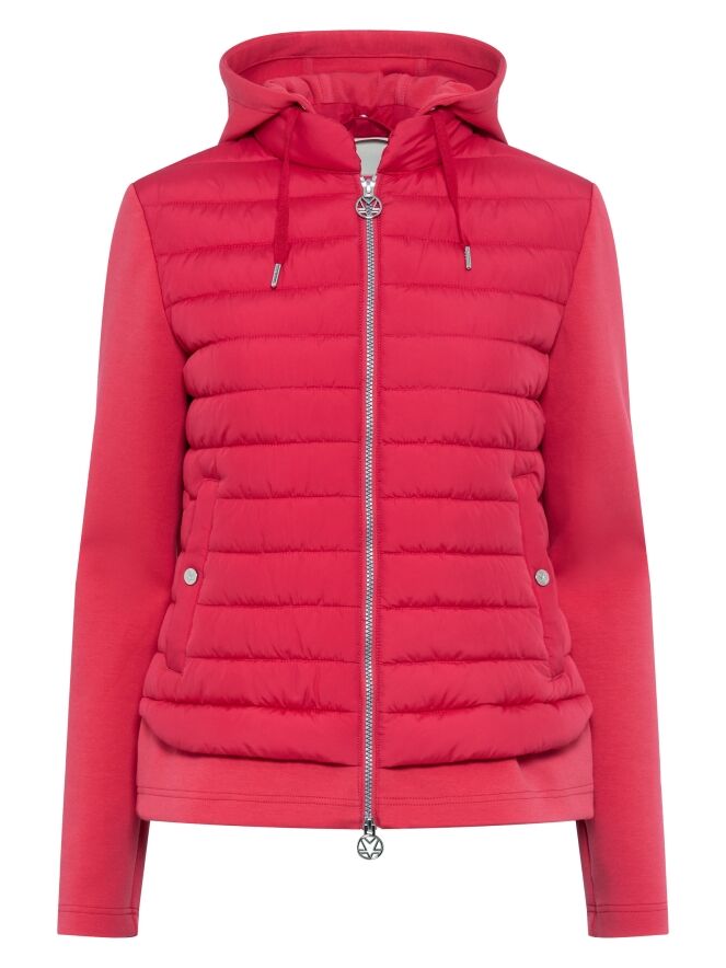Manteau matelassé de Fuchs Schmitt dans une teinte rouge éclatante. Un cordon de serrage intégré au bord de la capuche permet un ajustement personnalisé et offre une protection supplémentaire. Les manches sont réalisées dans un tissu uni mat, créant un contraste subtil avec la partie matelassée. Ce manteau peut être lavé à 30 degrés.