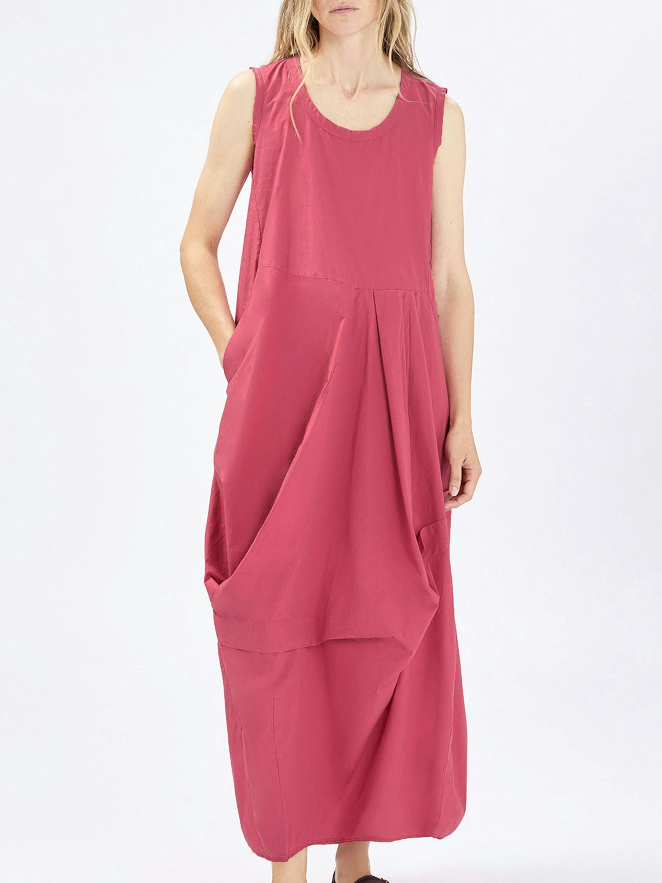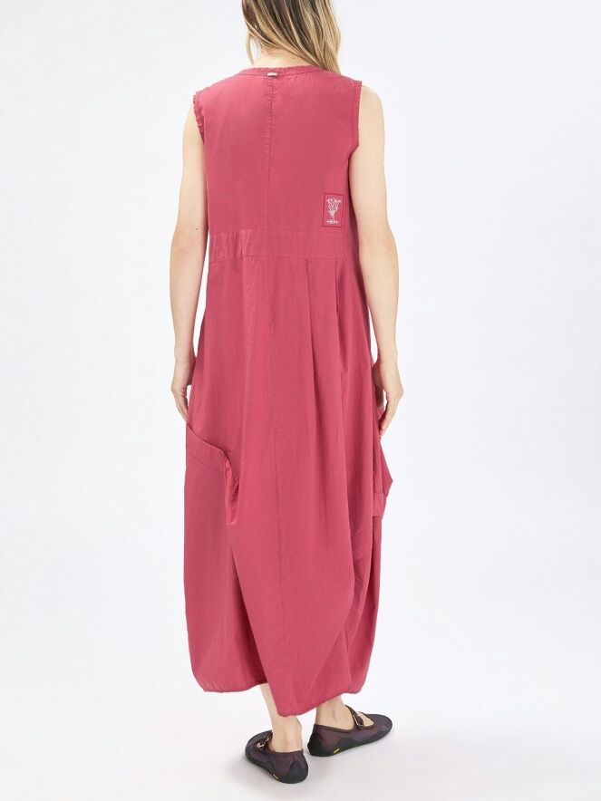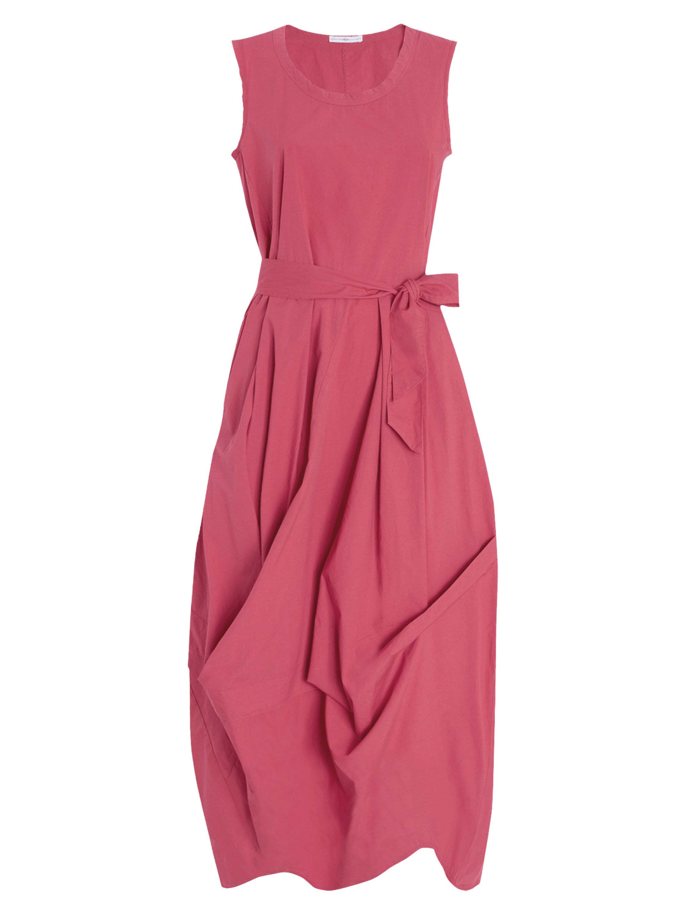 Une robe de High en coton estival dans une teinte rouge framboise. La robe présente une encolure ronde. À la taille, plusieurs plis sont travaillés sur le côté gauche à l’avant et sur le côté droit à l’arrière. Ces plis créent un effet ballon vers le bas de la robe. La robe est accompagnée d’une ceinture dans le même tissu et la même couleur. Cette robe peut être lavée à 30 degrés.