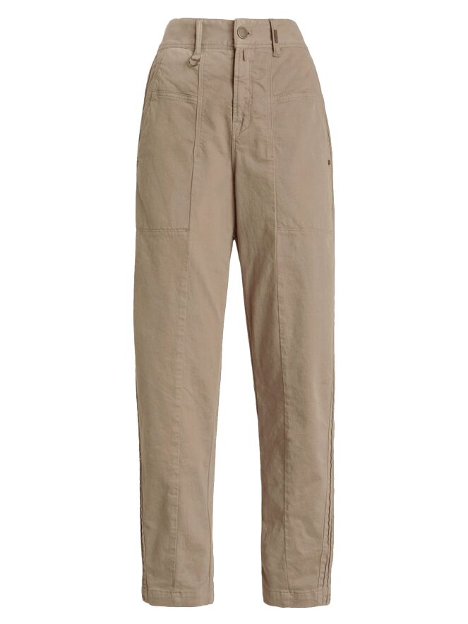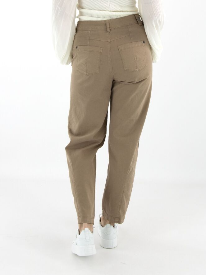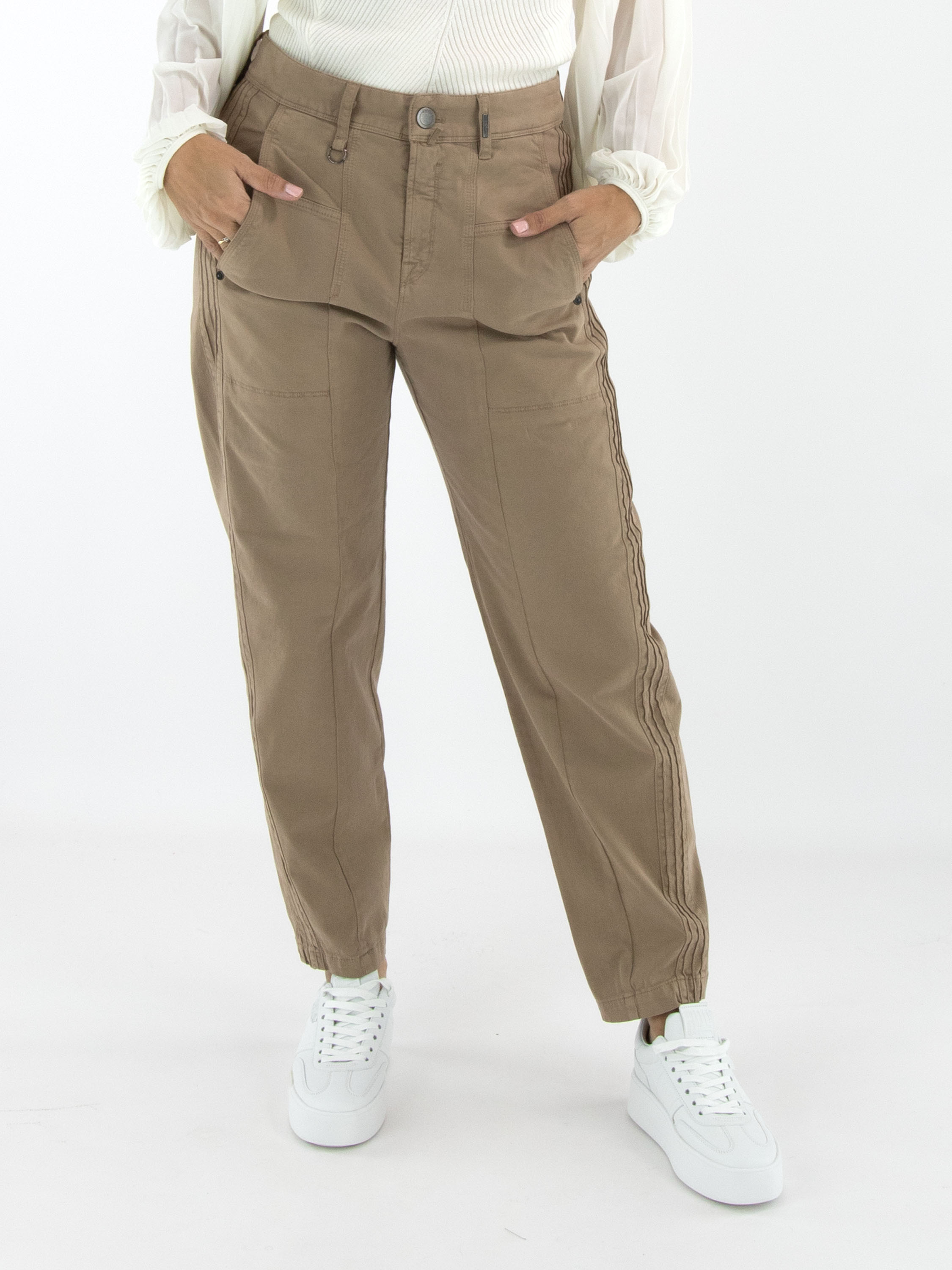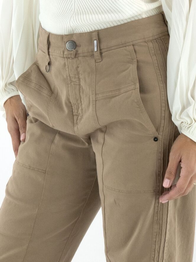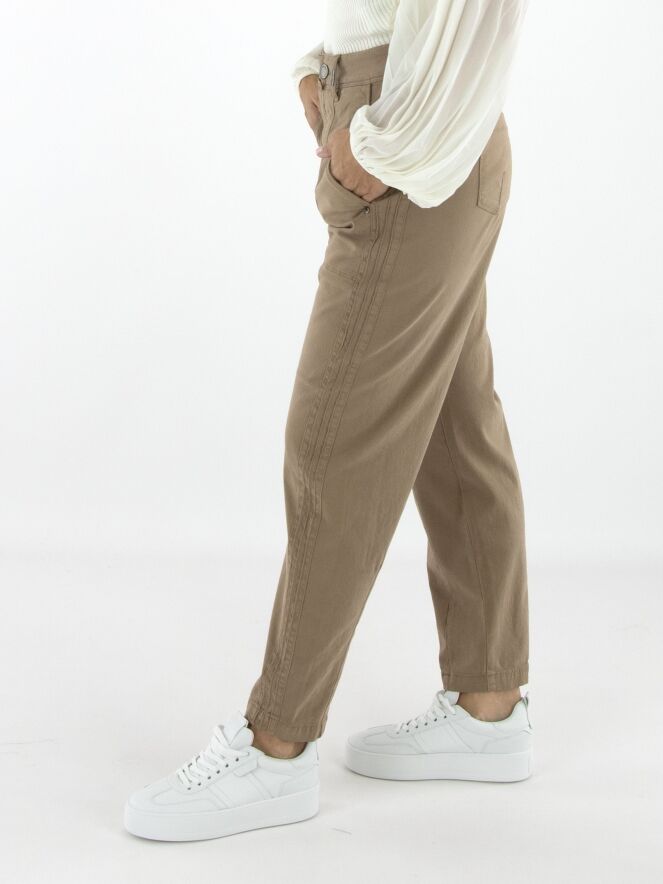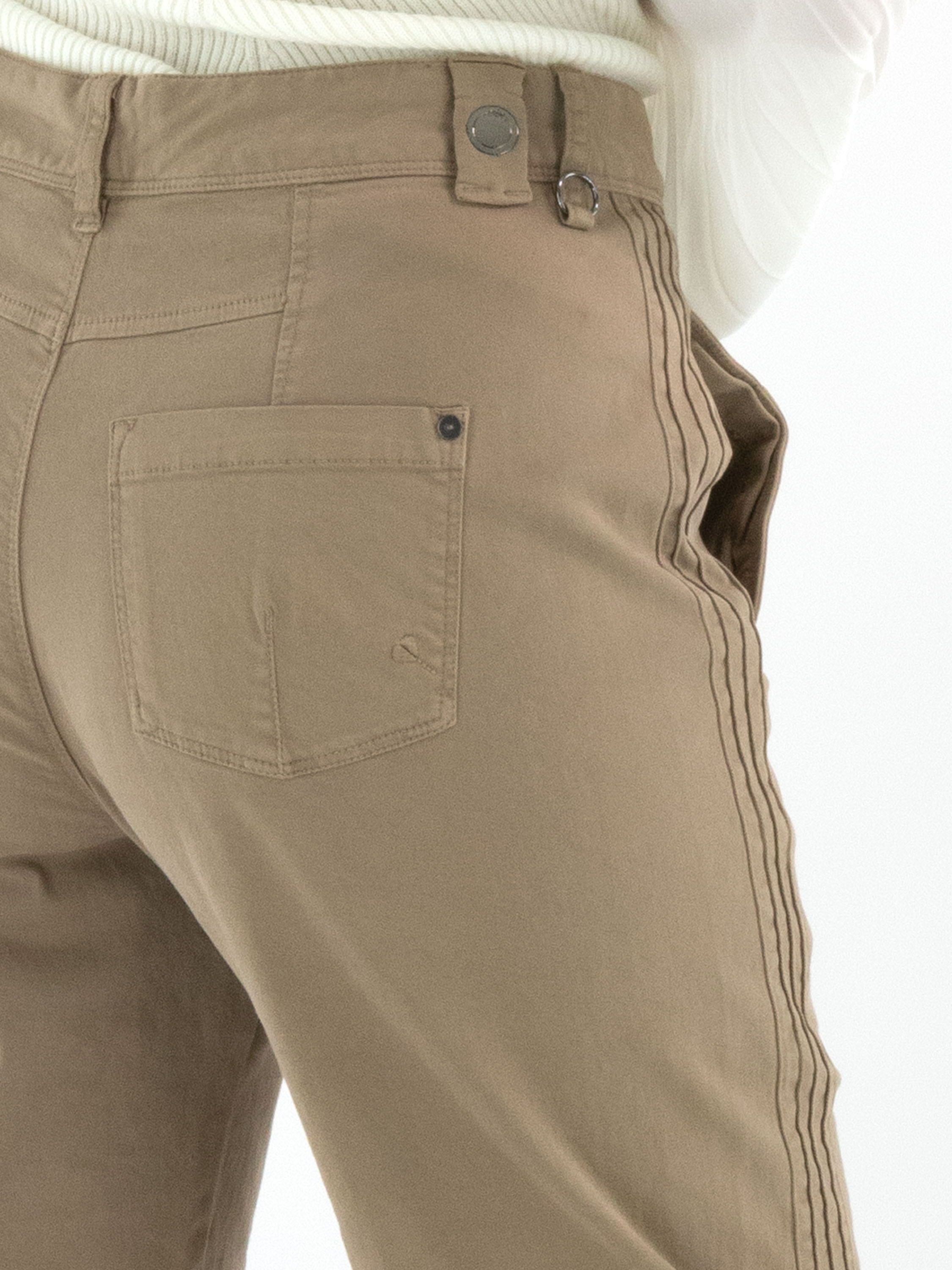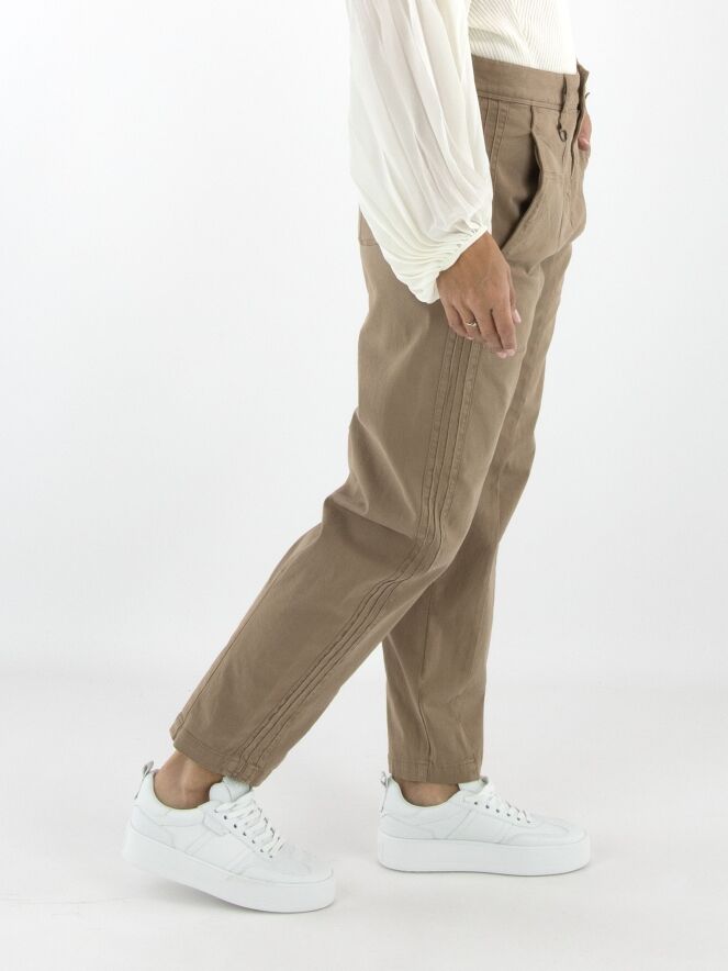 Un pantalon de High en brun. Le long des côtés des jambes se trouve une large bande ornée de plusieurs coutures inversées, apportant une touche moderne et distinctive au modèle. Le pantalon est doté de poches fendues et peut être lavé à 30 degrés.