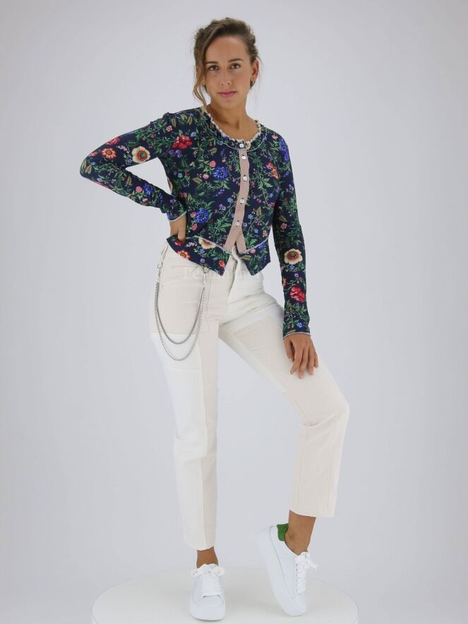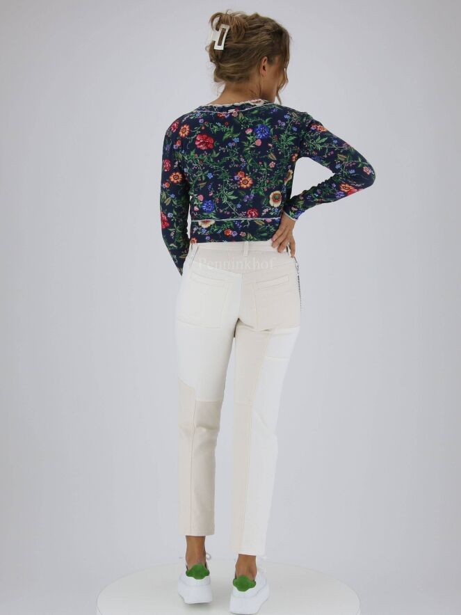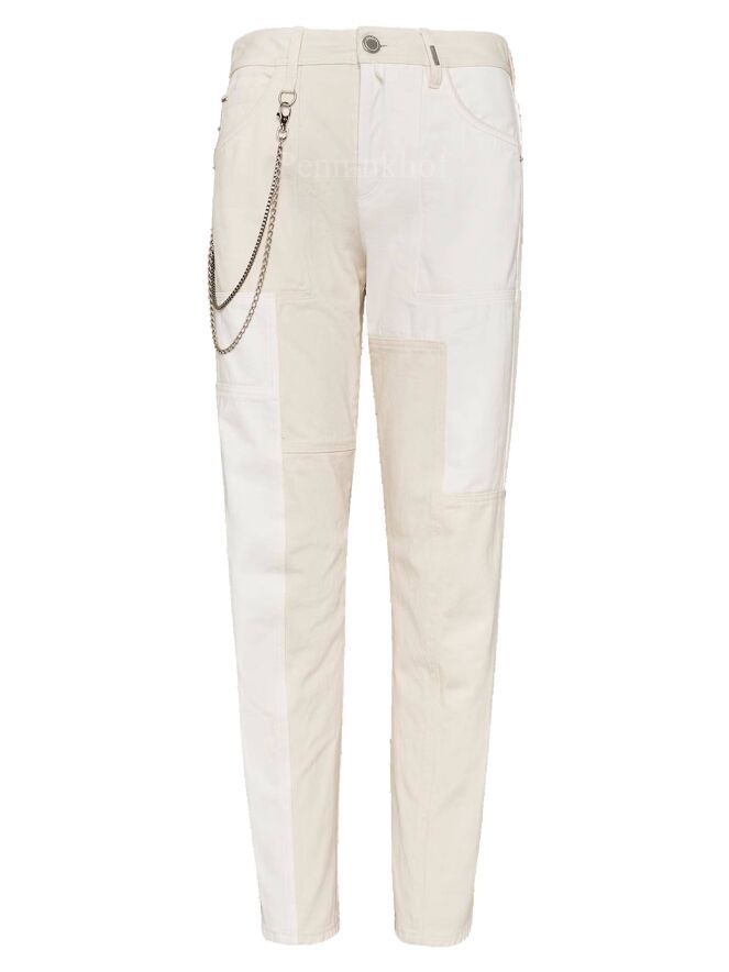 Jeans de la marque High, structuré en plusieurs empiècements asymétriques de couleur ivoire et blanc crème. Une double chaîne en métal argenté orne le côté droit de la taille. Lavage à 30 degrés.