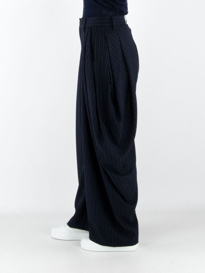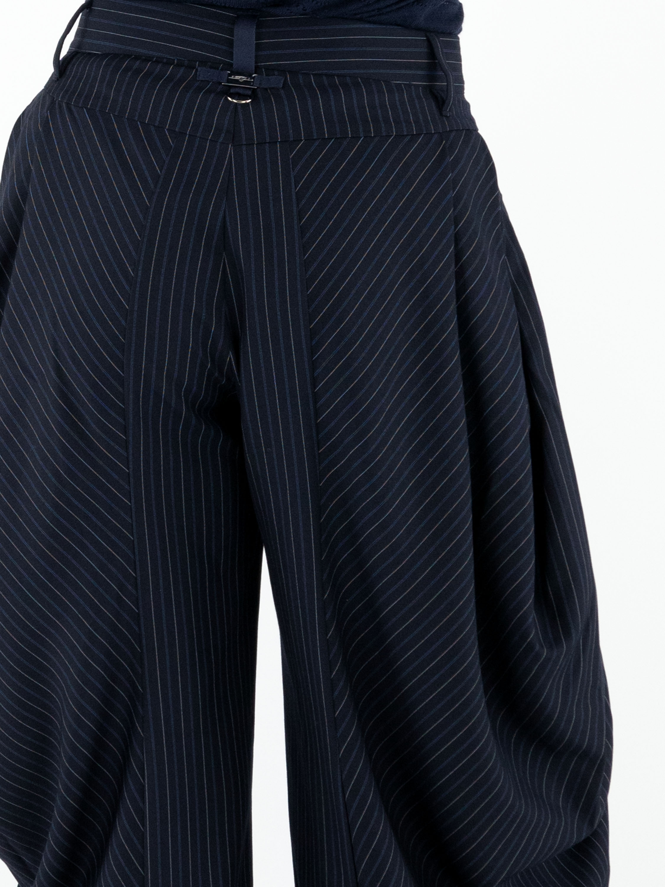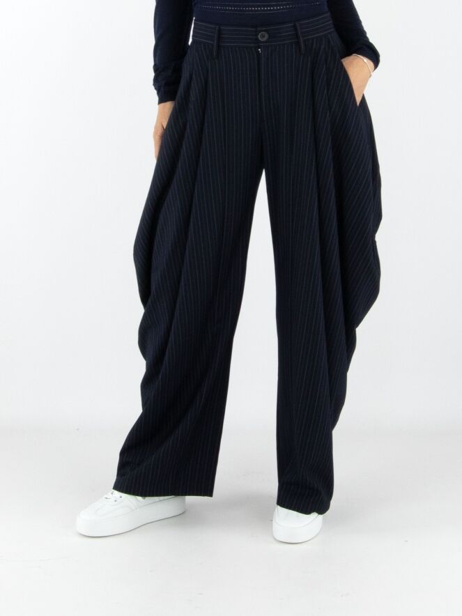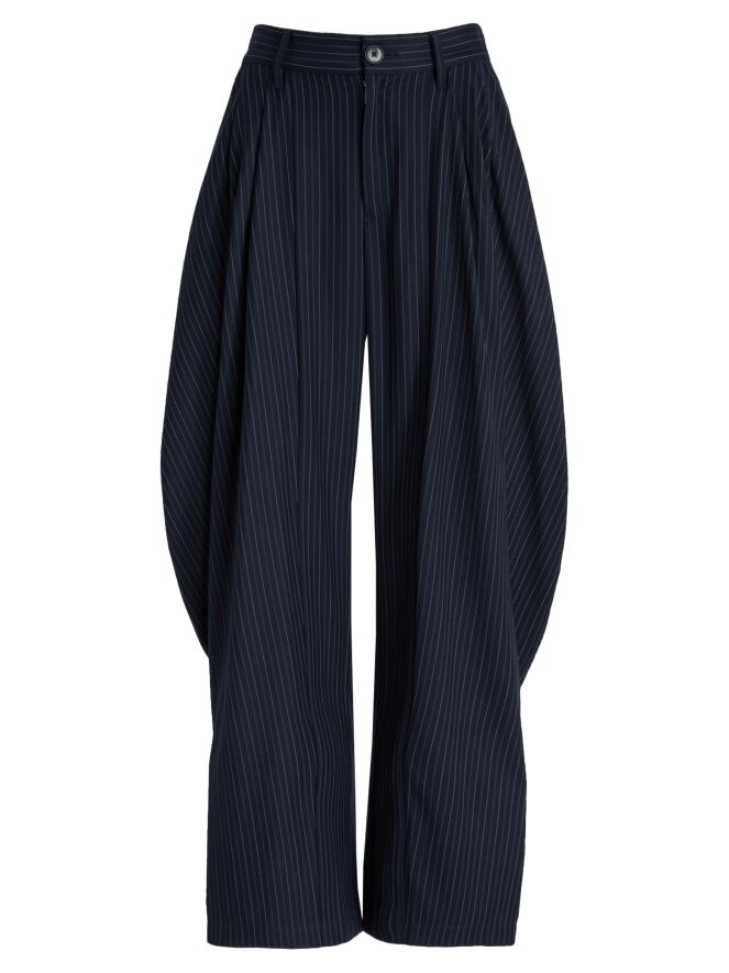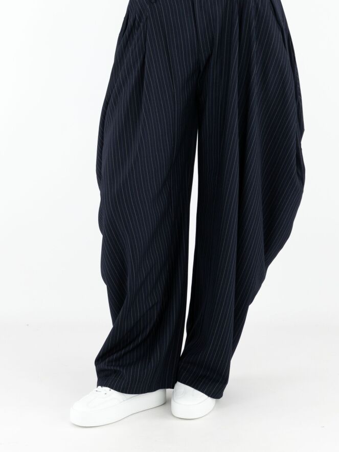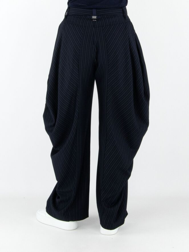 Pantalon High inspiré de l’univers équestre, réalisé dans un tissu à rayures marines avec des lignes bleues et écrues. Plusieurs plis partent de la taille, les plis plus larges sur les côtés accentuent l’effet ballon. Le pantalon est doté de poches latérales et doit être lavé à la main.