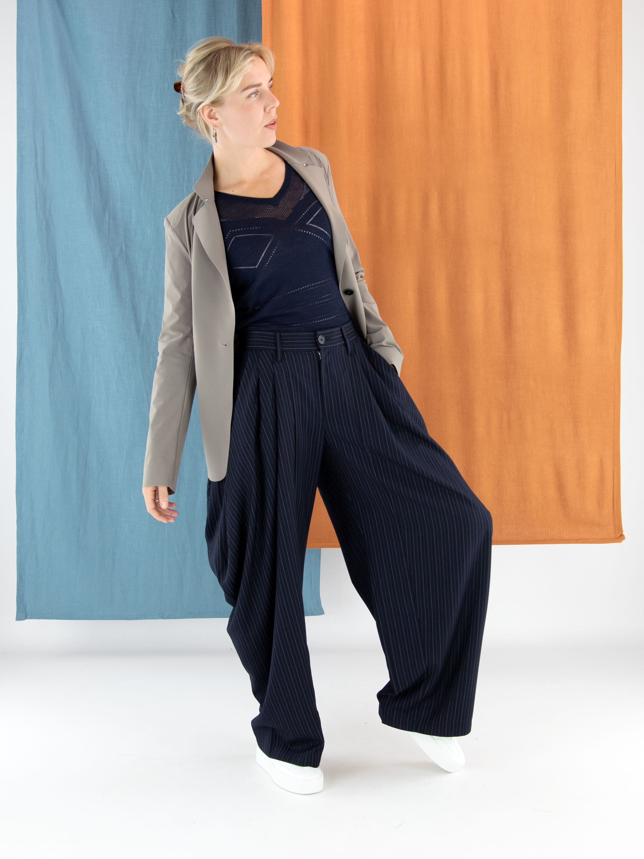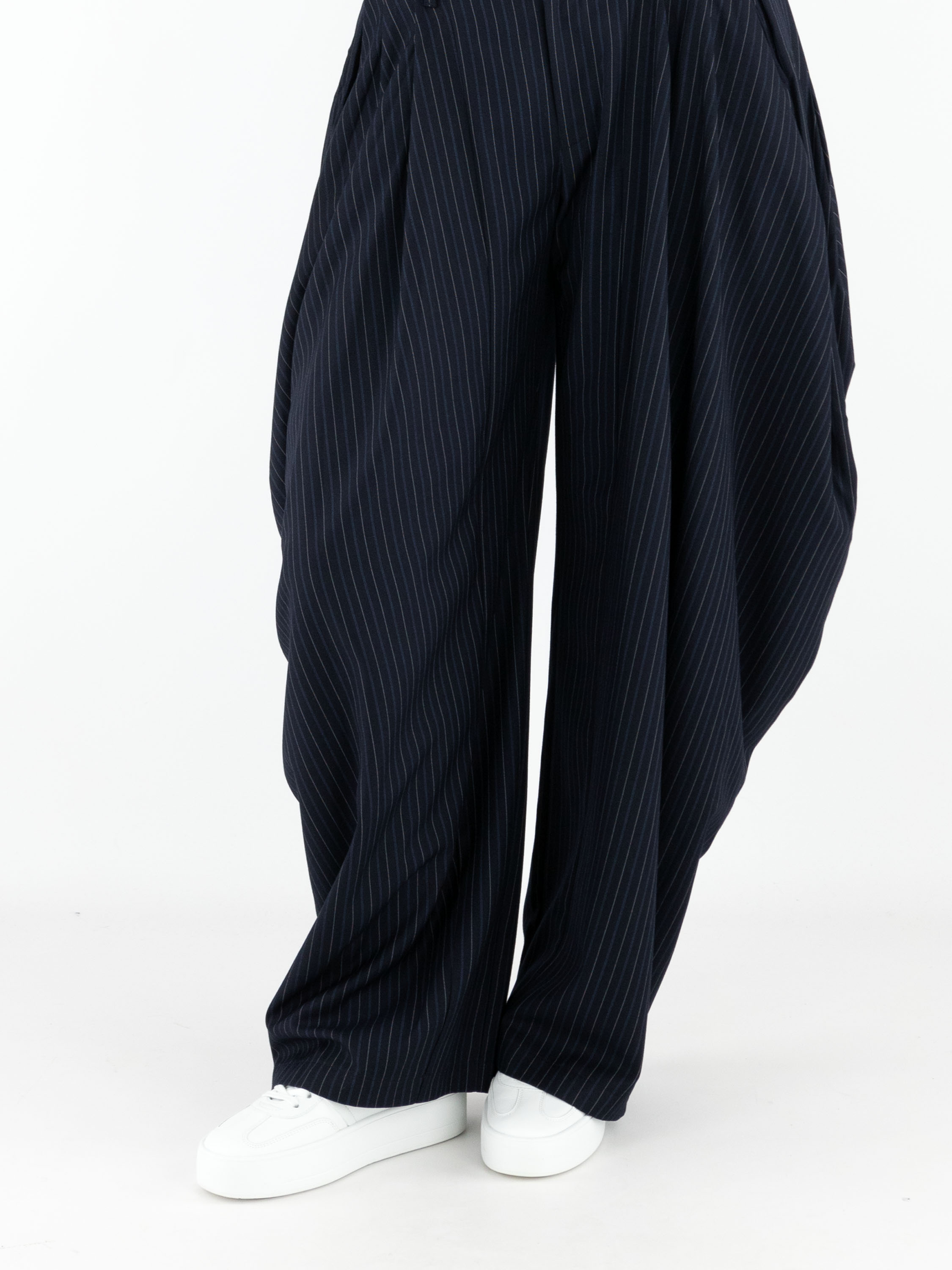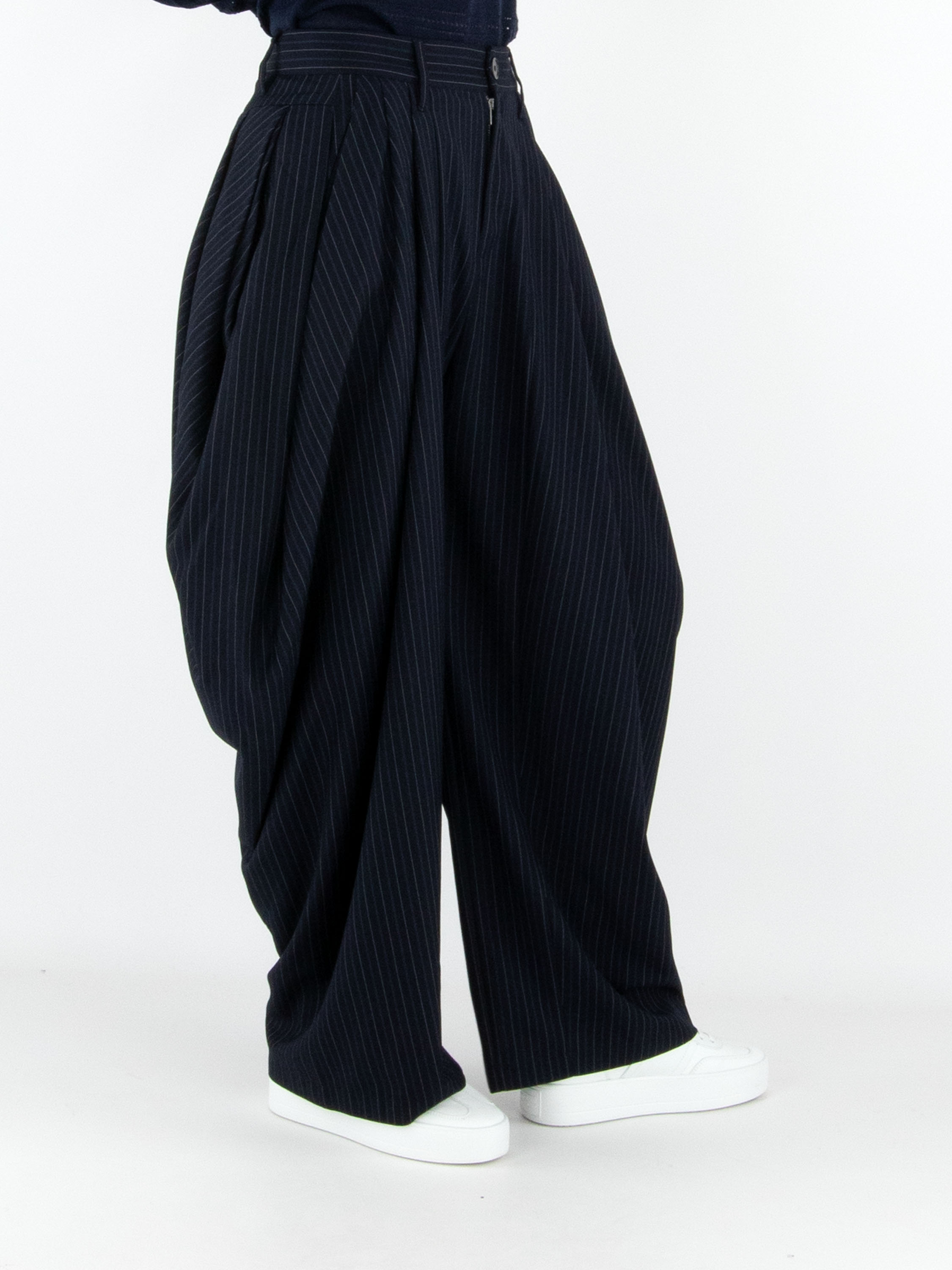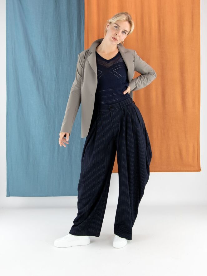Pantalon High inspiré de l’univers équestre, réalisé dans un tissu à rayures marines avec des lignes bleues et écrues. Plusieurs plis partent de la taille, les plis plus larges sur les côtés accentuent l’effet ballon. Le pantalon est doté de poches latérales et doit être lavé à la main.