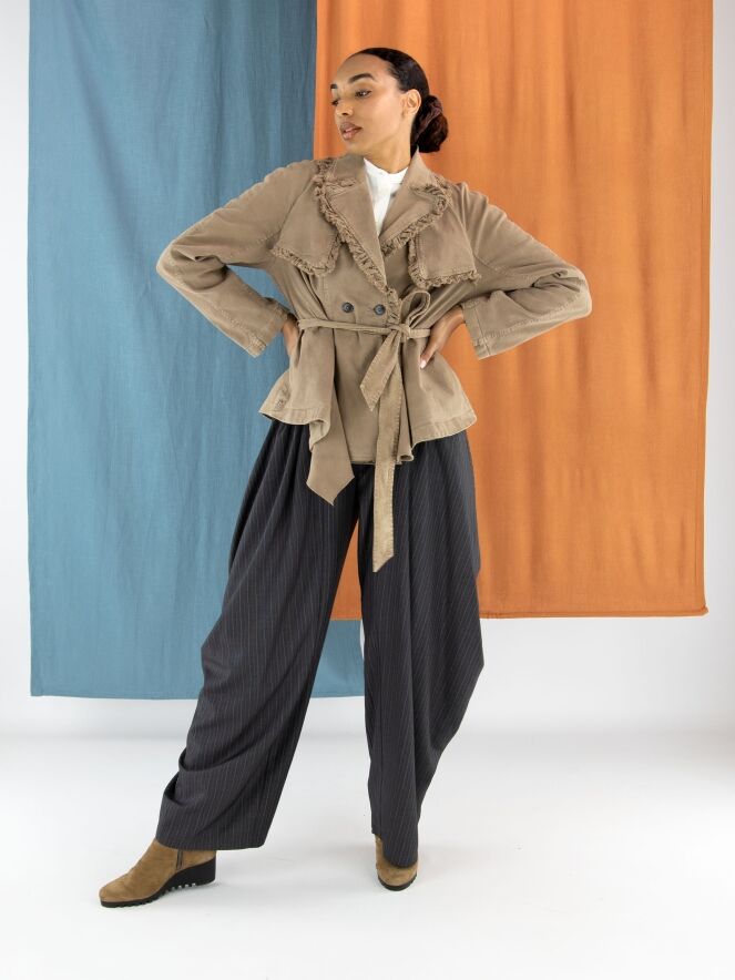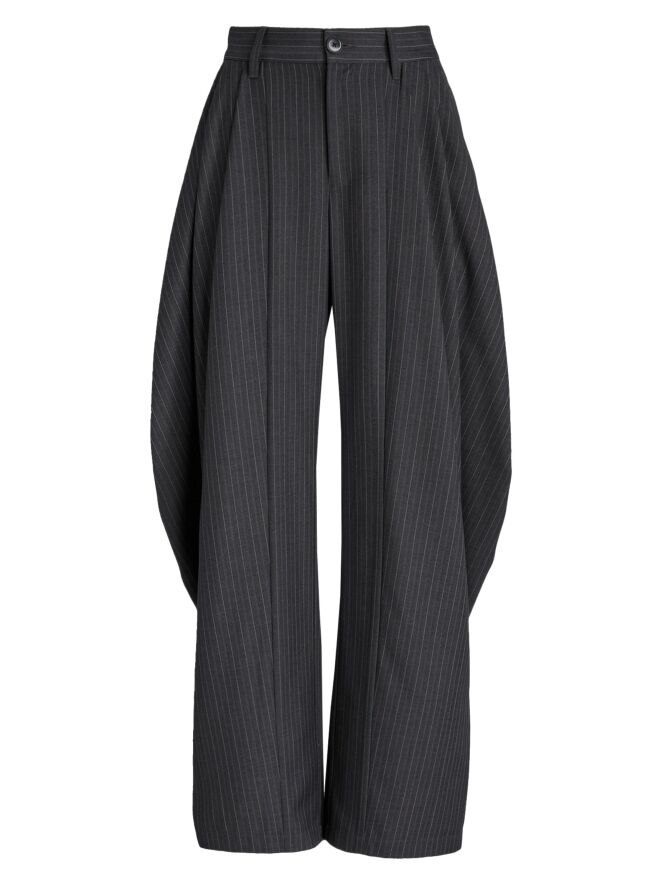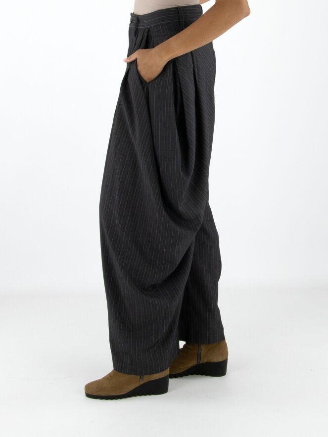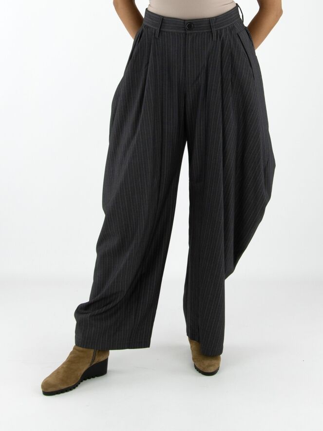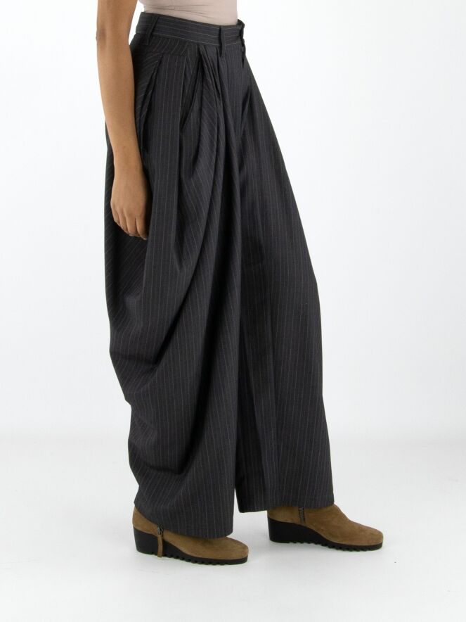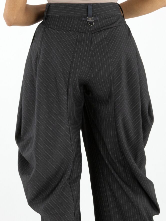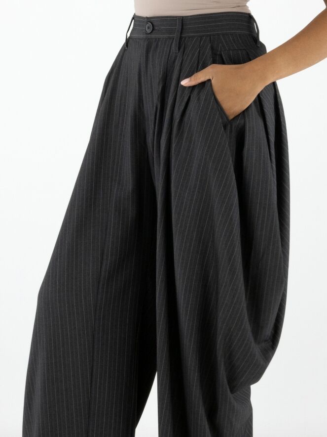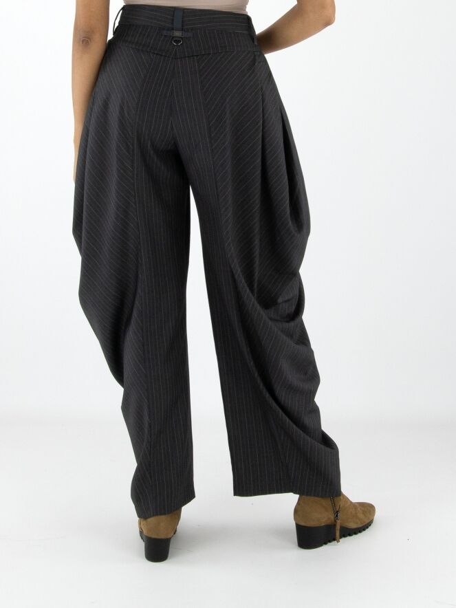 Pantalon High au style inspiré de l’équitation, avec un motif à rayures fines en gris, bleu et blanc cassé. Plusieurs plis partent de la taille, avec de larges plis latéraux pour accentuer l’effet ballon depuis la taille. Le pantalon possède des poches latérales et doit être lavé à la main.