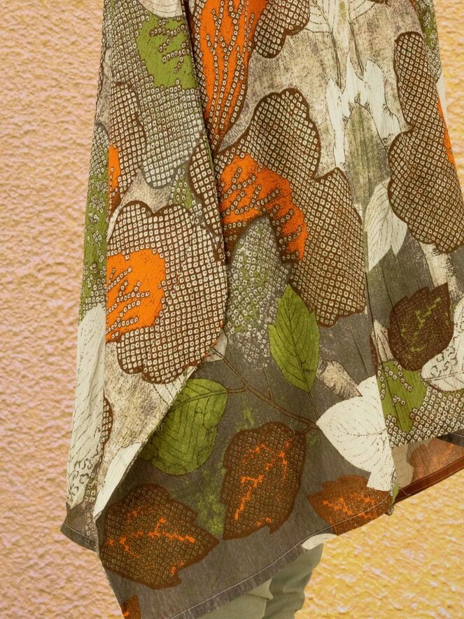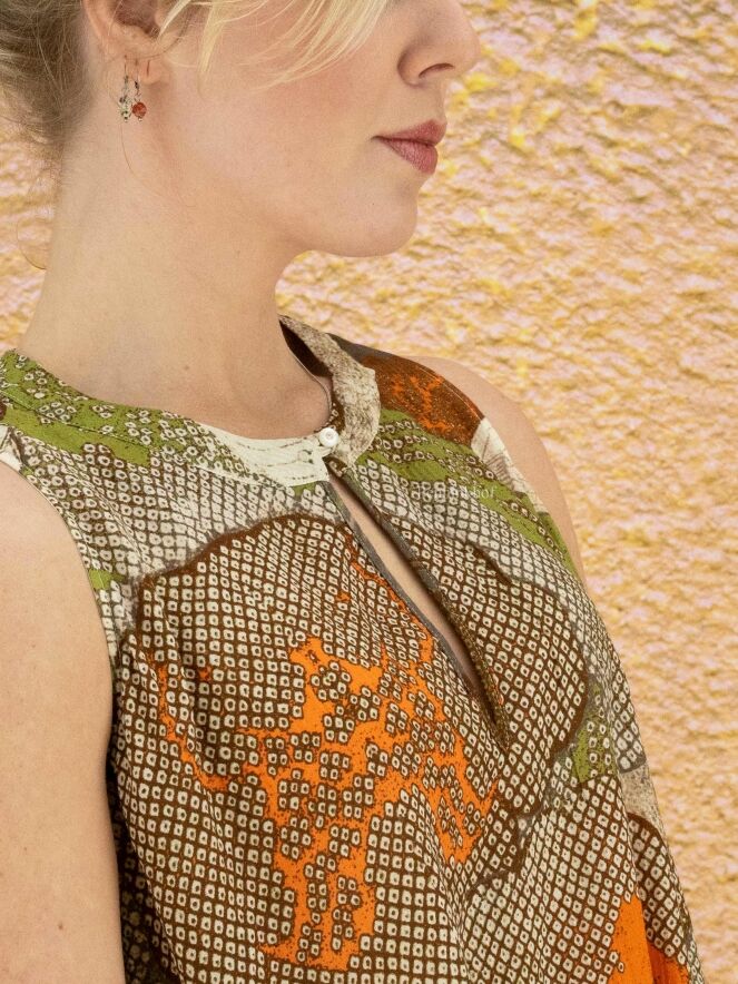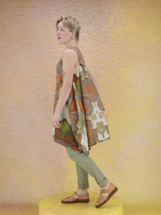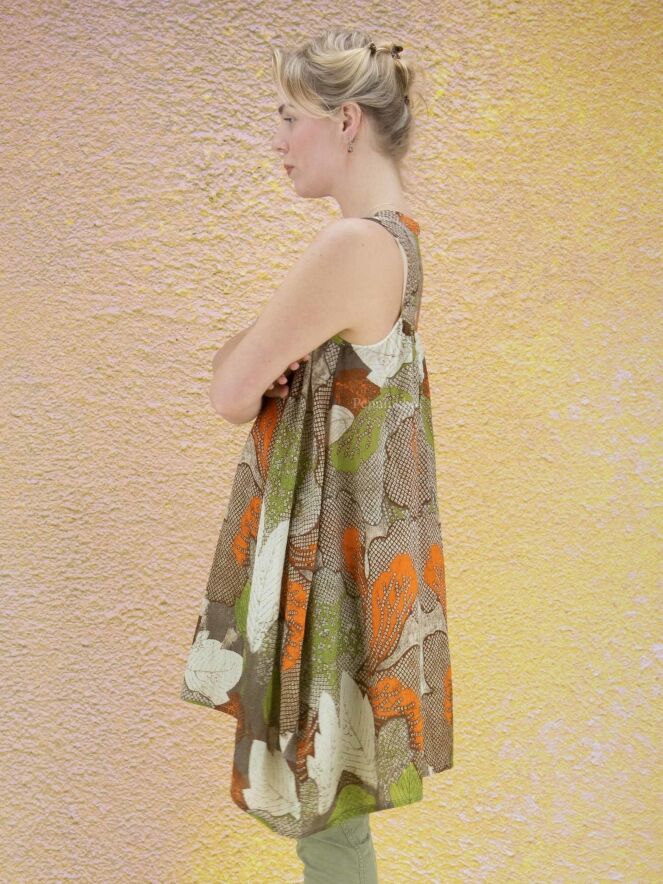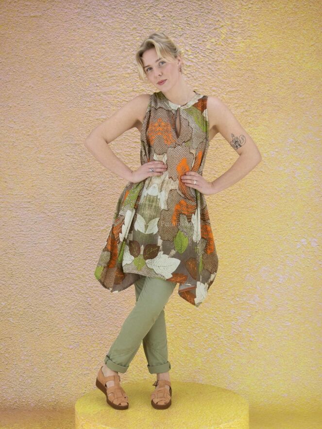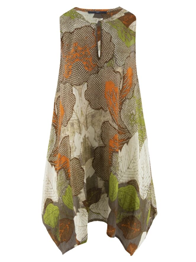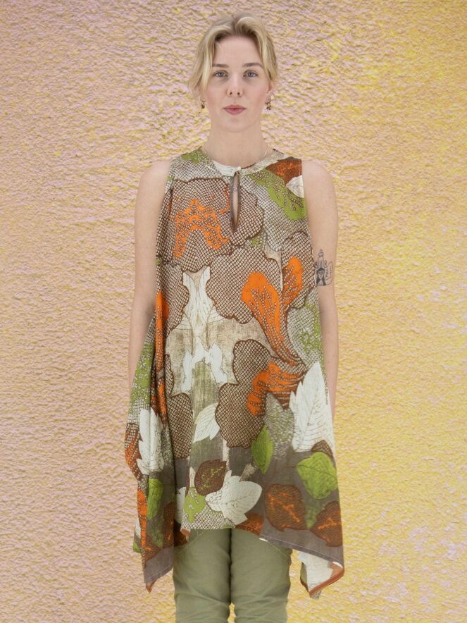 Tunique sans manches à la coupe ample de la marque High, à imprimé all-over avec un gros motif floral aux multiples nuances de vert, d'orange sur un fond taupe. Le col rond présente une ouverture centrale fermée par un petit bouton. La tunique présente une ligne A. L'ourlet du bas est découpé de manière asymétrique. Lavage à la main.
