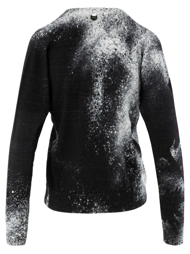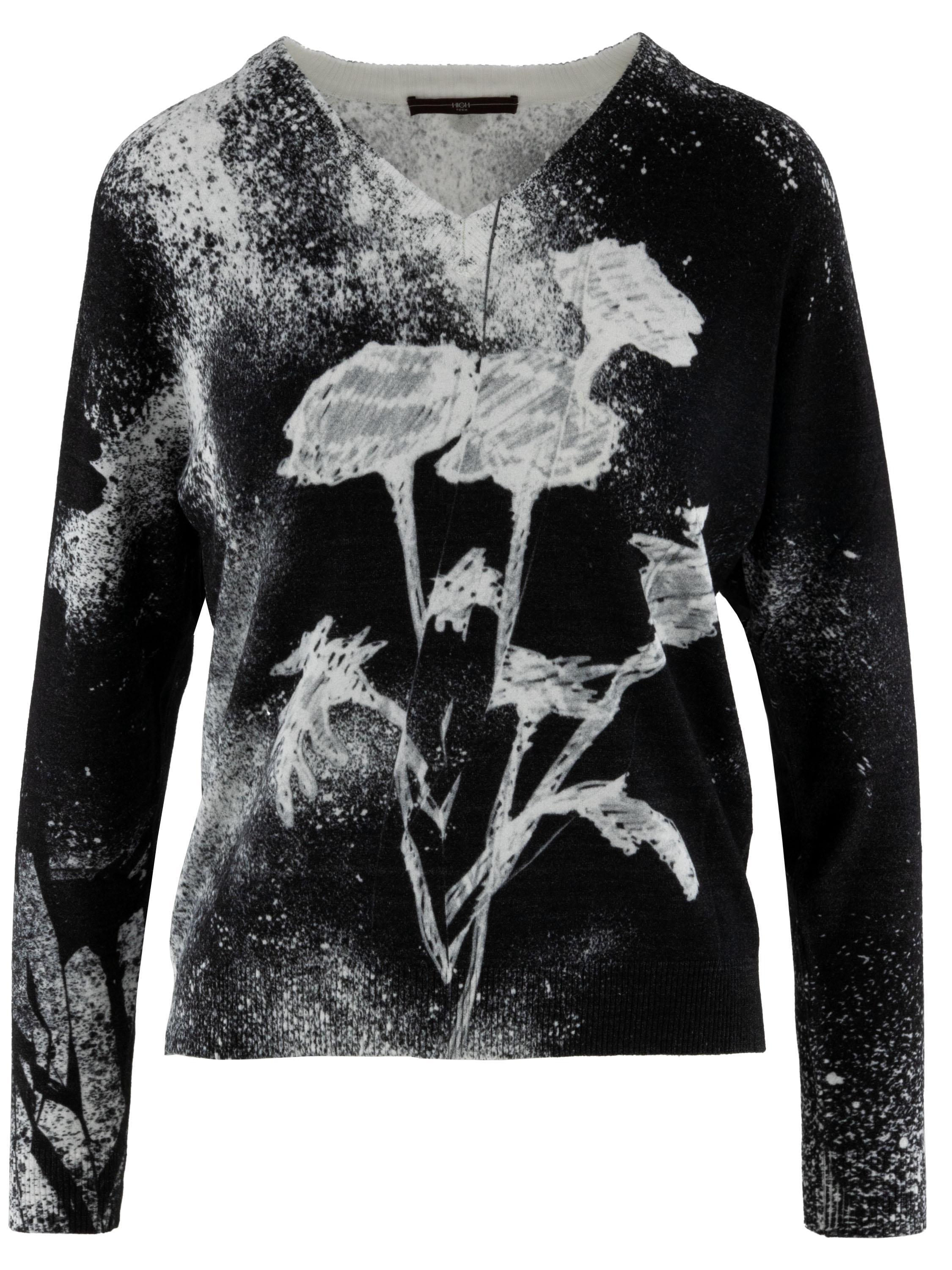 Un pull de High avec un imprimé floral graphique dans plusieurs nuances de noir sur un fond blanc cassé. Le pull présente un col en V bordé d’une finition en maille finement côtelée. Ce pull peut être lavé à la main.