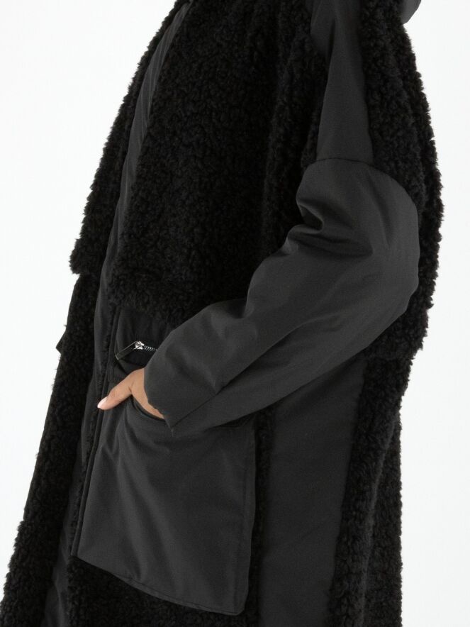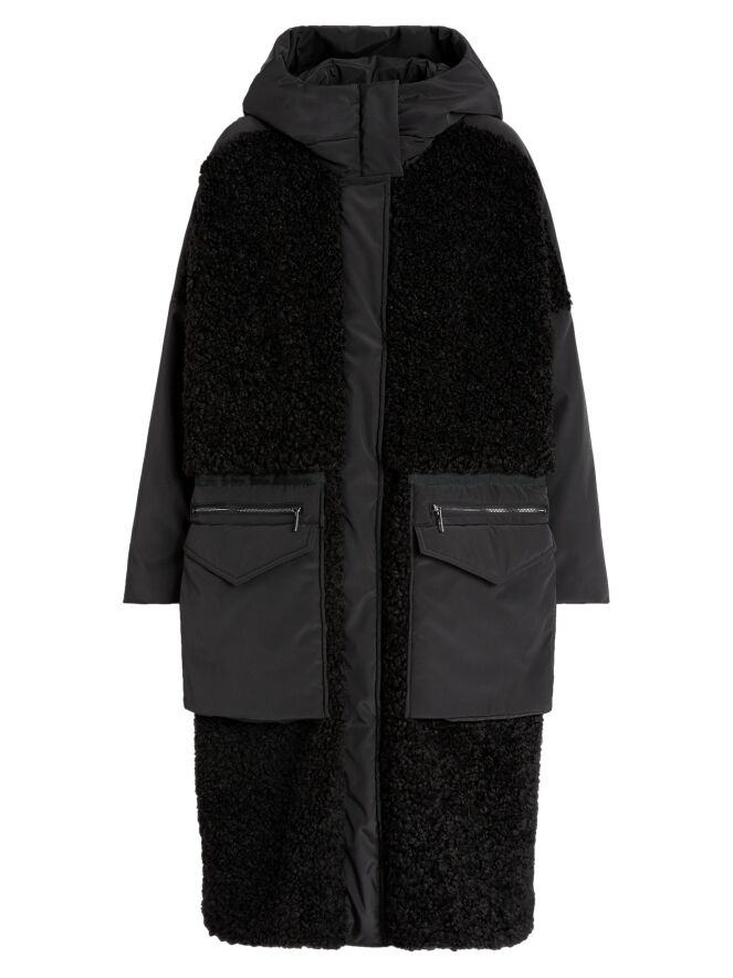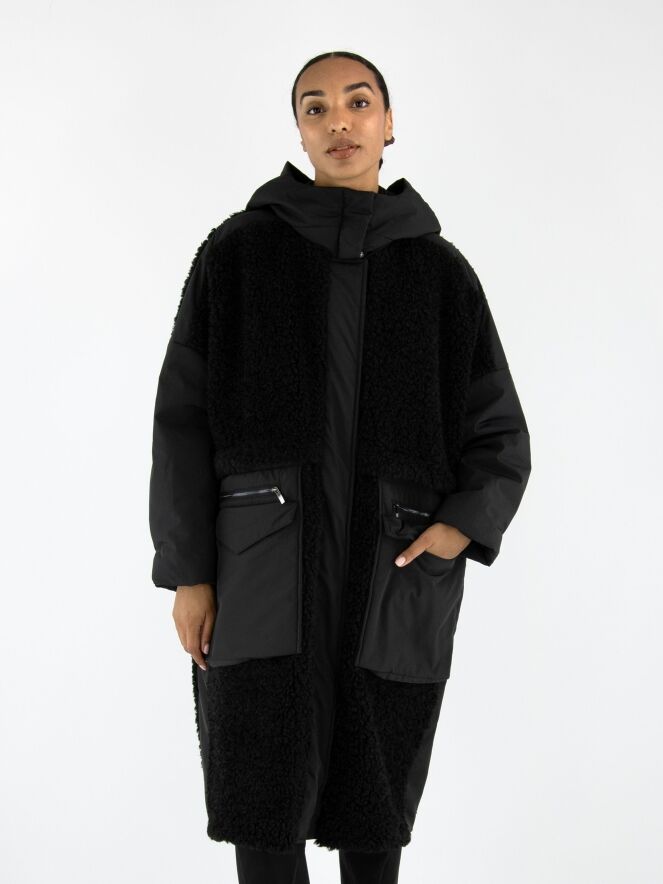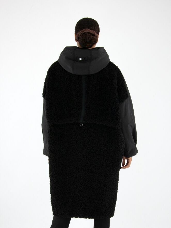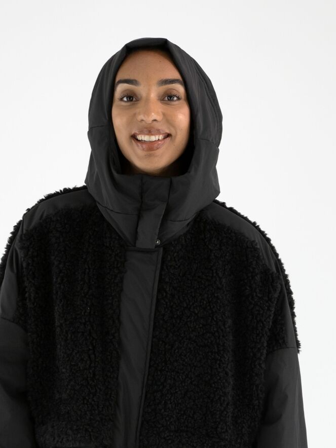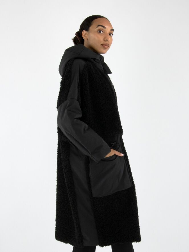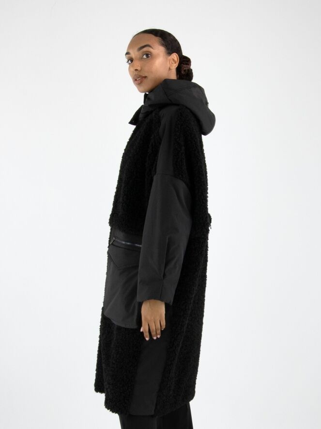 Un manteau de la marque High en noir. Le devant est en fausse fourrure bouclée jusqu’à la poitrine, puis en tissu parachute. Le dos est entièrement en fausse fourrure bouclée. Les grandes poches à l’avant sont munies de fermetures zippées. Ce manteau est doté d’une capuche et ne doit pas être lavé.