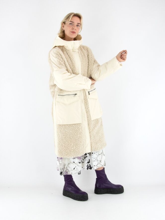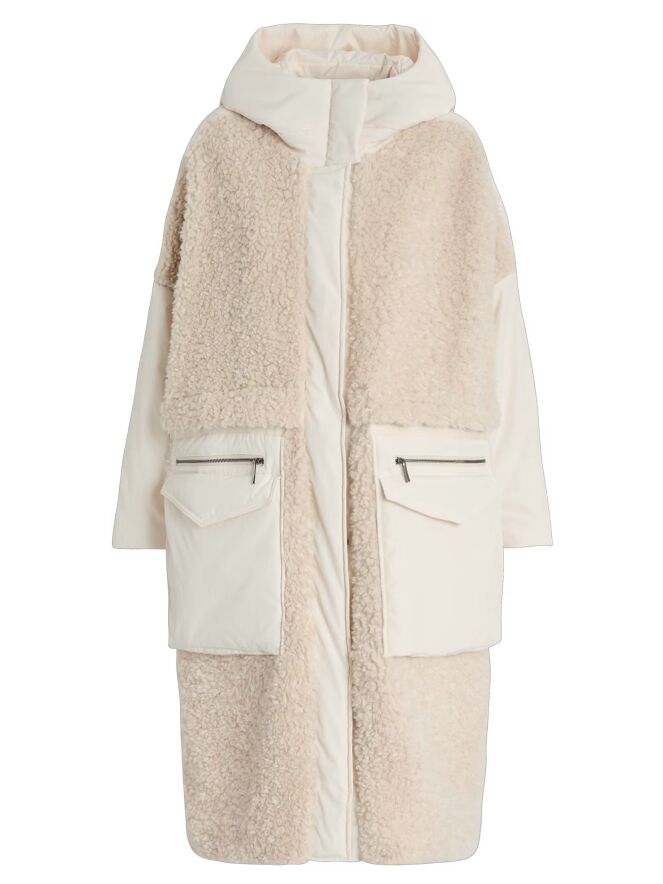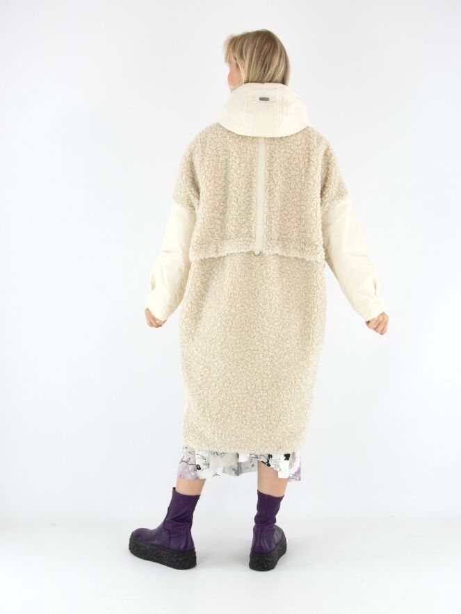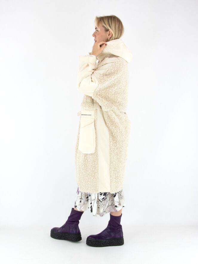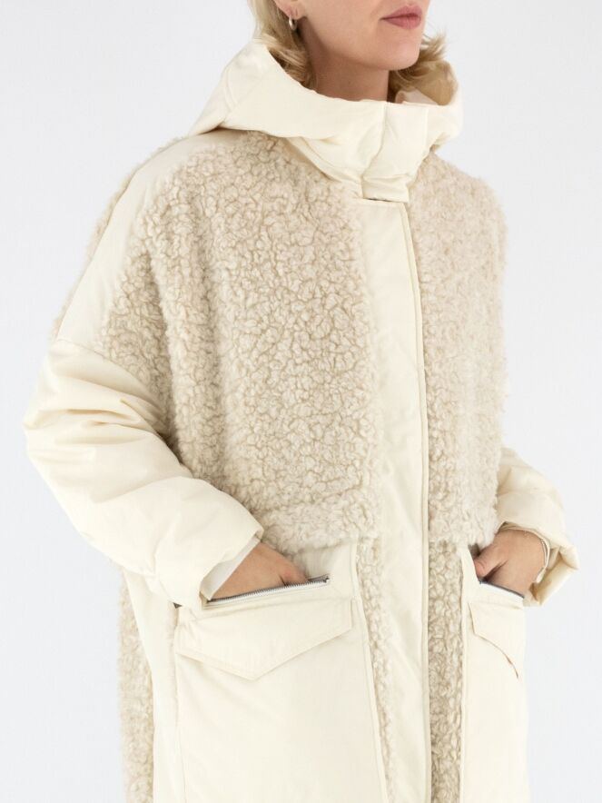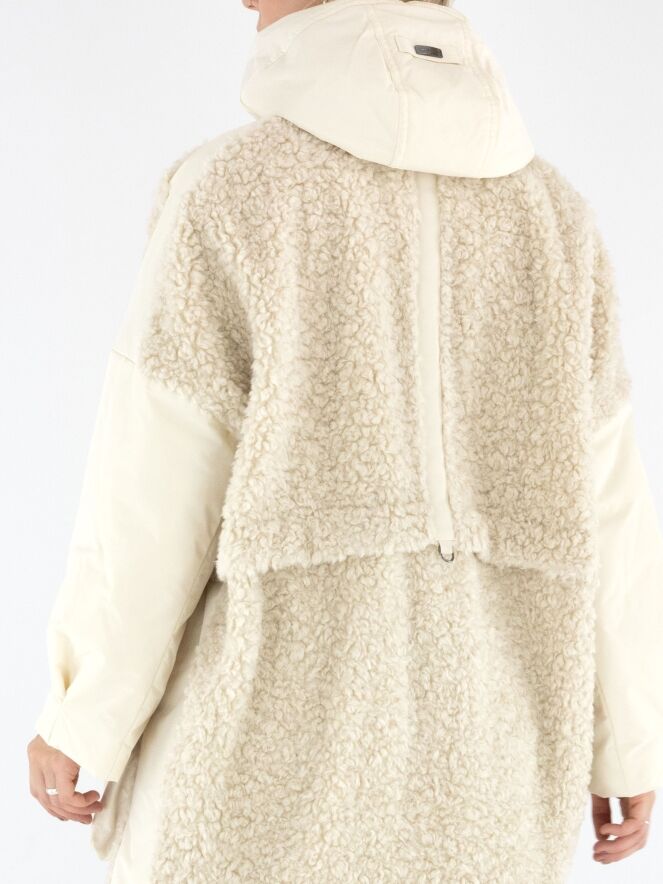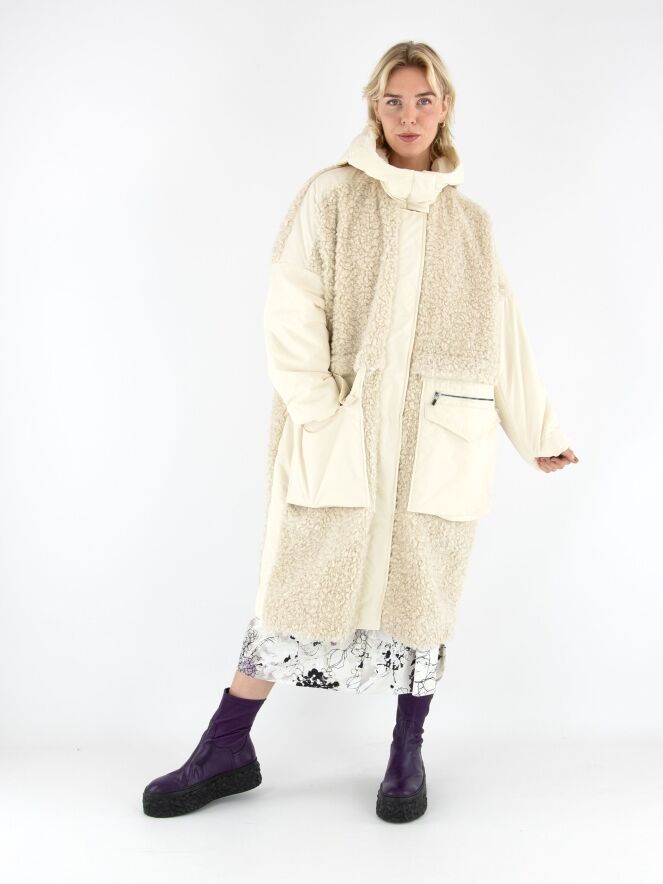 Un manteau de High en blanc crème. L’avant est réalisé en fausse fourrure bouclée jusqu’à la poitrine, puis se prolonge en tissu parachute. Le dos est entièrement confectionné en fausse fourrure bouclée. Les grandes poches à l’avant sont munies de fermetures éclair. Le manteau est doté d’une capuche et ne doit pas être lavé.