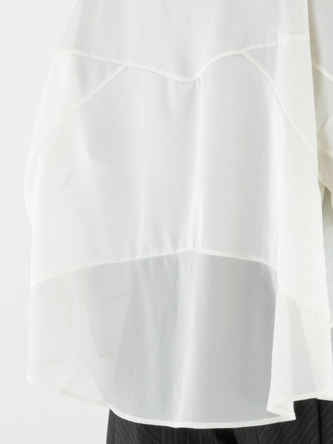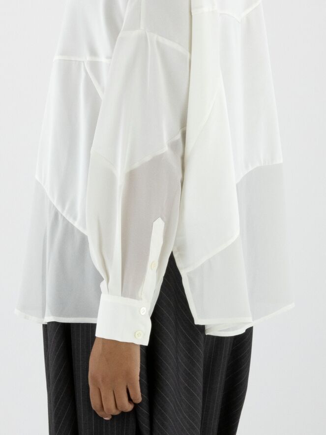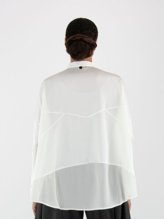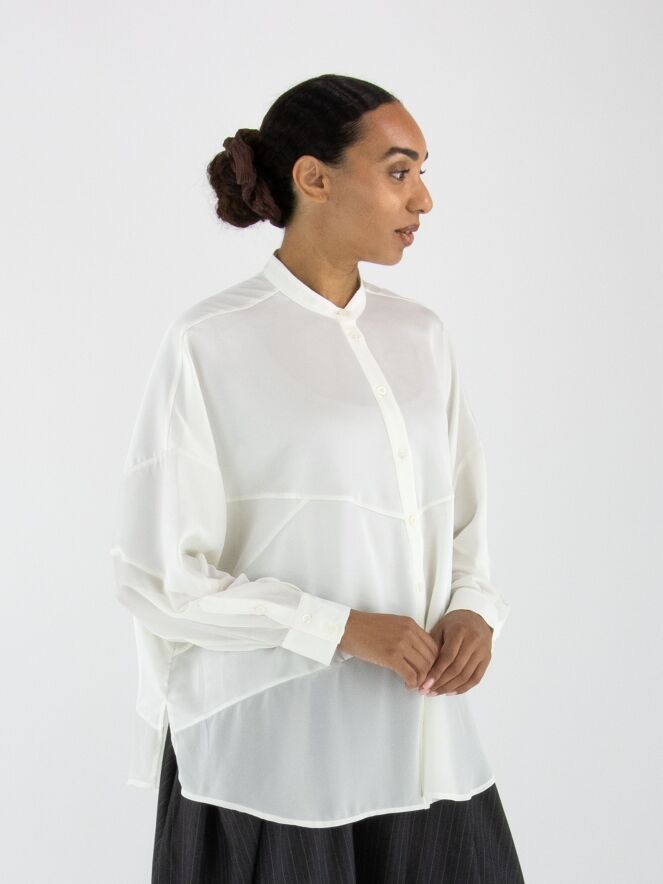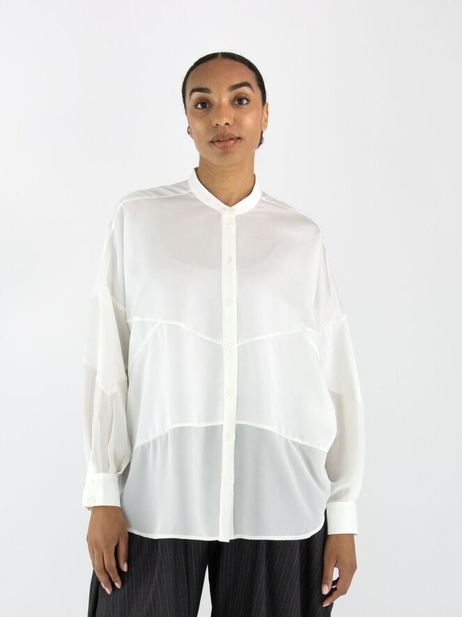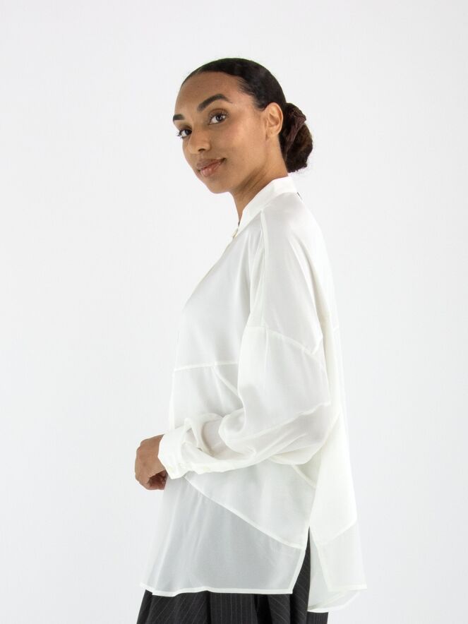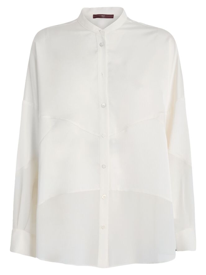 Blouse de la marque High en blanc cassé. Elle est confectionnée dans un mélange de satin mat et de tissu mat légèrement transparent. Cette blouse peut être lavée à 30 degrés.