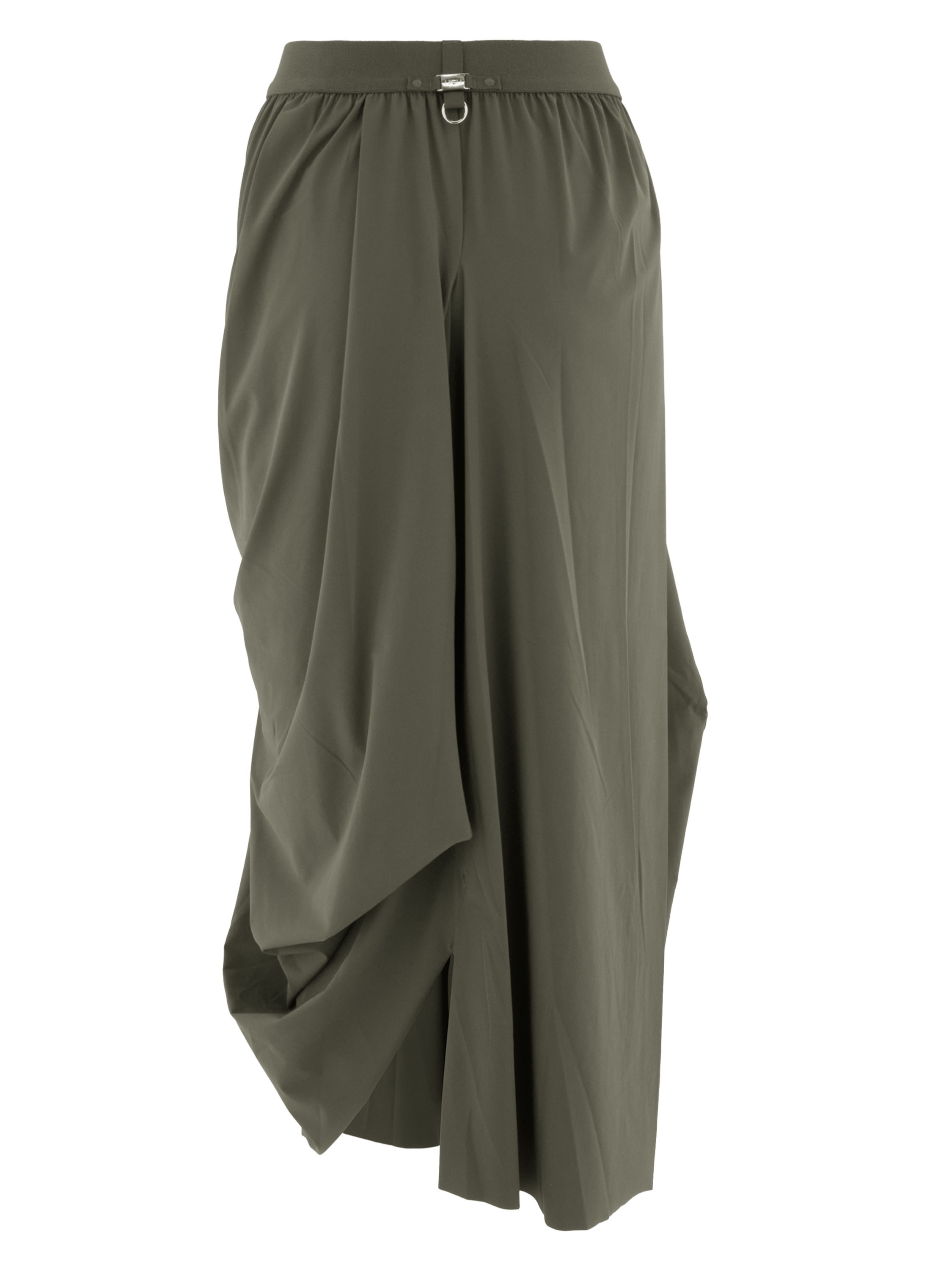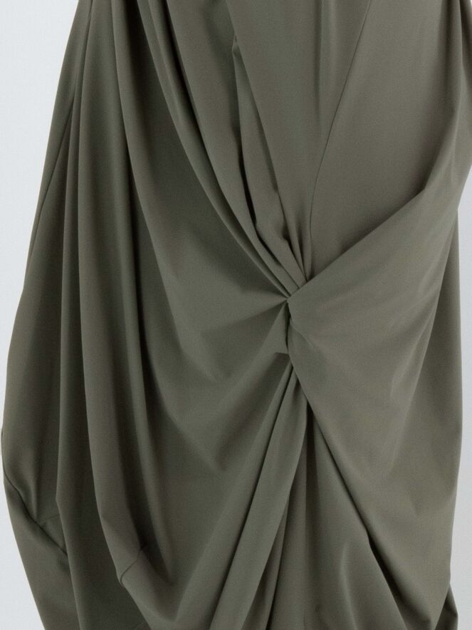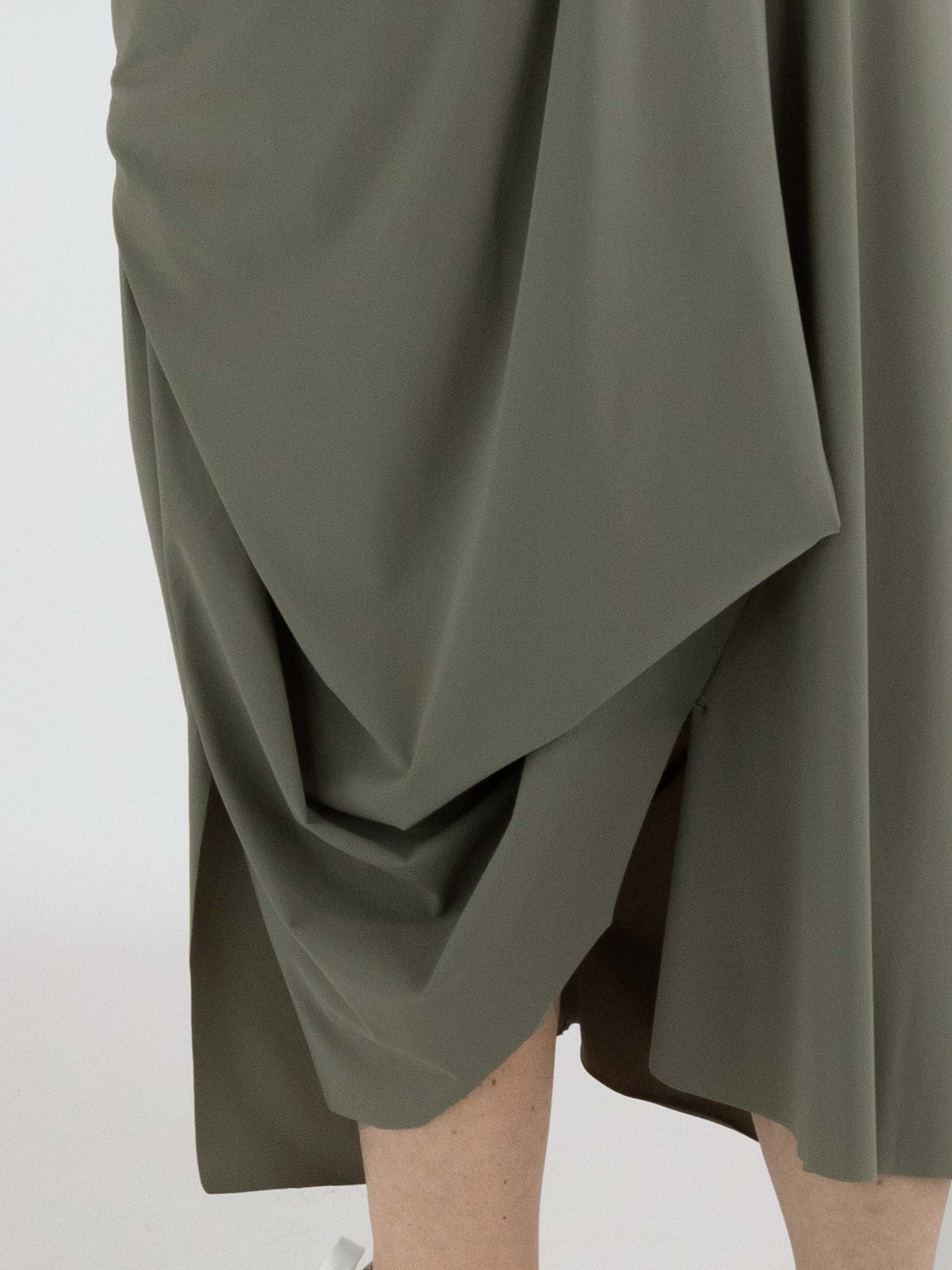Une jupe de High Tech en vert olive. La taille est dotée d’une bande élastique. Depuis la ceinture, sur le côté droit, plusieurs plis créent un effet drapé vers le bas. À hauteur du genou, sur le côté gauche, un lien de resserrage crée un effet plissé. Cette jupe peut être lavée à 30 degrés.