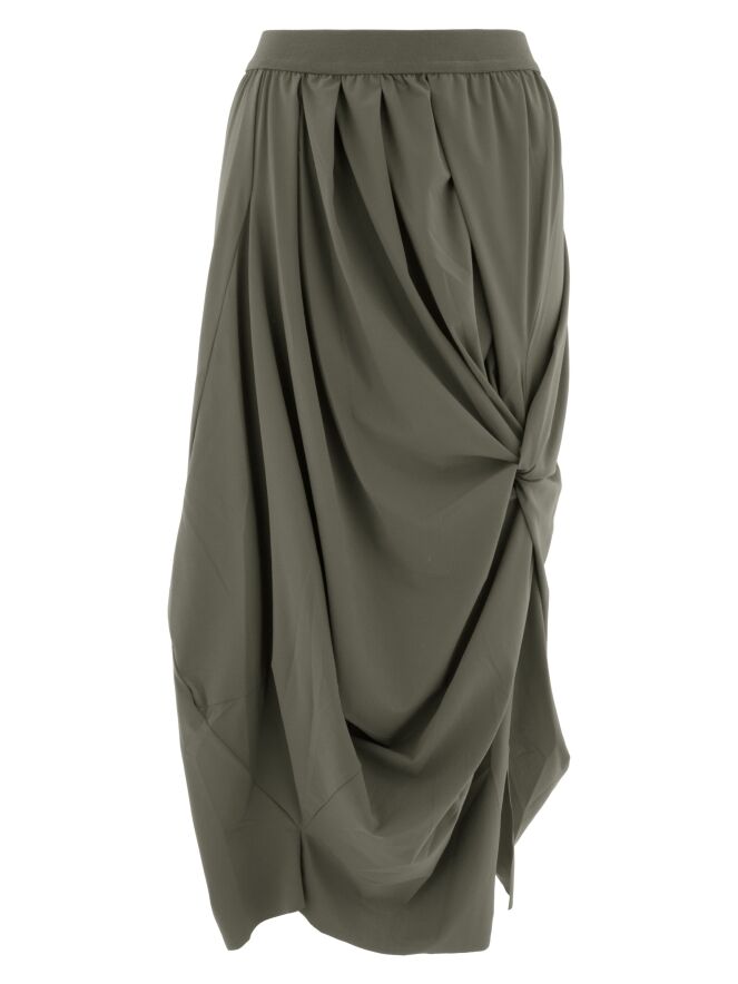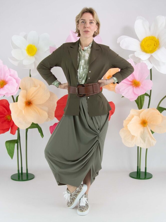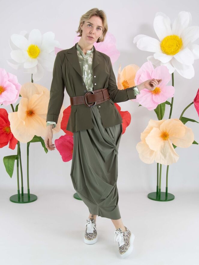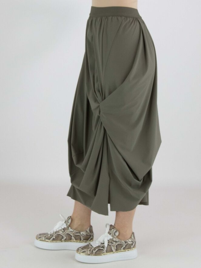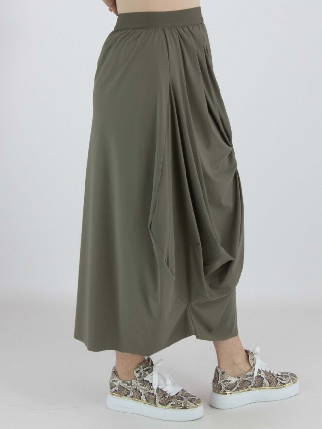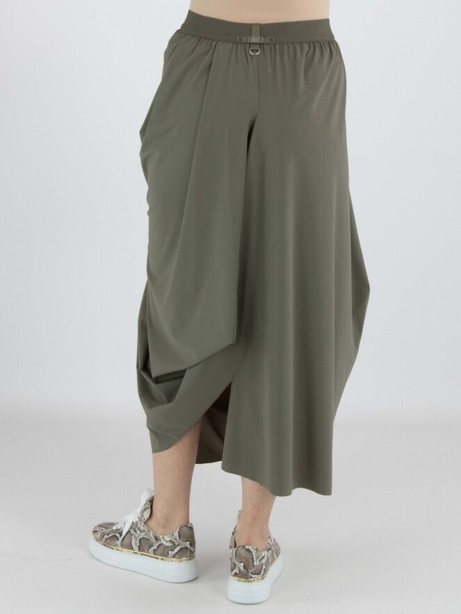 Une jupe de High Tech en vert olive. La taille est dotée d’une bande élastique. Depuis la ceinture, sur le côté droit, plusieurs plis créent un effet drapé vers le bas. À hauteur du genou, sur le côté gauche, un lien de resserrage crée un effet plissé. Cette jupe peut être lavée à 30 degrés.