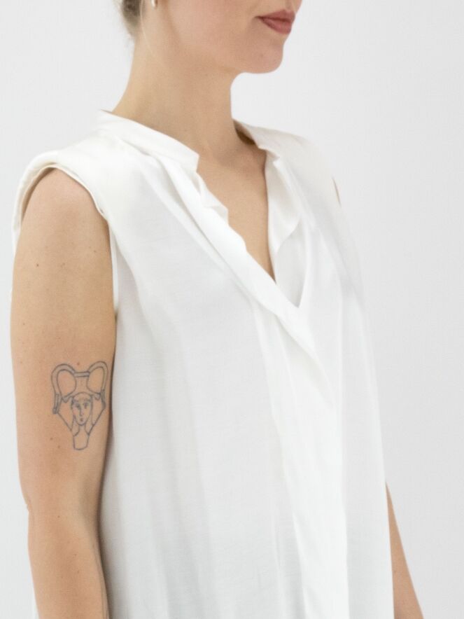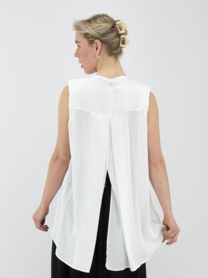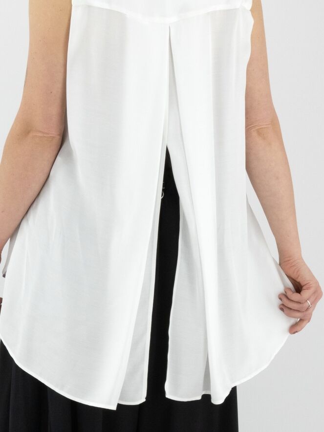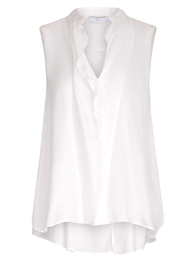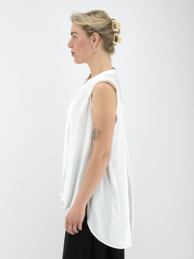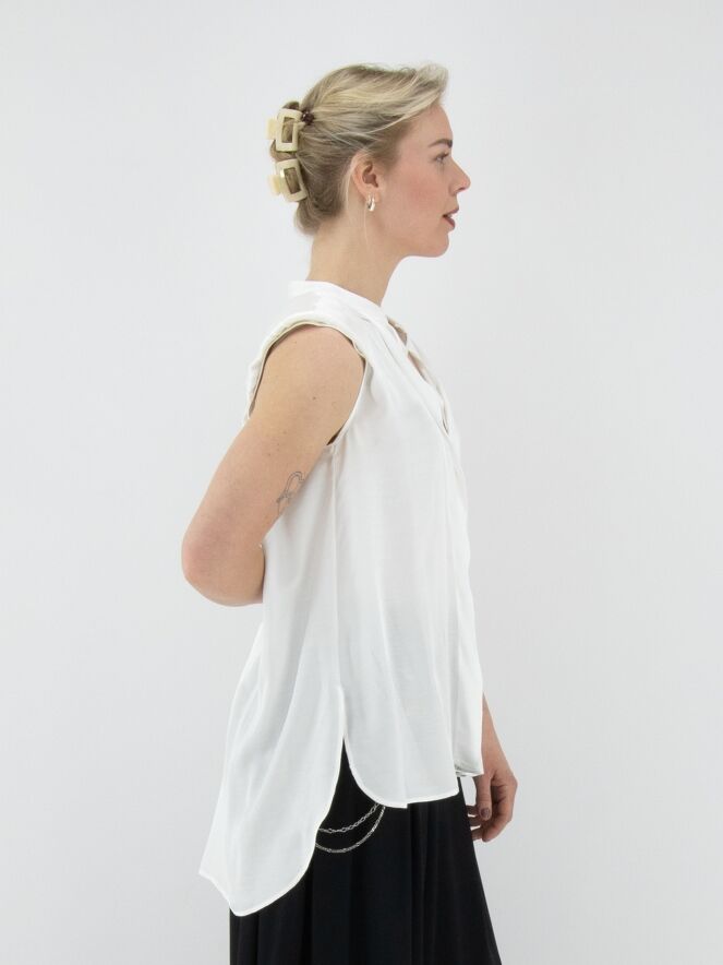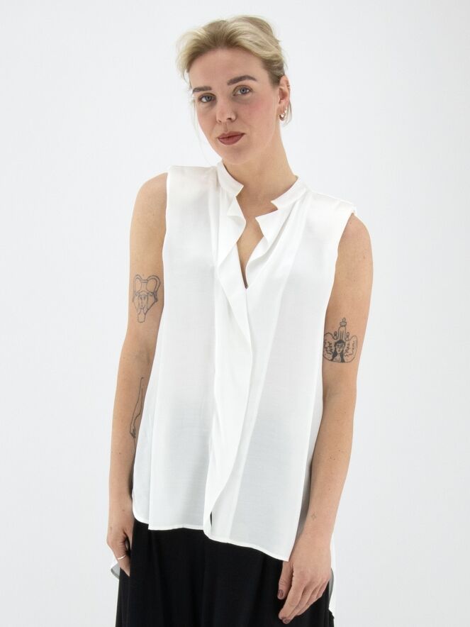 Un top long en satin mat de High en blanc crème. Un volant descend depuis la pointe du col en V. À l’arrière, un pli est intégré depuis la couture centrale entre les omoplates. Les épaules sont dotées de rembourrage. Ce top ne doit pas être lavé.
