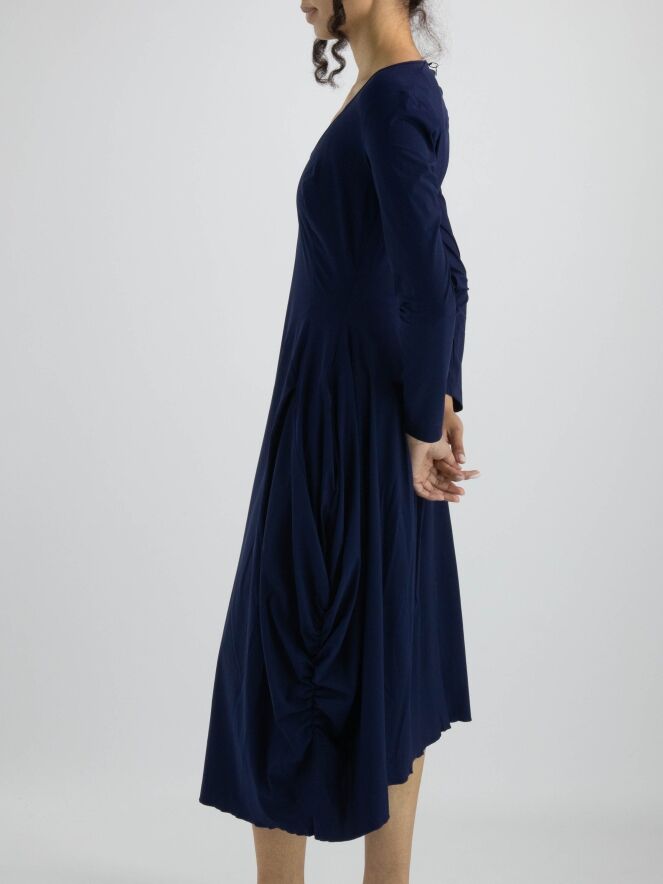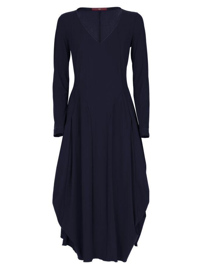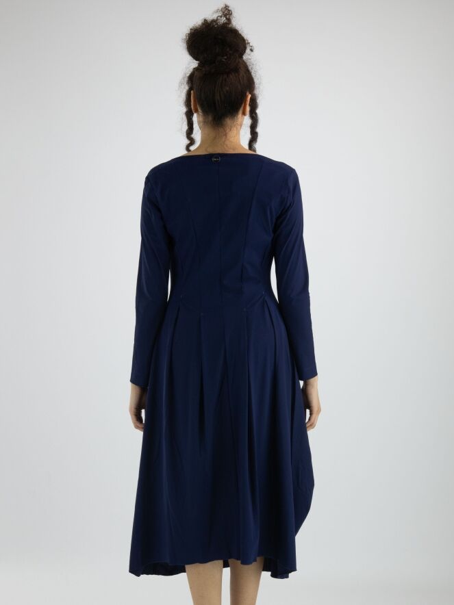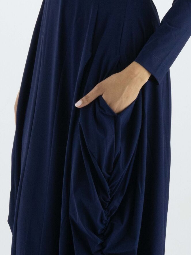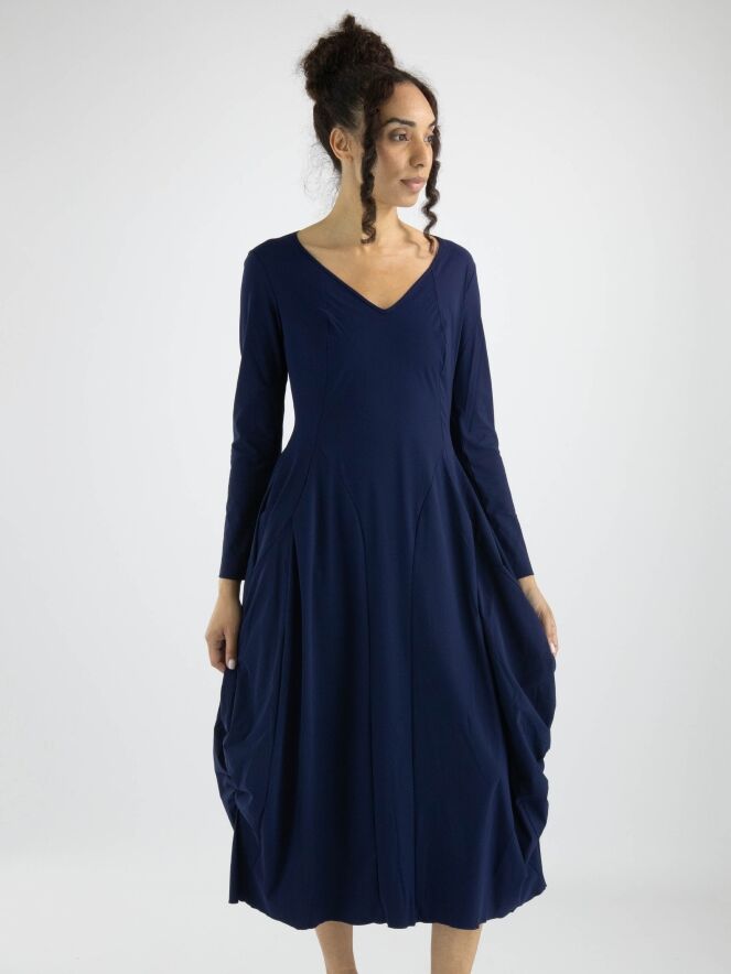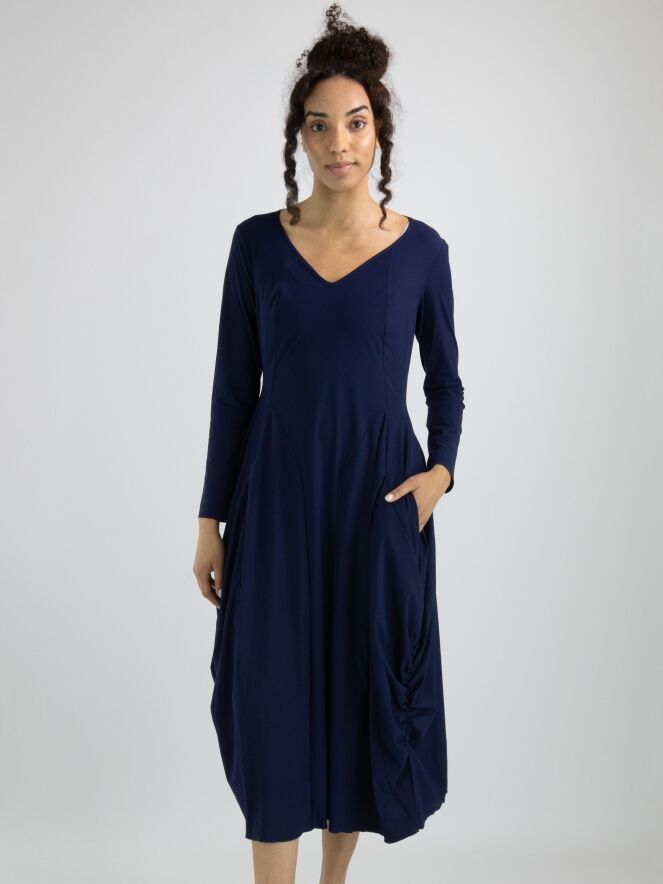 Une robe de High en bleu indigo. La robe présente un col en V avec des manches longues et un effet ballon à partir de la taille. Il y a des poches latérales à la taille. Cette robe peut être lavée à 30 degrés.