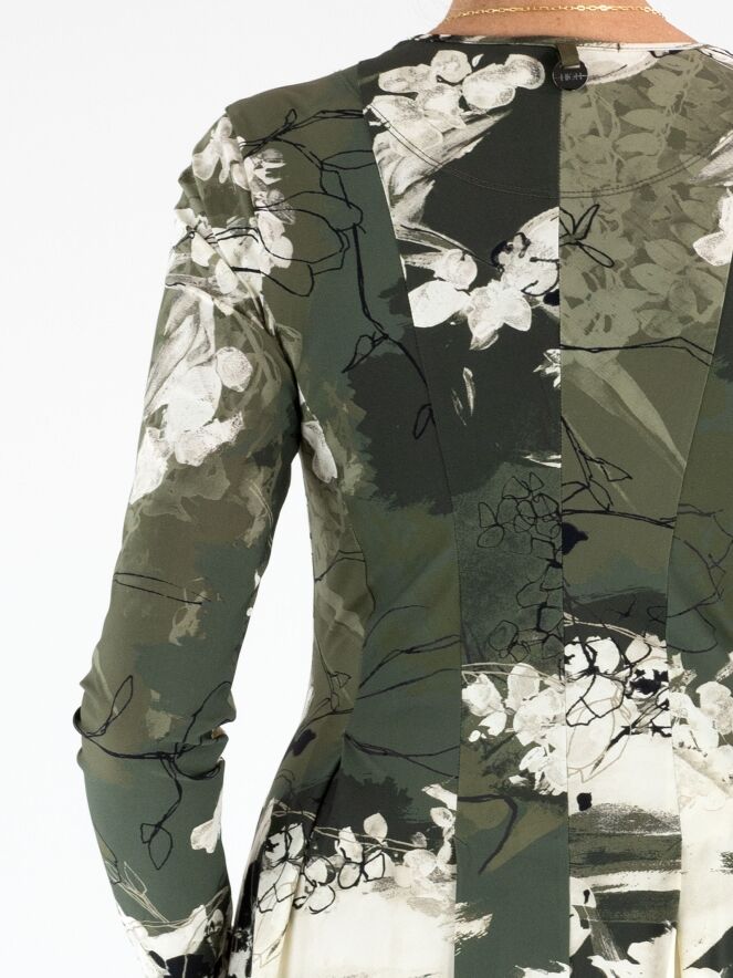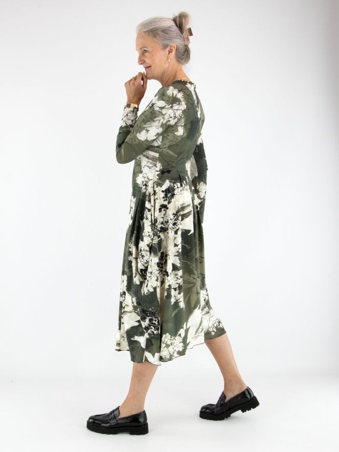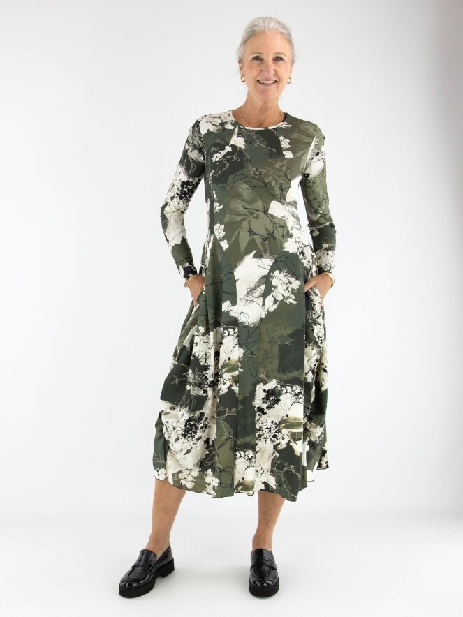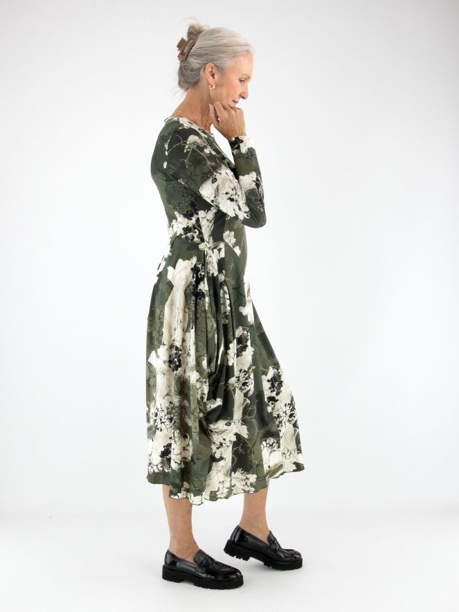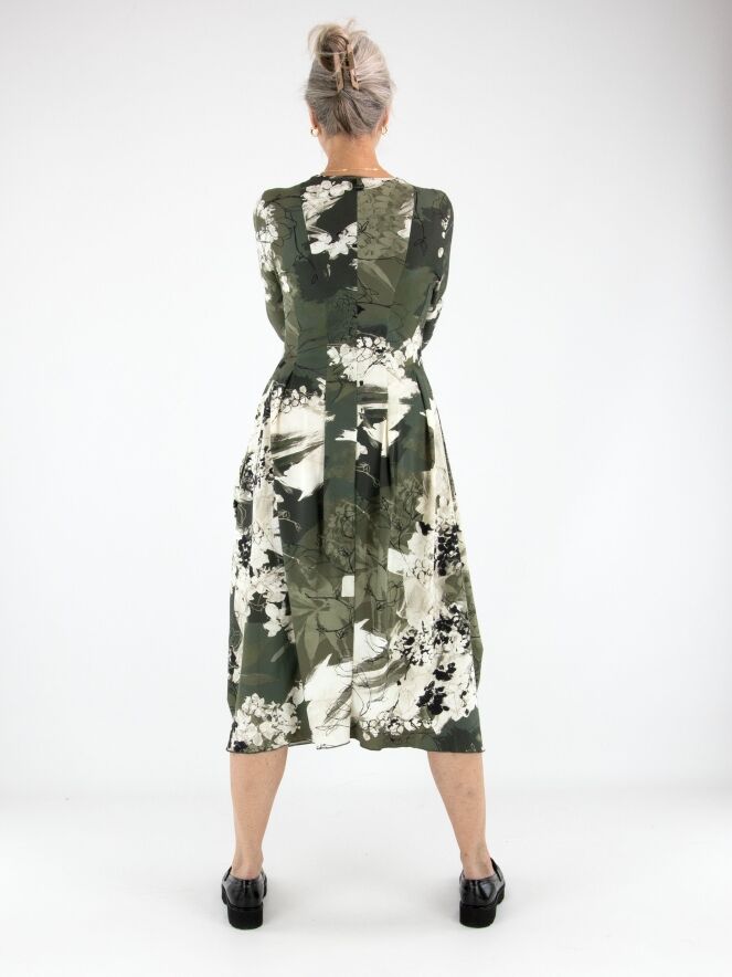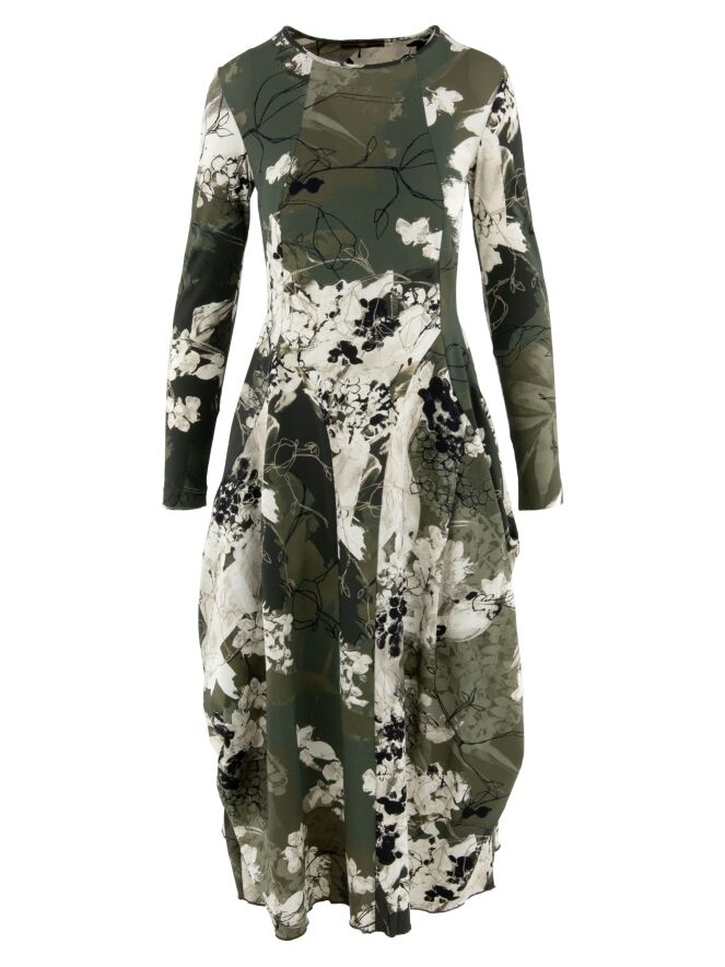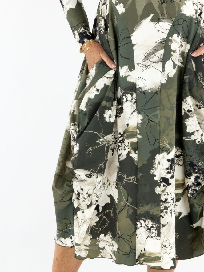 Robe de High à motif floral graphique en nuances de noir et vert olive sur fond blanc cassé. Dotée d’un col rond et de manches longues, elle possède des poches discrètes à hauteur de taille. À partir de la taille, la coupe s’évase dans un élégant effet ballon, offrant une allure contemporaine et féminine. Cette robe de créateur exclusive peut être lavée à 30 degrés.