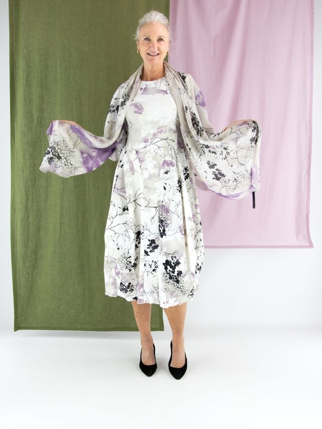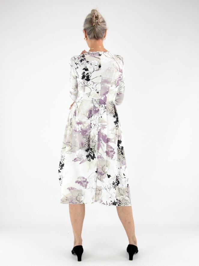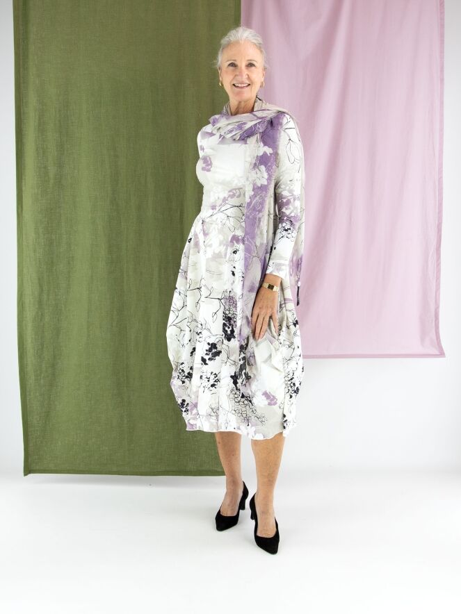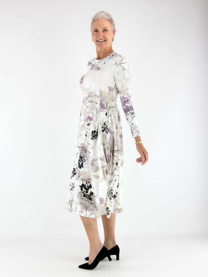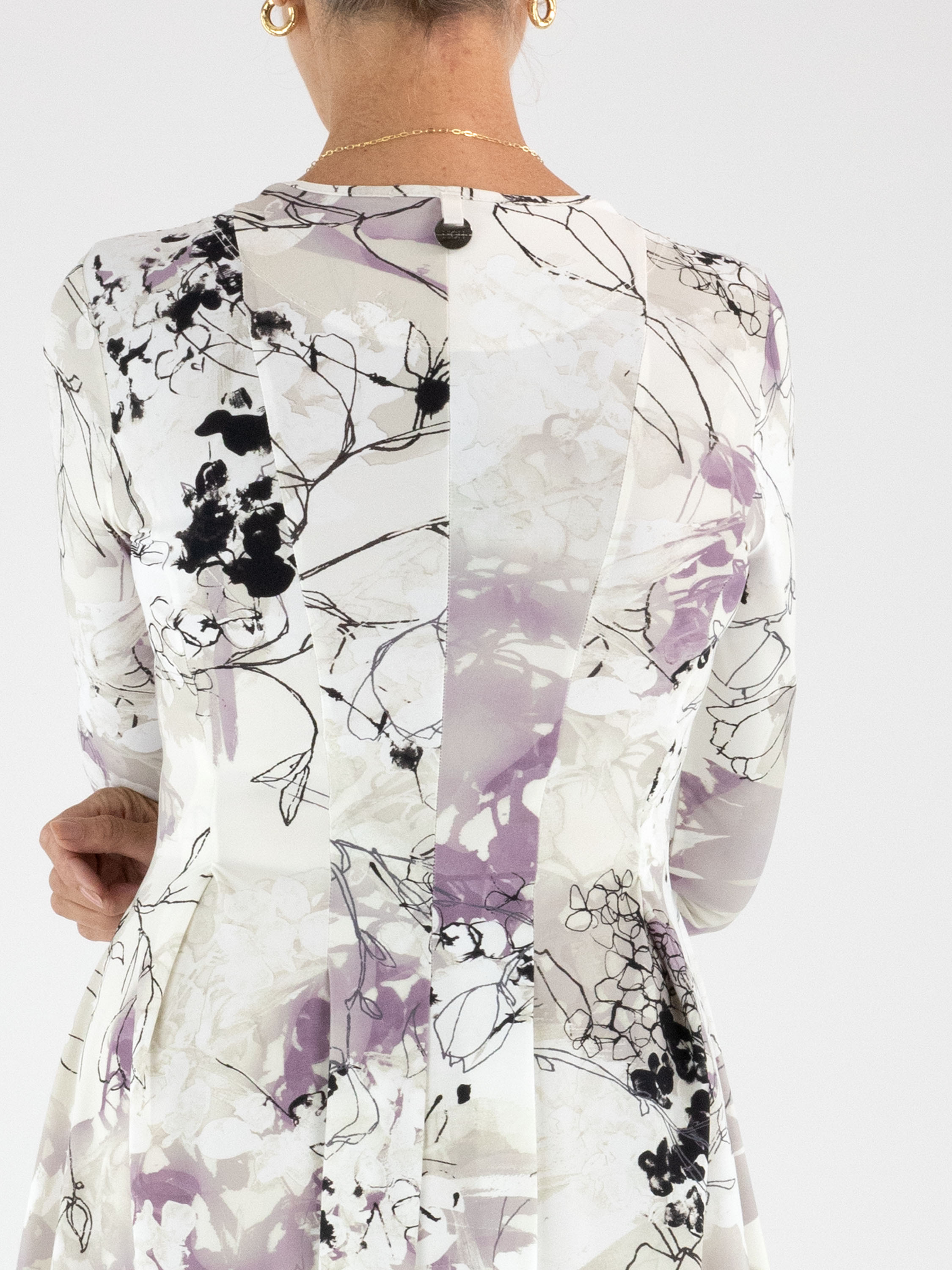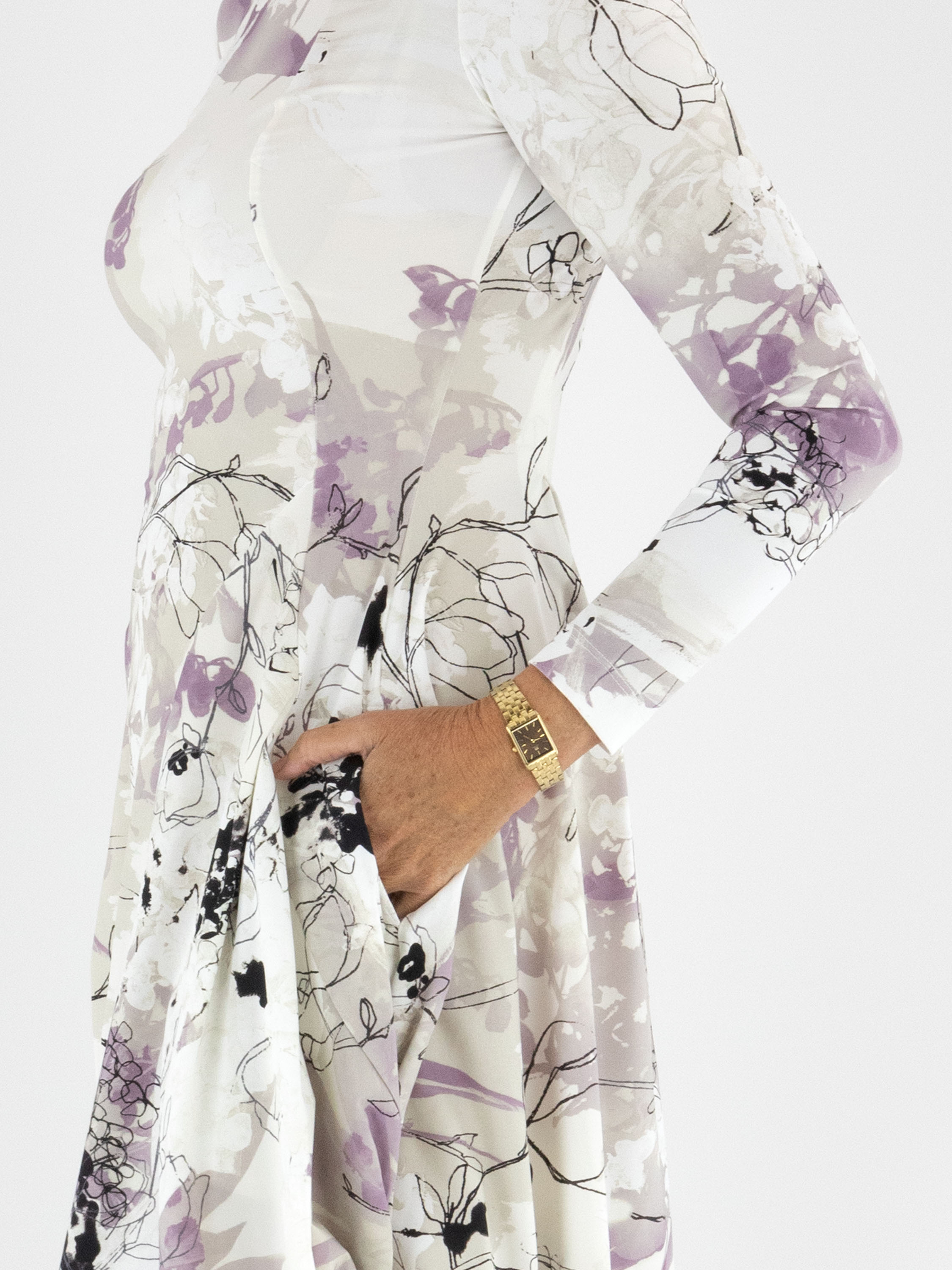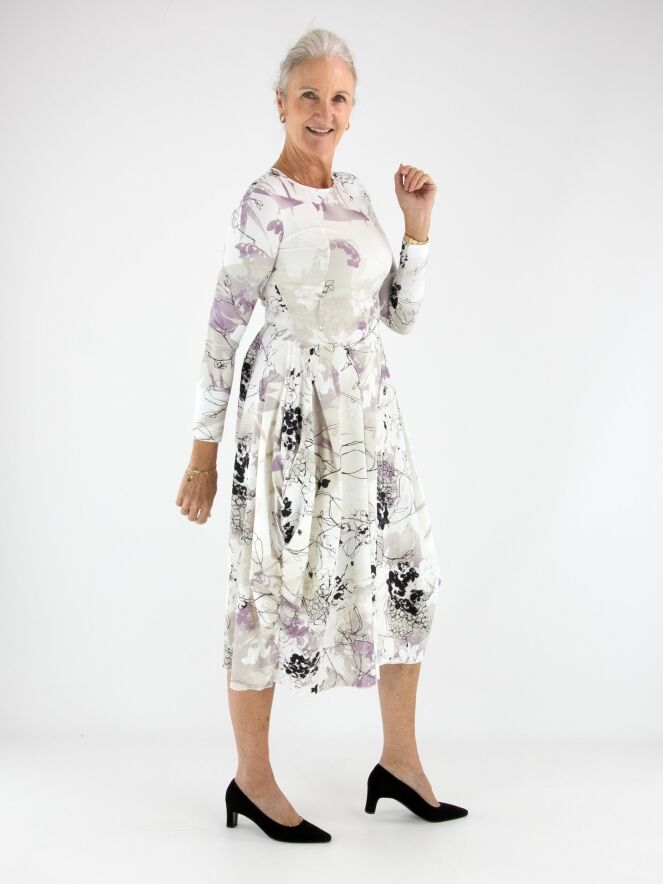 Robe de High avec un imprimé floral graphique dans des tons de lilas, beige et noir sur fond blanc cassé. Dotée d’un col rond et de manches longues, elle possède des poches discrètes à la taille. À partir de la taille, un subtil effet ballon crée une silhouette féminine et contemporaine. Cette robe de créateur exclusive peut être lavée à 30 degrés.