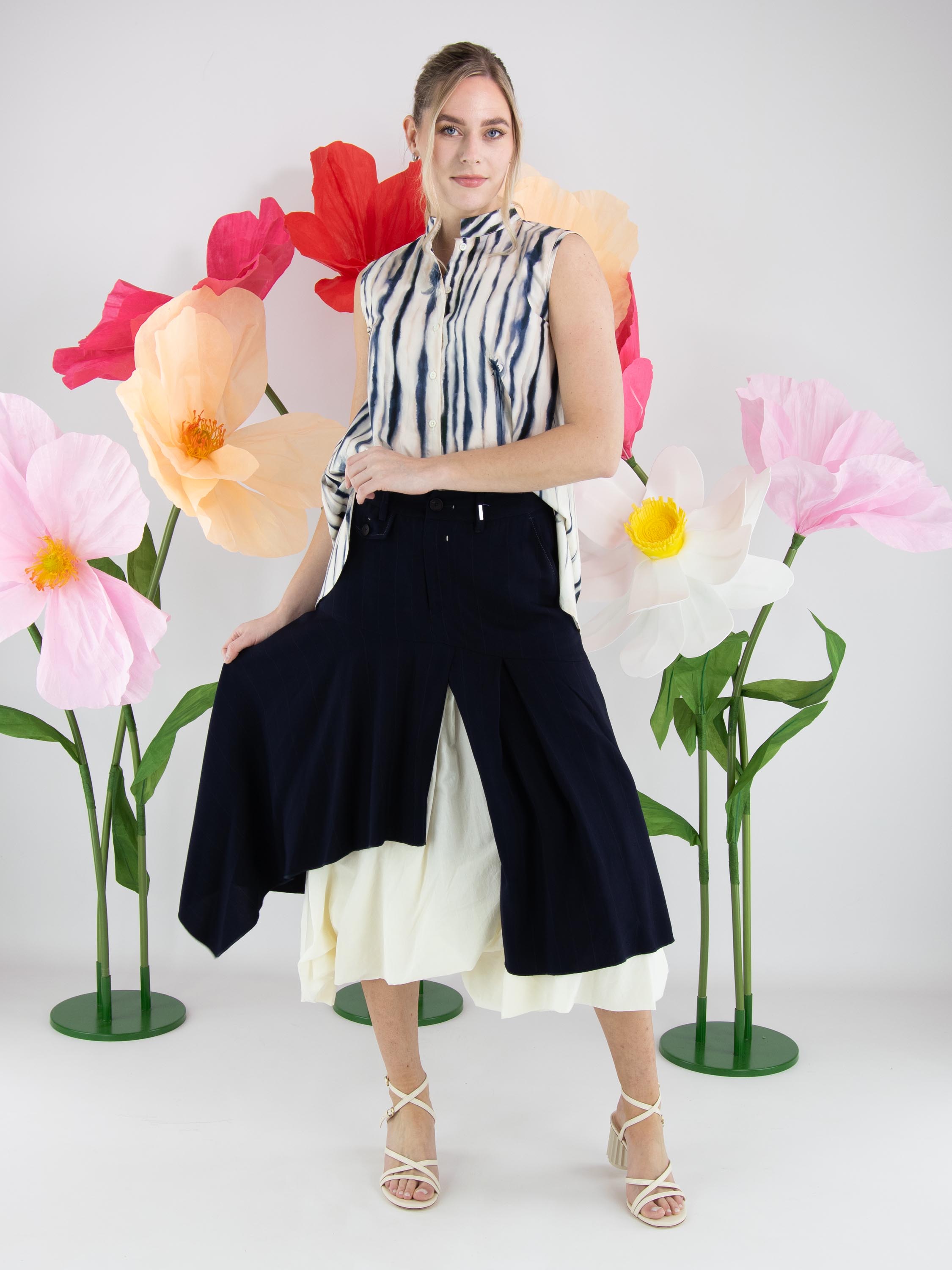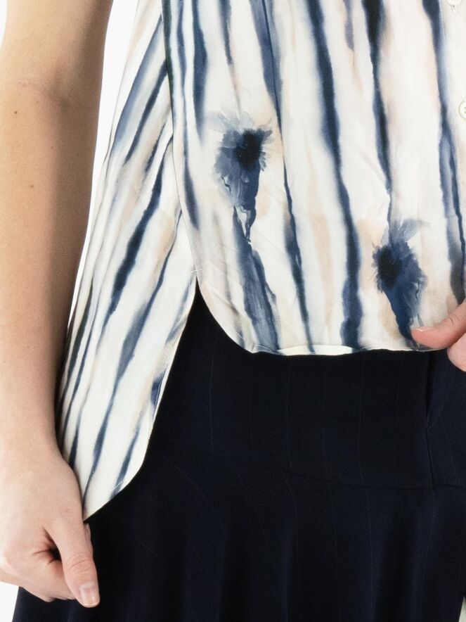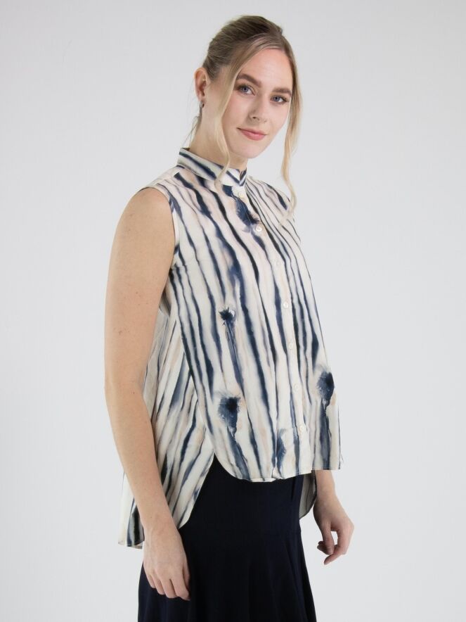Top de High avec un imprimé graphique effet peinture composé de lignes verticales dans plusieurs nuances de bleu sur fond blanc crème. Doté d’une fermeture boutonnée et d’une coupe légèrement évasée en ligne A, il offre une silhouette fluide et contemporaine. Ce top de créateur exclusif peut être lavé à 30 degrés.