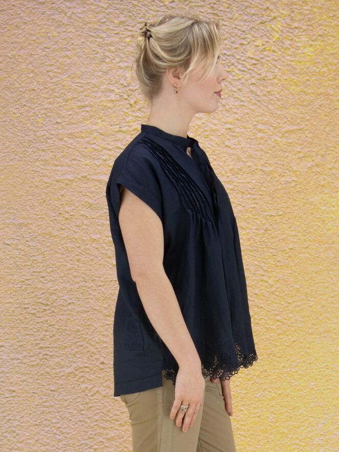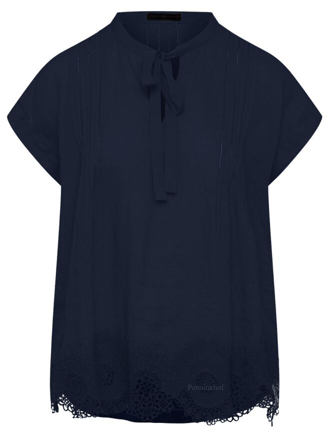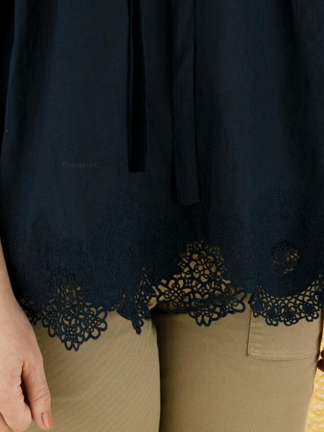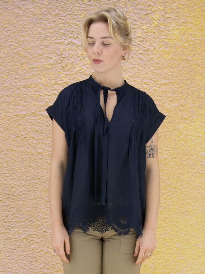 Top à mancherons de la marque High, de couleur bleu marine. Son petit col debout s'étend en rubans à nouer sur le devant, avec une ouverture en V centrale. A partir des épaules, des nervures multiples verticales alternent avec des applications de broderie. D'autres plis sont présents sur le haut du dos. A l'avant, le bas est orné d'une large bordure en dentelle. Lavage à la main.