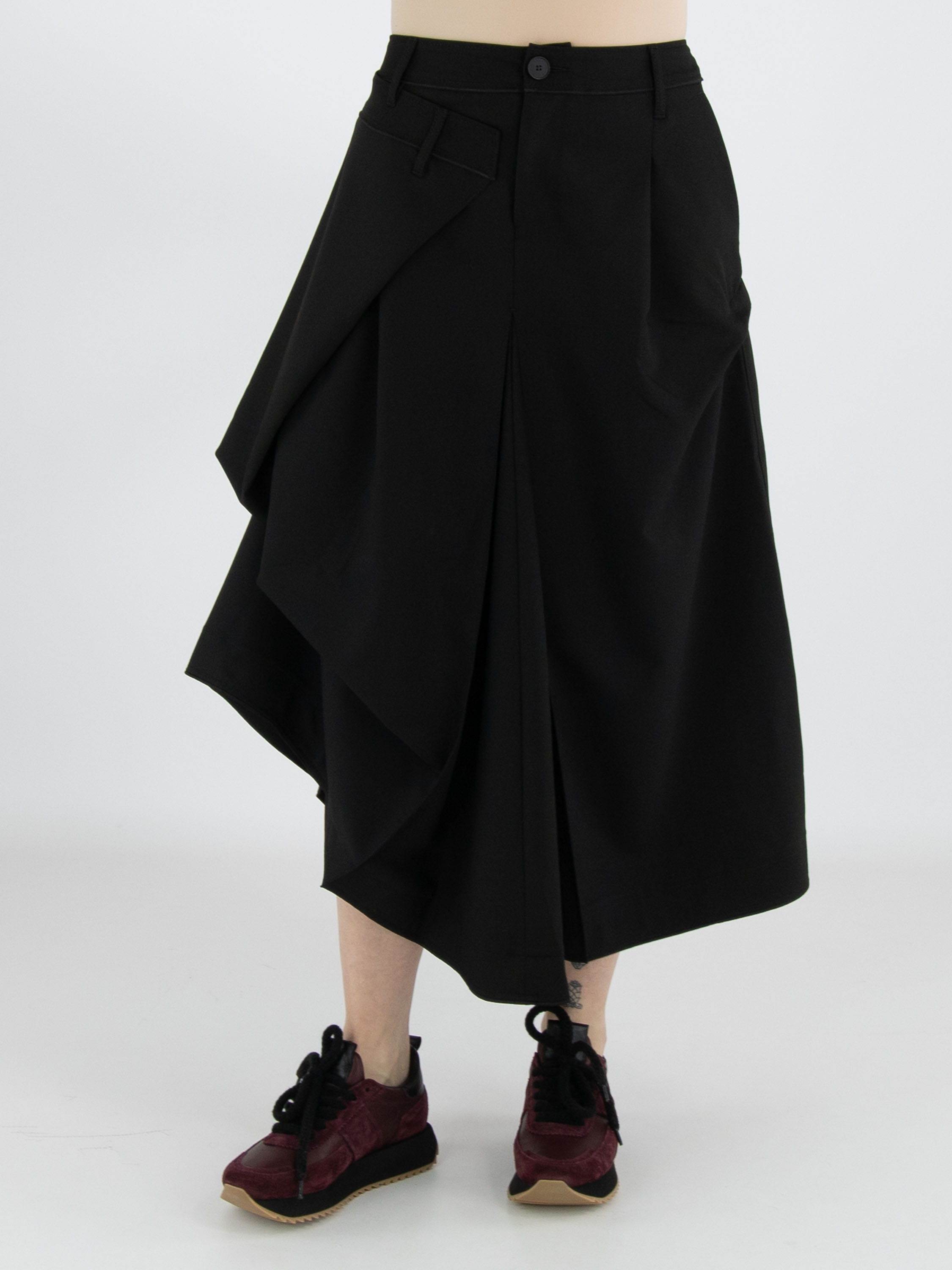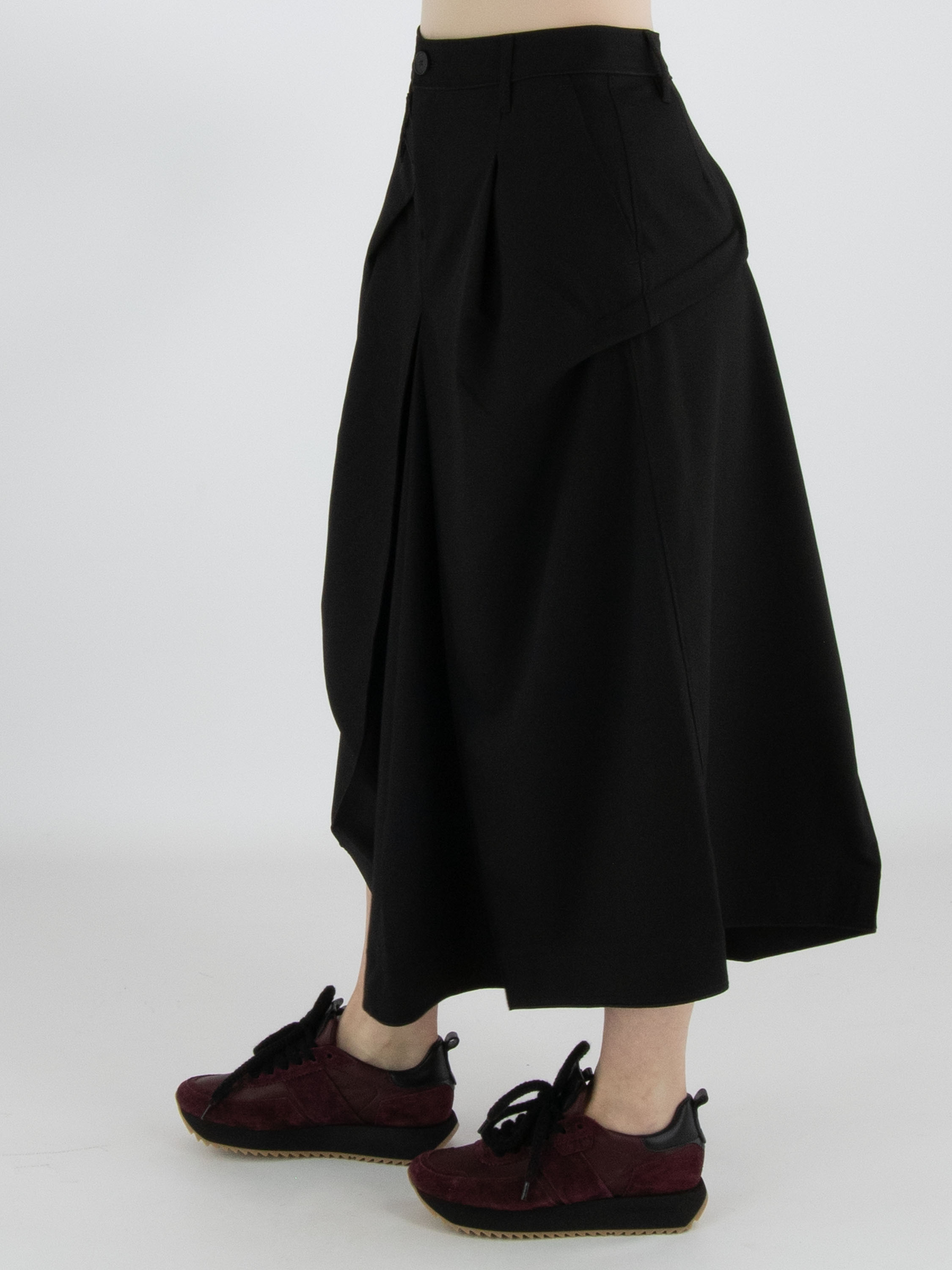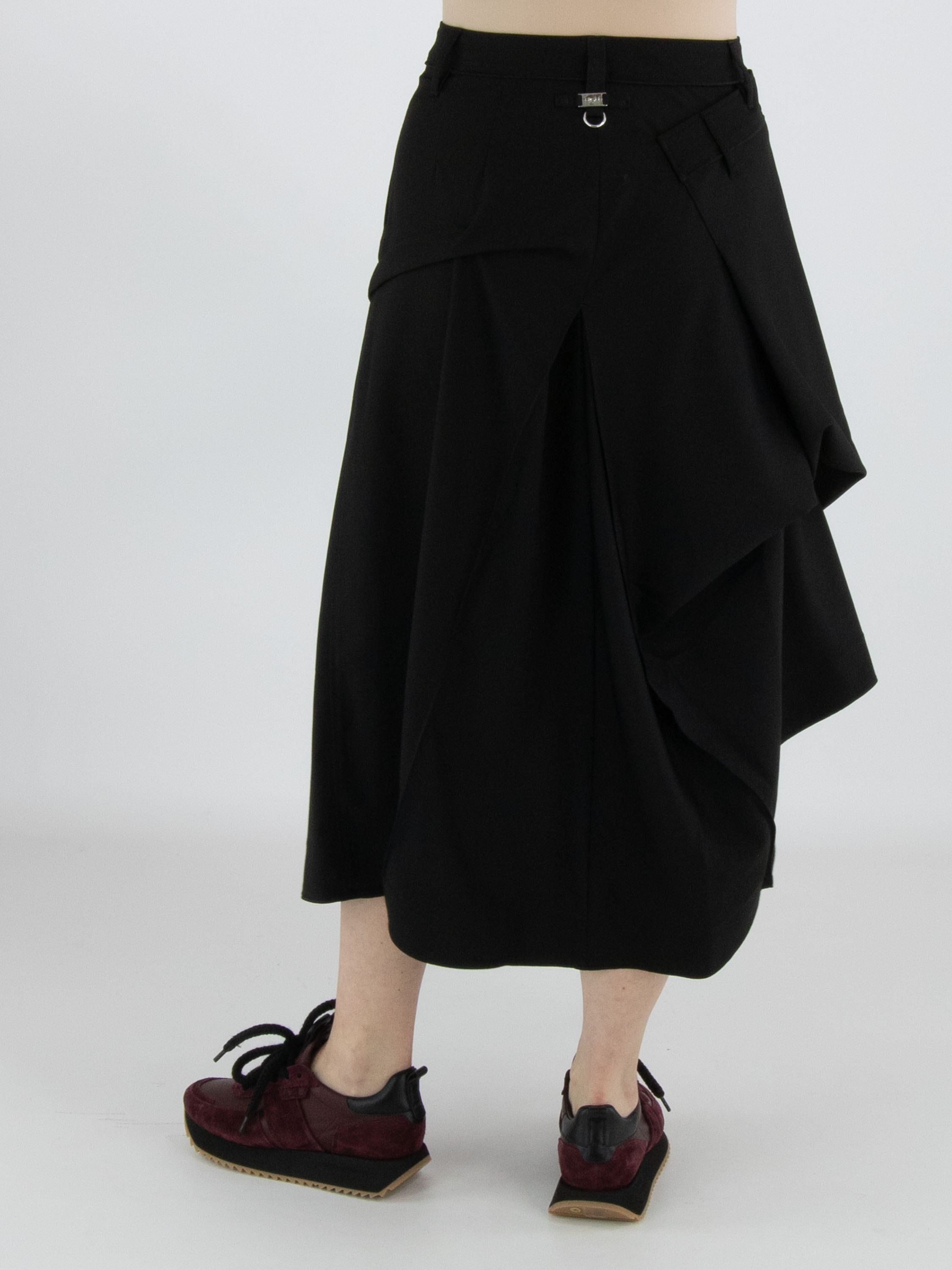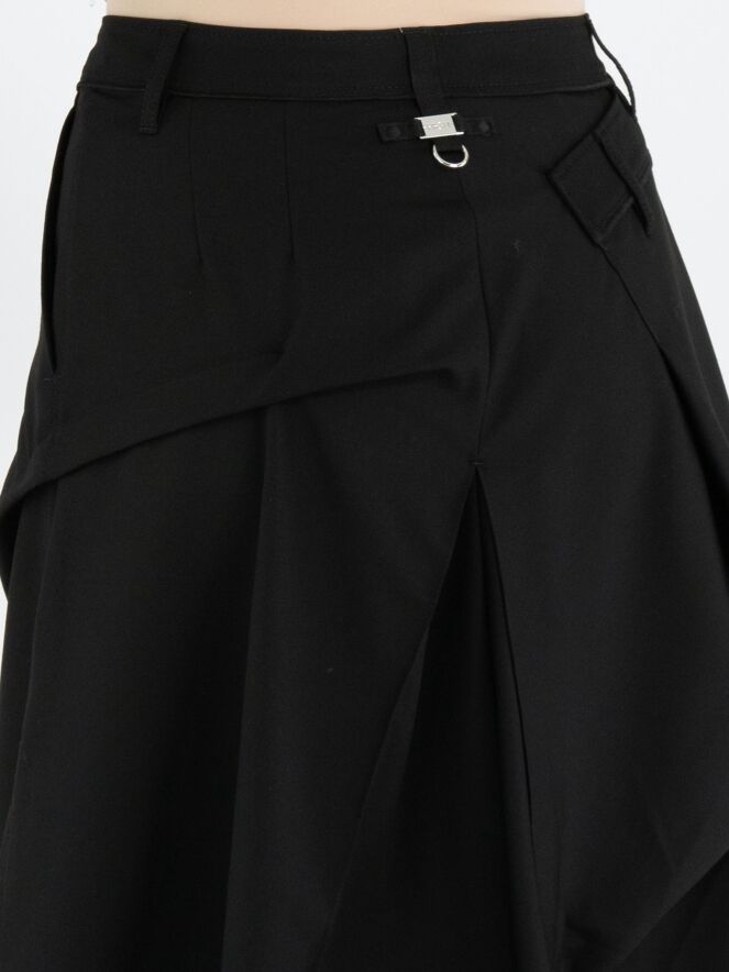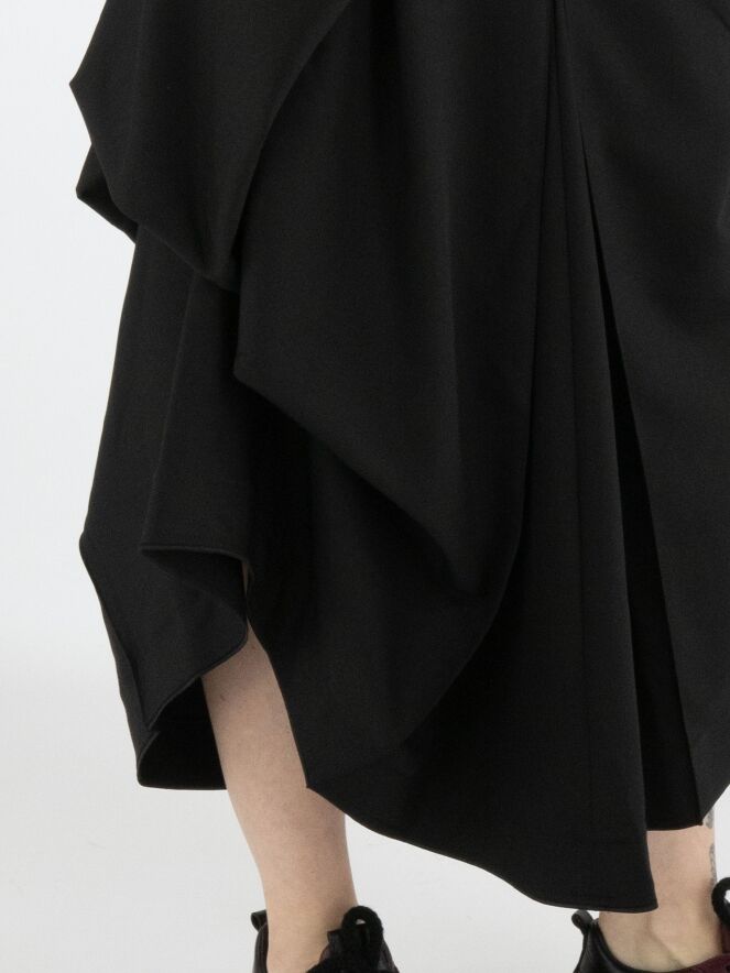 Une jupe de High Tech en noir. Sous la taille, sur le devant droit, se trouve un pli croisé qui se prolonge vers l’arrière. Au centre de l’avant et du dos, sous la hanche, un plissé se forme à partir de la couture centrale. À hauteur de la hanche, sur le côté gauche, le tissu est fixé, créant un effet plissé supplémentaire. La jupe possède une poche fendue sur le côté gauche. Cette jupe peut être lavée à la main.