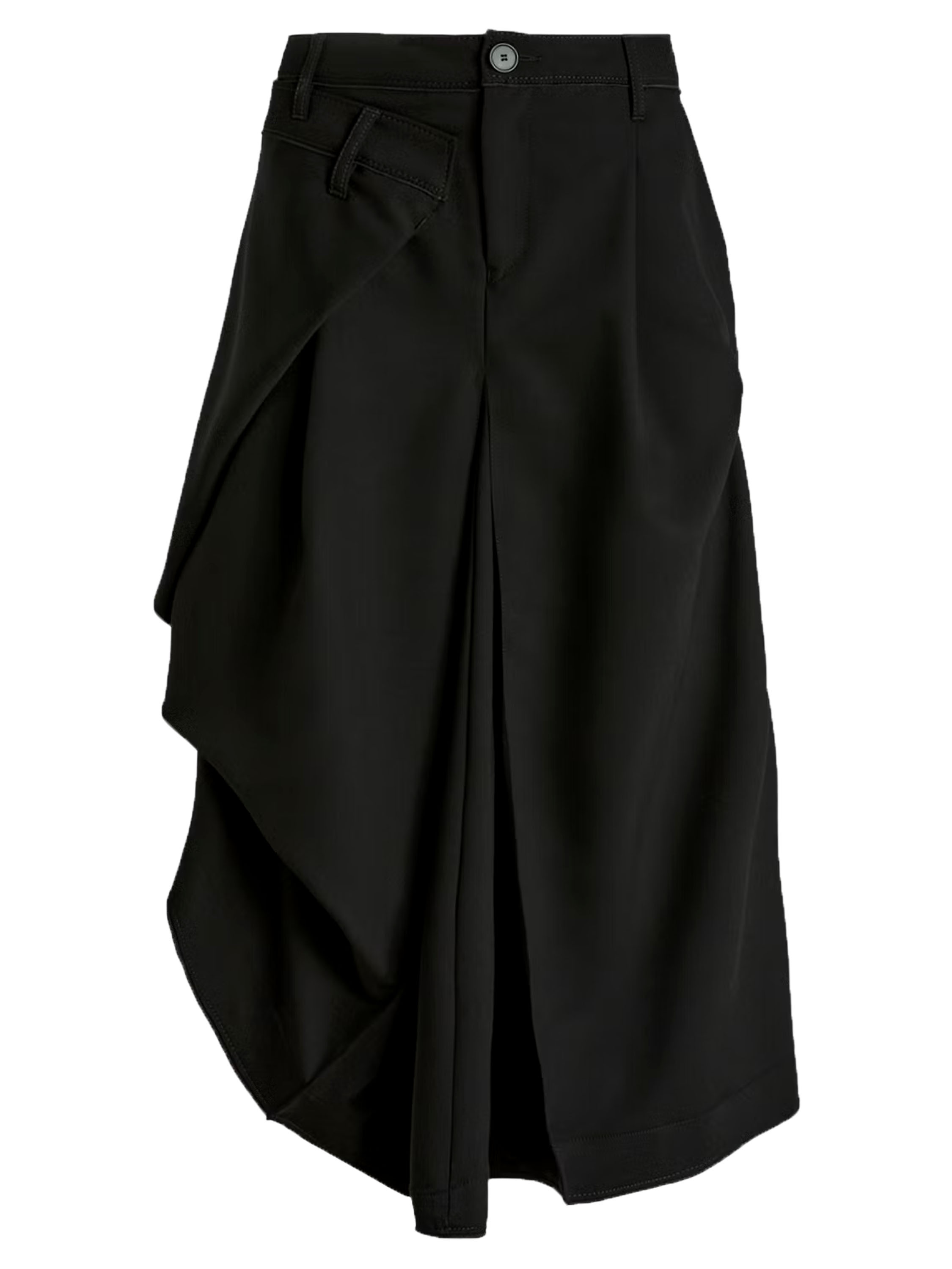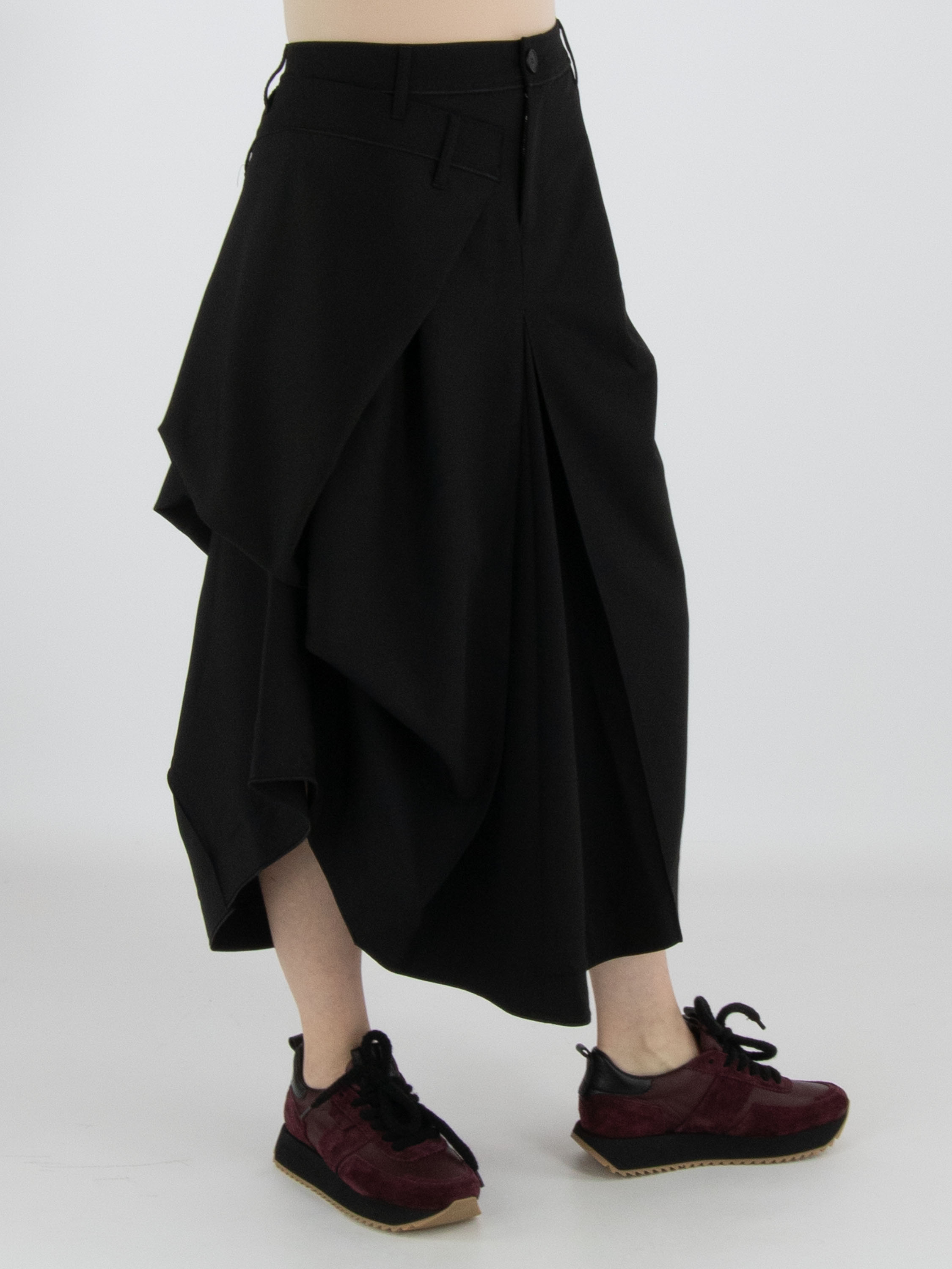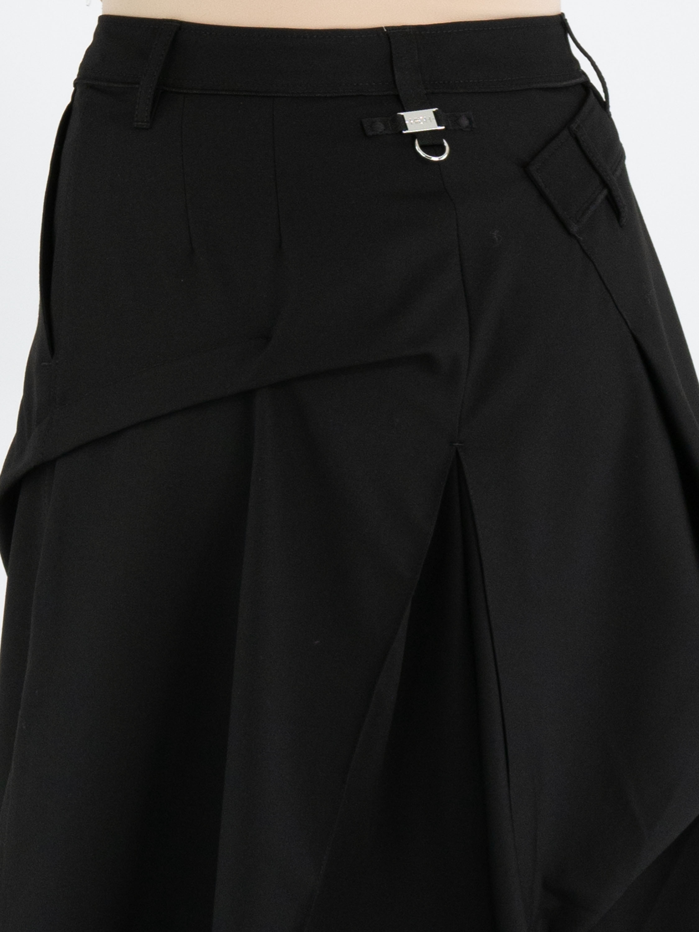 Une jupe de High Tech en noir. Sous la taille, sur le devant droit, se trouve un pli croisé qui se prolonge vers l’arrière. Au centre de l’avant et du dos, sous la hanche, un plissé se forme à partir de la couture centrale. À hauteur de la hanche, sur le côté gauche, le tissu est fixé, créant un effet plissé supplémentaire. La jupe possède une poche fendue sur le côté gauche. Cette jupe peut être lavée à la main.