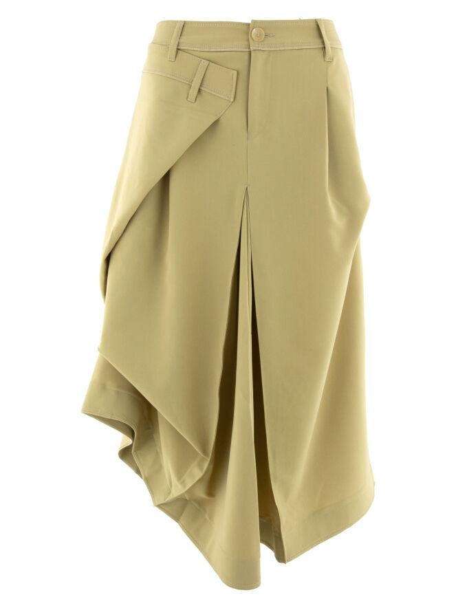 Une jupe de High Tech de couleur jaune moutarde. Sous la taille, sur le devant droit, se trouve un pli croisé qui se prolonge vers l’arrière. Au centre de l’avant et de l’arrière, sous la hanche, des plis se forment à partir de la couture centrale. À hauteur de hanche sur le côté gauche, le tissu est fixé, créant un effet plissé supplémentaire. La jupe possède une poche fendue sur le côté gauche. Cette jupe peut être lavée à la main.
