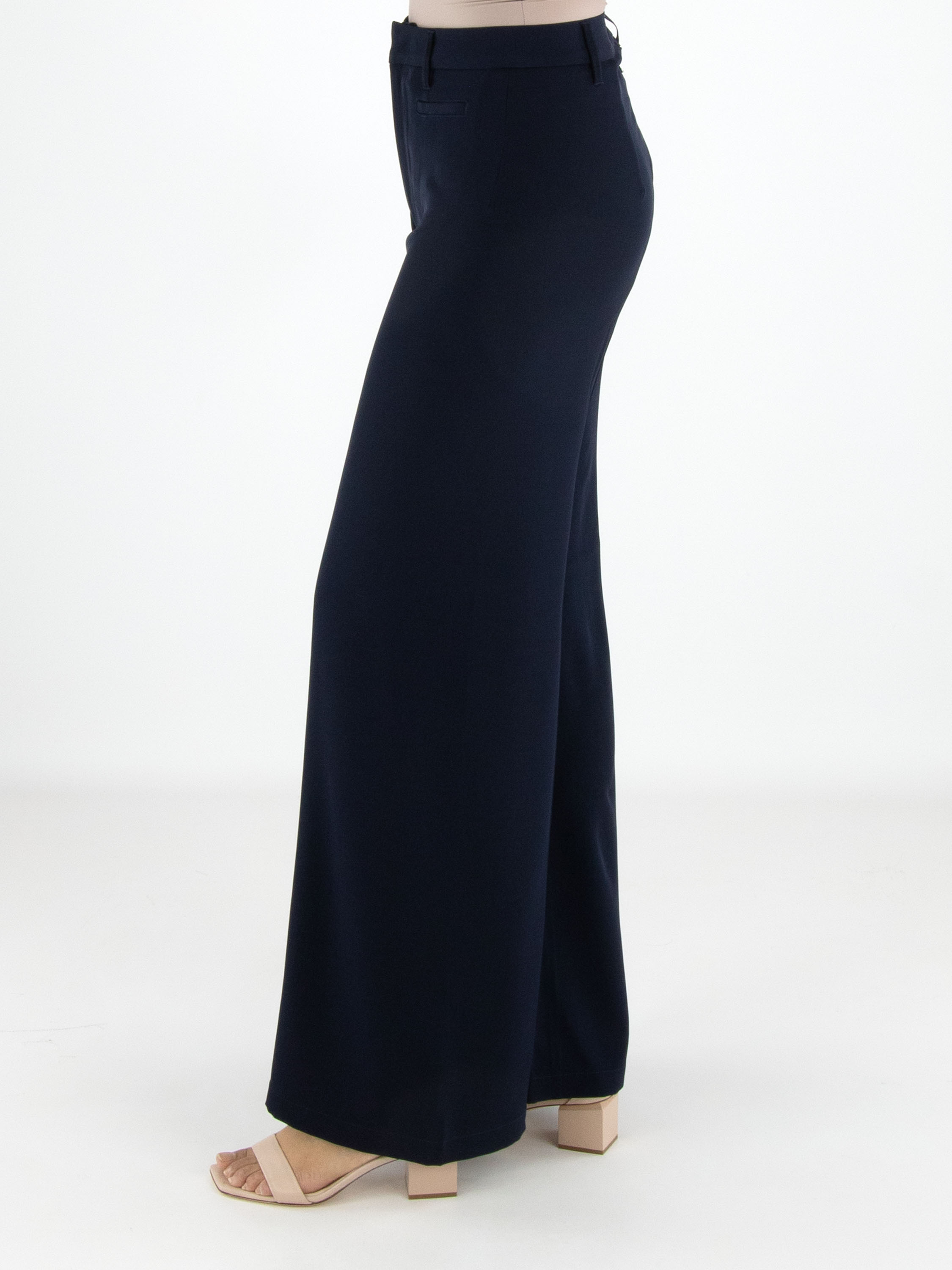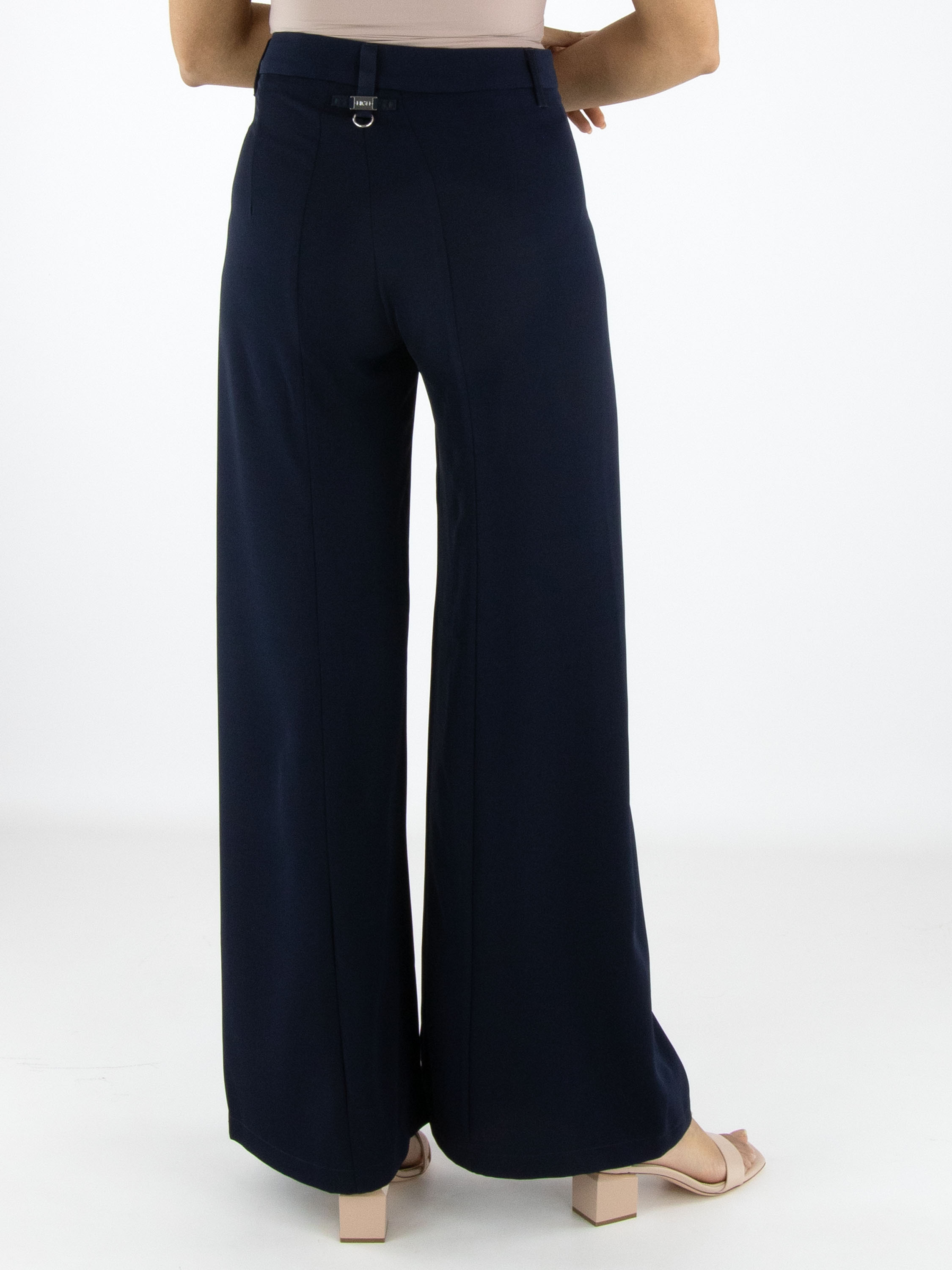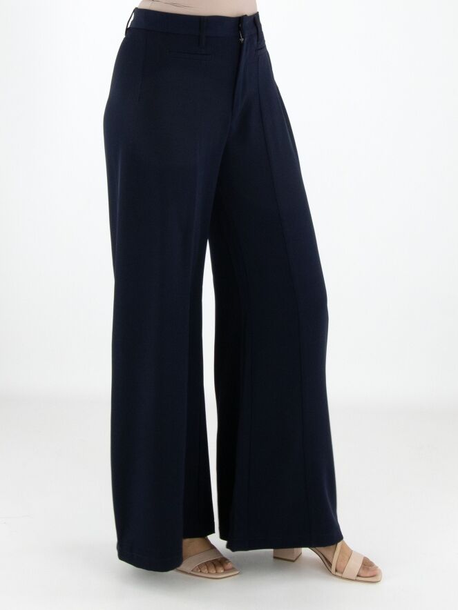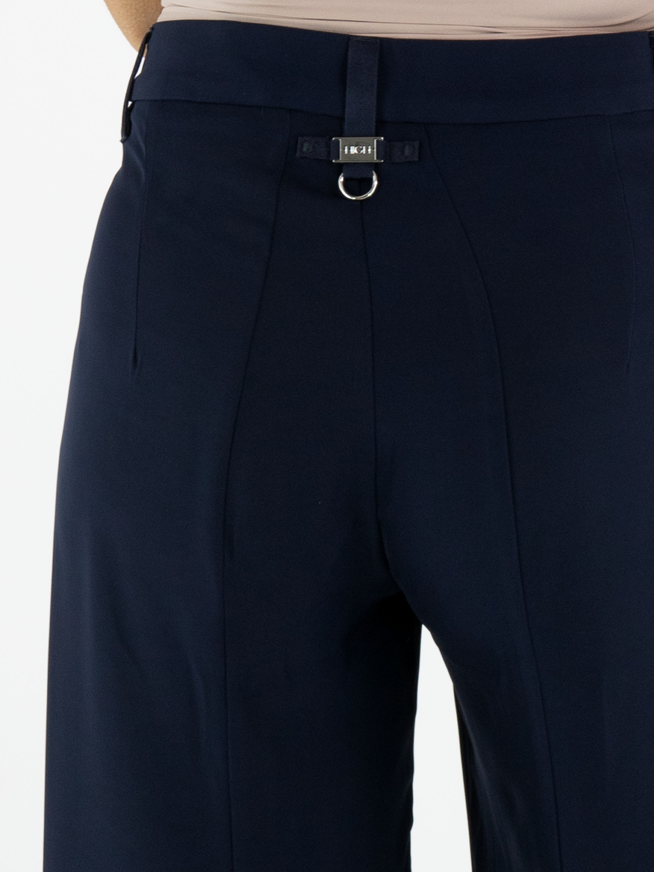 Pantalon large de High dans une élégante teinte bleu marine. À l’avant, juste sous la taille, deux poches décoratives apportent un détail distinctif au modèle. Une couture centrale parcourt toute la longueur de l’avant des jambes, créant une silhouette moderne et élancée. Ce pantalon ne doit pas être lavé.